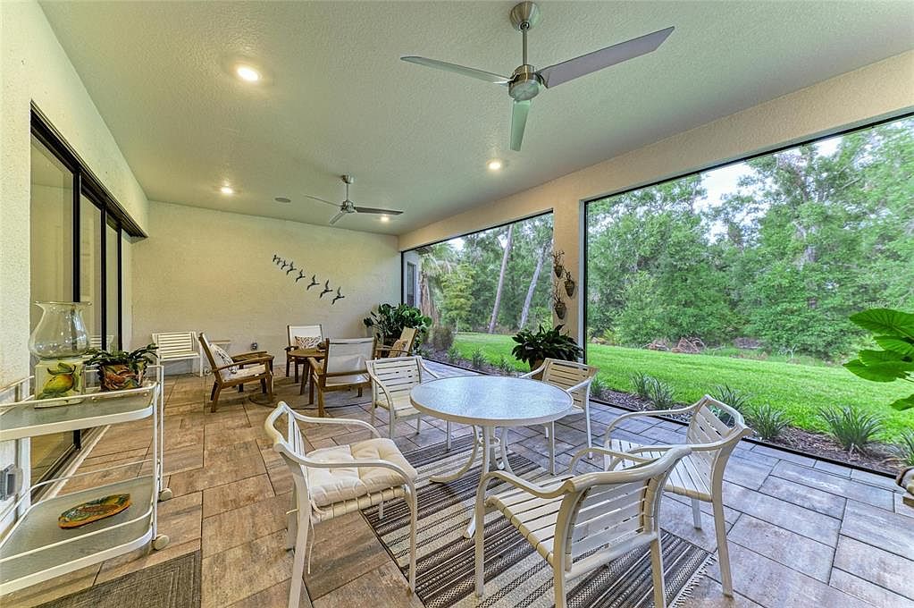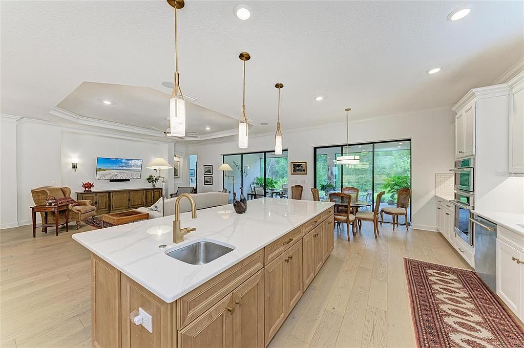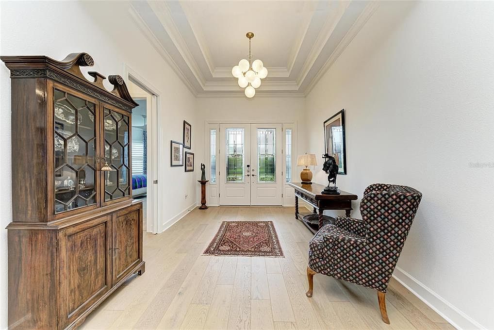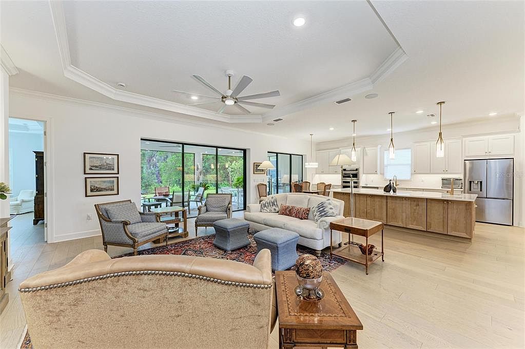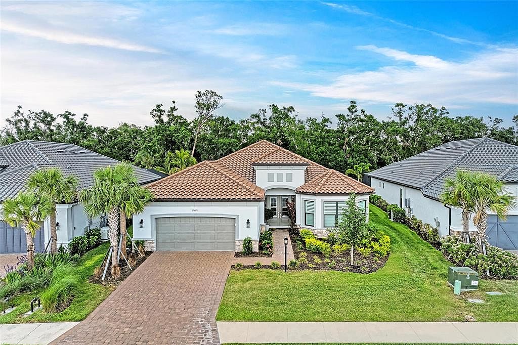Welcome to Elevated Florida Living in Esplanade – Azario at Lakewood Ranch! Experience the perfect blend of elegance, comfort, and privacy in this meticulously crafted 2023-built home offering 3 bedrooms, 3 bathrooms, a dedicated den/office, and a rare tandem 3-car garage—all thoughtfully designed with timeless upgrades and modern conveniences. From the moment you enter, you'll be captivated by the refined ambiance created by engineered wood flooring throughout (with plush carpeting in Suites 2 and 3), soaring tray ceilings adorned with crown molding, and custom upgraded lighting that complements every space. Each of the three spacious bedrooms features its own ensuite bath, offering privacy and comfort for family and guests alike. Bay windows in two bedrooms flood the rooms with natural light and add architectural charm. The home’s expansive interior showcases 8’ solid-core doors, B&G interior shutters, and soft-close cabinetry with upgraded shelving. The gourmet kitchen is a culinary dream, boasting quartz countertops, stainless steel appliances, a smart faucet, and a large kitchen island with an additional prep sink. The natural gas range is complemented by an upgraded vent hood, while designer plumbing fixtures elevate the entire space. The casual dining extension flows effortlessly into the great room—enhanced by a high-quality speaker system that continues into the office and rear lanai, perfect for entertaining or relaxing in style. Step outside to your serene, screened-in lanai with a built-in summer kitchen, ideal for alfresco dining or hosting guests against a backdrop of Florida’s natural beauty. The home backs up to a heavily wooded preserve, offering rare and sought-after privacy. Silent ceiling fans are thoughtfully placed throughout all living areas, including the lanai, to ensure year-round comfort. The garage features an acrylic-sealed floor and an enlarged tandem space to accommodate extra storage or your favorite hobby. Living in Esplanade – Azario means access to an unparalleled lifestyle, including: A private, championship 18-hole golf course Onsite golf pro shop Gated community for added security Elegant clubhouse and breakfast bar Resort-style pool, spa, and poolside Bahama Bar Culinary Center with signature dining experiences State-of-the-art fitness and wellness facilities, including a full-service spa and hair salon Tennis and pickleball courts, dog park, and scenic walking/biking trails Full-time Lifestyle & Activity Manager to curate events and social connections Whether you're enjoying a peaceful morning in your lanai or an afternoon on the golf course, this home is the epitome of luxury living in one of Lakewood Ranch’s most sought-after communities. Don’t miss the opportunity to make this move-in-ready, designer-detailed home yours—schedule your private tour today!