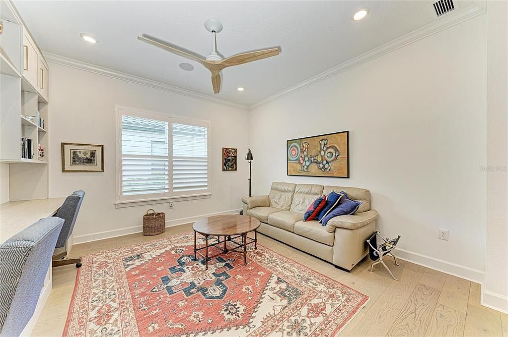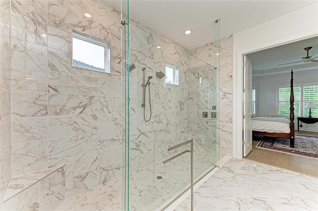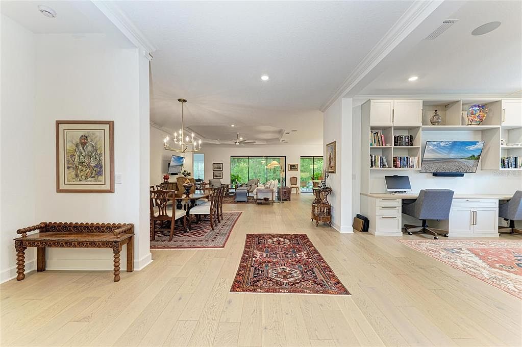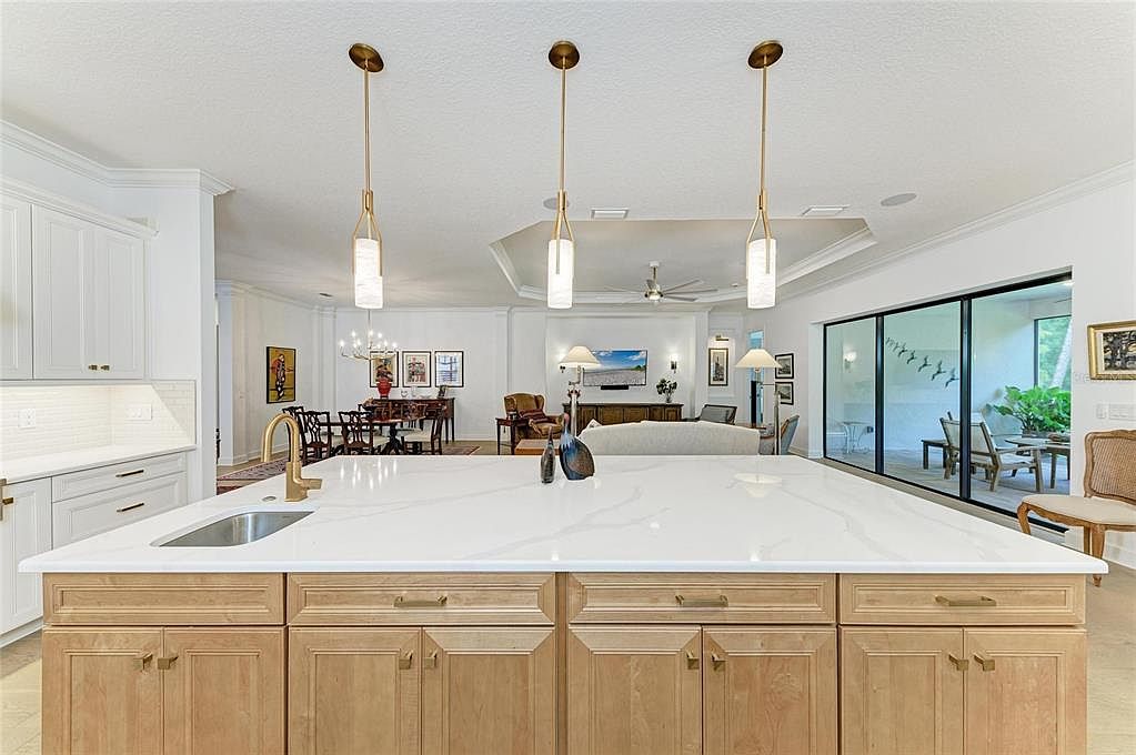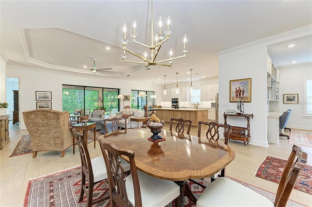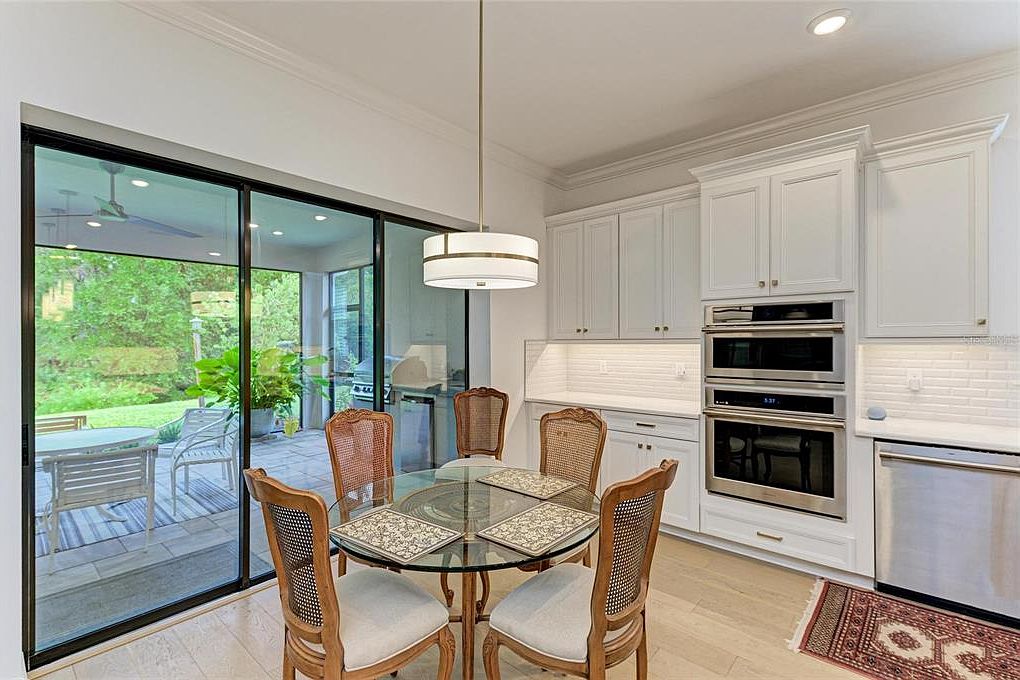 Welcome to Elevated Florida Living in Esplanade – Azario at Lakewood Ranch! Experience the perfect blend of elegance, comfort, and privacy in this meticulously crafted 2023-built home offering 3 bedrooms, 3 bathrooms, a dedicated den/office, and a rare tandem 3-car garage—all thoughtfully designed with timeless upgrades and modern conveniences. From the moment you enter, you'll be captivated by the refined ambiance created by engineered wood flooring throughout (with plush carpeting in Suites 2 and 3), soaring tray ceilings adorned with crown molding, and custom upgraded lighting that complements every space. Each of the three spacious bedrooms features its own ensuite bath, offering privacy and comfort for family and guests alike. Bay windows in two bedrooms flood the rooms with natural light and add architectural charm. The home’s expansive interior showcases 8’ solid-core doors, B&G interior shutters, and soft-close cabinetry with upgraded shelving. The gourmet kitchen is a culinary dream, boasting quartz countertops, stainless steel appliances, a smart faucet, and a large kitchen island with an additional prep sink. The natural gas range is complemented by an upgraded vent hood, while designer plumbing fixtures elevate the entire space. The casual dining extension flows effortlessly into the great room—enhanced by a high-quality speaker system that continues into the office and rear lanai, perfect for entertaining or relaxing in style. Step outside to your serene, screened-in lanai with a built-in summer kitchen, ideal for alfresco dining or hosting guests against a backdrop of Florida’s natural beauty. The home backs up to a heavily wooded preserve, offering rare and sought-after privacy. Silent ceiling fans are thoughtfully placed throughout all living areas, including the lanai, to ensure year-round comfort. The garage features an acrylic-sealed floor and an enlarged tandem space to accommodate extra storage or your favorite hobby. Living in Esplanade – Azario means access to an unparalleled lifestyle, including: A private, championship 18-hole golf course Onsite golf pro shop Gated community for added security Elegant clubhouse and breakfast bar Resort-style pool, spa, and poolside Bahama Bar Culinary Center with signature dining experiences State-of-the-art fitness and wellness facilities, including a full-service spa and hair salon Tennis and pickleball courts, dog park, and scenic walking/biking trails Full-time Lifestyle & Activity Manager to curate events and social connections Whether you're enjoying a peaceful morning in your lanai or an afternoon on the golf course, this home is the epitome of luxury living in one of Lakewood Ranch’s most sought-after communities. Don’t miss the opportunity to make this move-in-ready, designer-detailed home yours—schedule your private tour today!