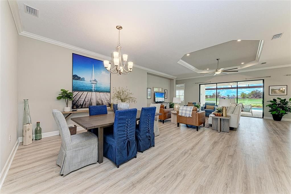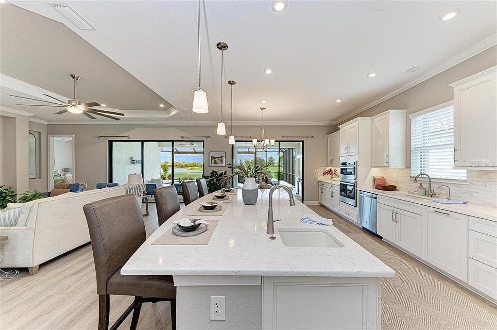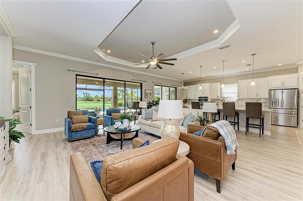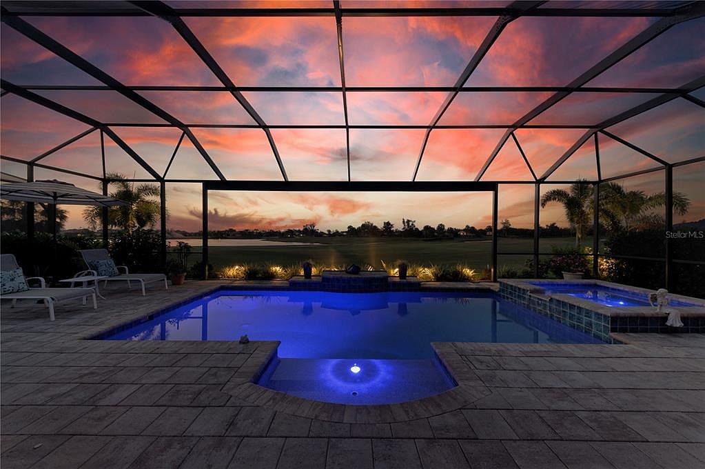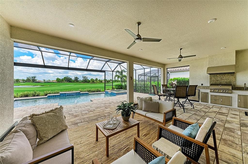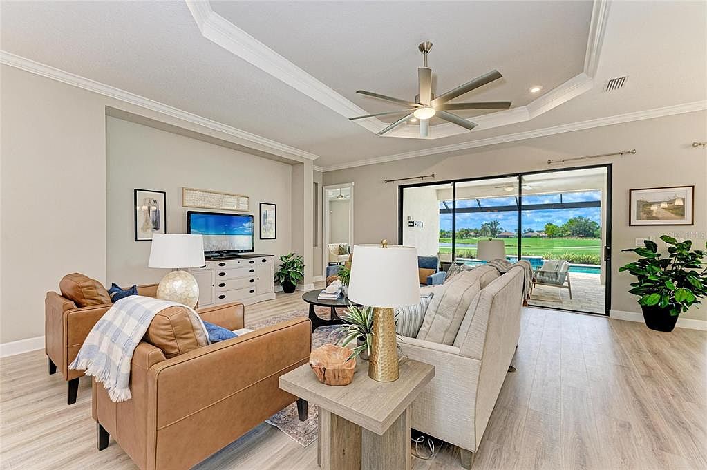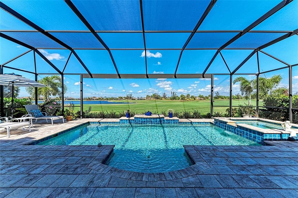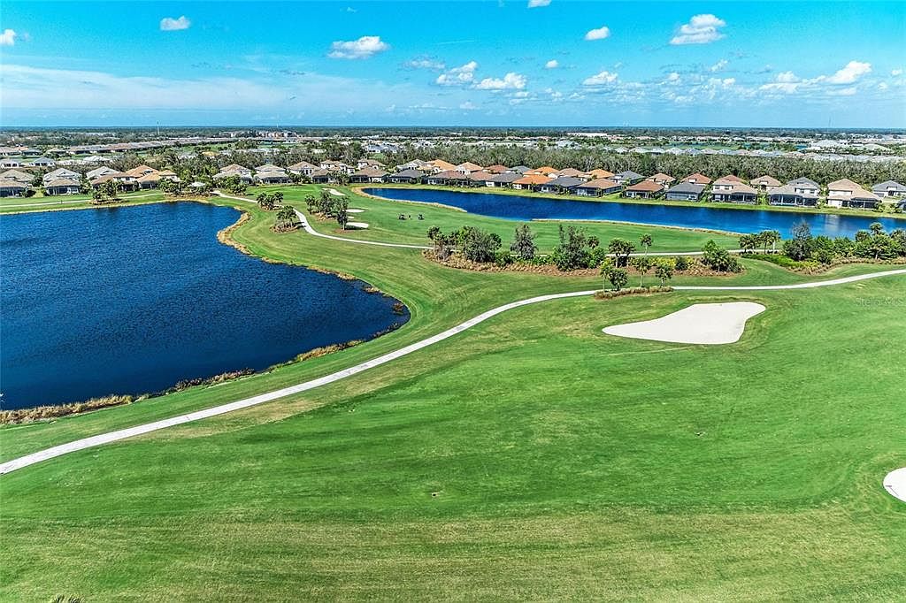 Welcome to luxury living at its finest in this exquisite Pallazio model home in Esplanade at Azario in Lakewood Ranch. Featuring 3 bedrooms, 3 bathrooms, a private office/den, and breathtaking views of the signature fairway of the 15th hole and lake views. Nestled within the highly desirable Esplanade at Azario community in Lakewood Ranch, this residence is designed for both elegance and comfort. Step through the elegant etched-glass front door into an expansive open floor plan boasting a spacious great room and dining area, soaring tray ceilings, and crown molding throughout. The gourmet kitchen is a dream for entertainers and chefs alike, featuring two sinks, state-of-the-art appliances, a large center island, and panoramic views of the heated pool, spa, golf course, and lake—framed beautifully by a Clearview pool cage. The primary suite offers a peaceful retreat, complete with tray ceiling, luxurious ensuite bath with a garden tub, walk-in shower, dual vanities, and a private water closet. A custom walk-in closet with built-in storage ensures effortless organization. Designed with privacy in mind, this split floor plan provides ensuite baths for each bedroom. The private den with double pocket doors offers versatility as a home office or relaxation space, with direct access to an adjoining full bathroom. Additional highlights include: Extended garage Kevlar hurricane screen and impact windows in the front Whole-house generator Covered lanai with resort-style heated pool and spa Unobstructed golf and lake views All golf included at no additional cost except for golf carts $28. Esplanade at Azario redefines resort living with world-class amenities, including: A heated resort-style pool State-of-the-art fitness center with aerobic classes Luxury spa offering facials and massages Multiple pickleball, tennis, and bocce ball courts Community walking trails, vitality park, and fire pit The Bahama Bar, a full-service outdoor bar and restaurant The new 15,000-square-foot Culinary Center for upscale dining An 18-hole championship golf course open to members and public tee times Whether you’re looking to relax, stay active, or socialize, this home and its community is the ultimate Florida lifestyle. Don't miss your chance to own a piece of paradise—schedule your private showing today!