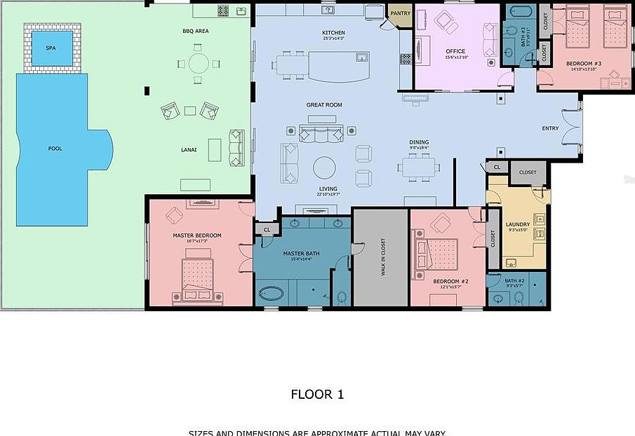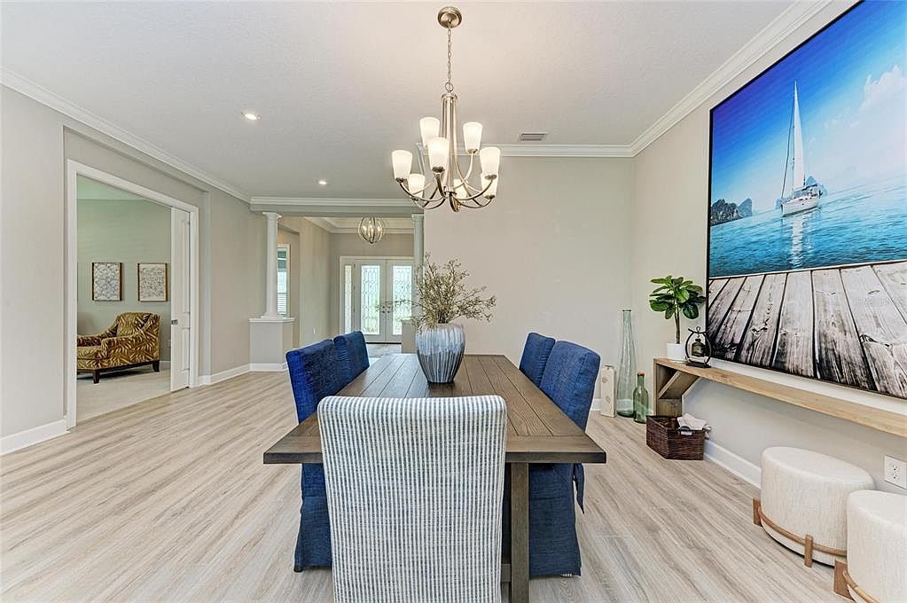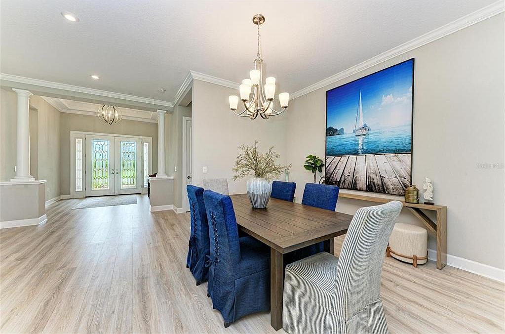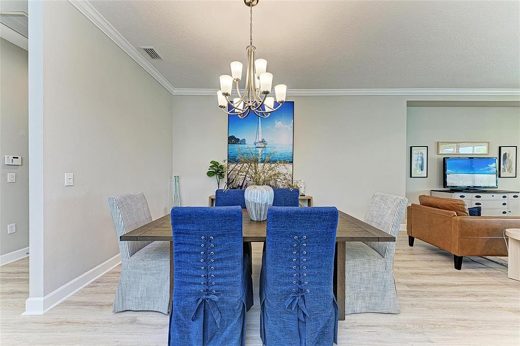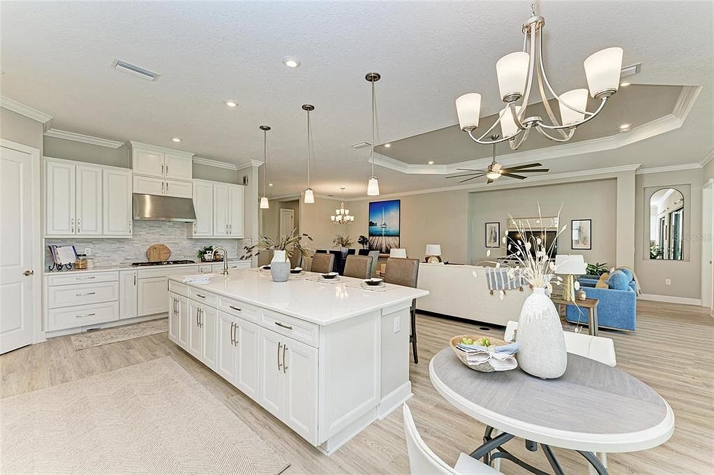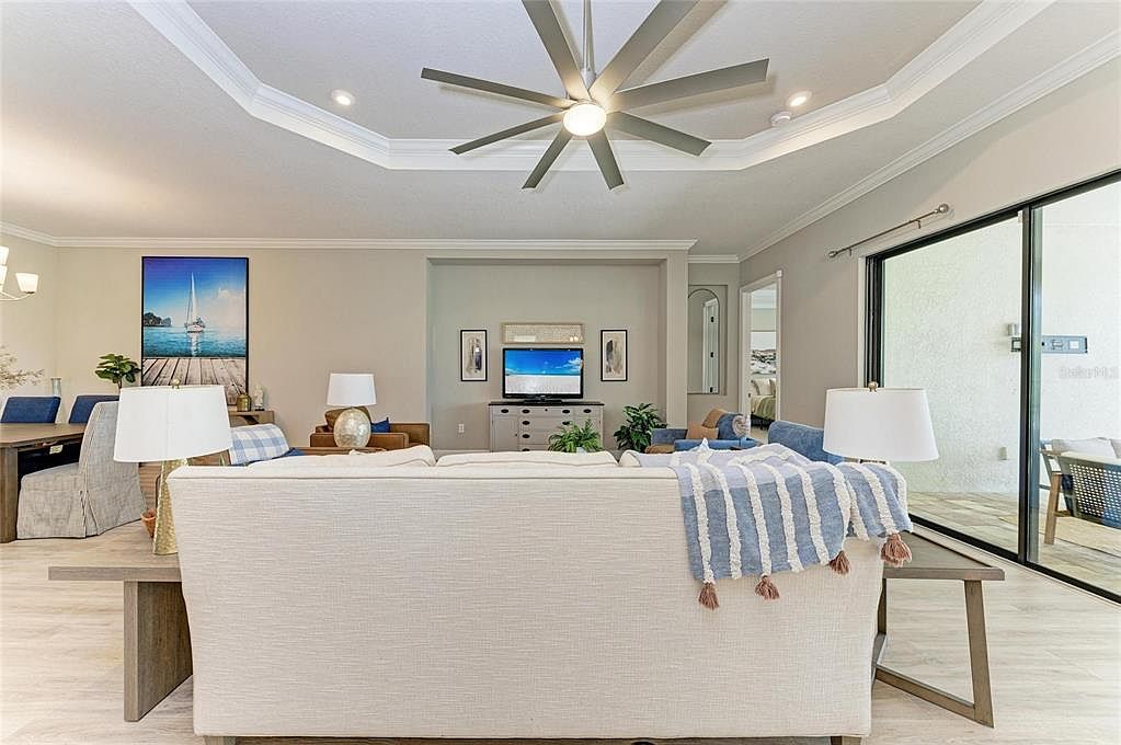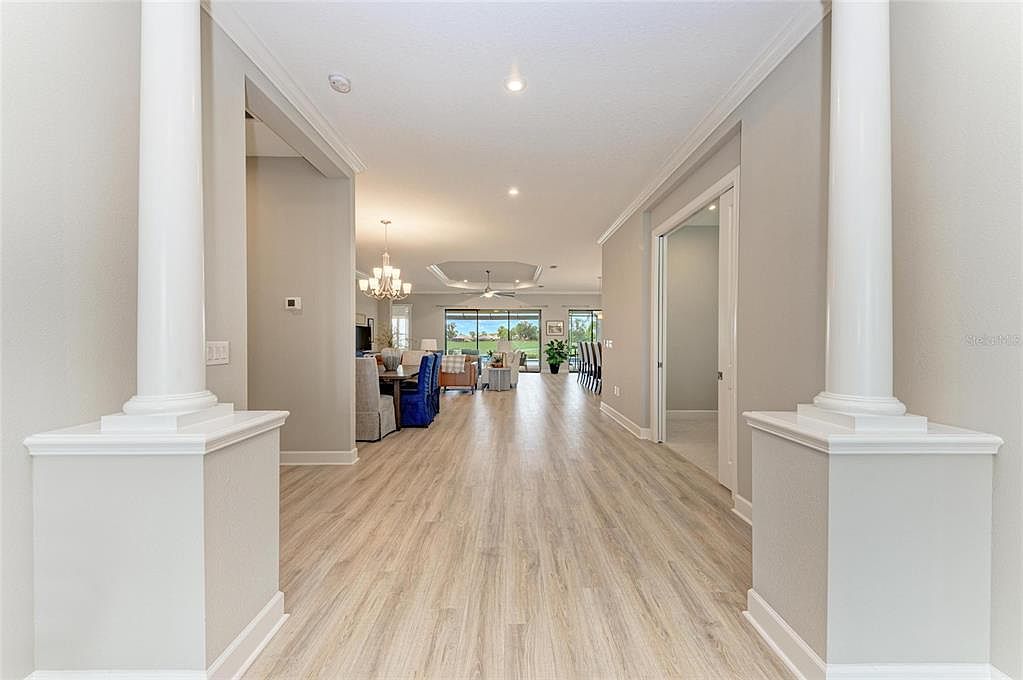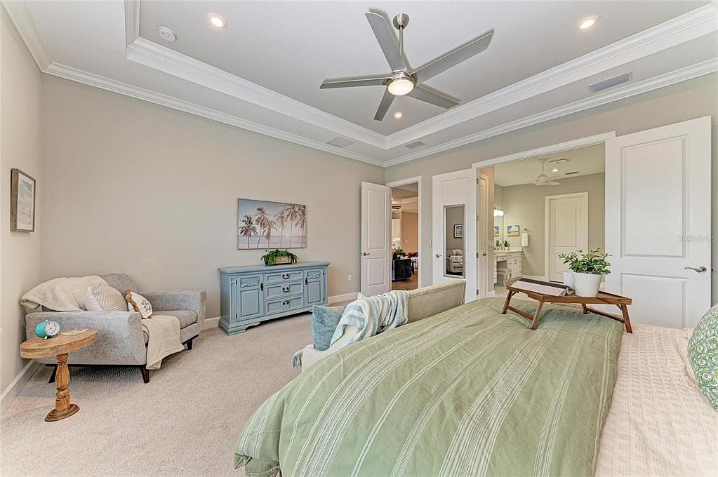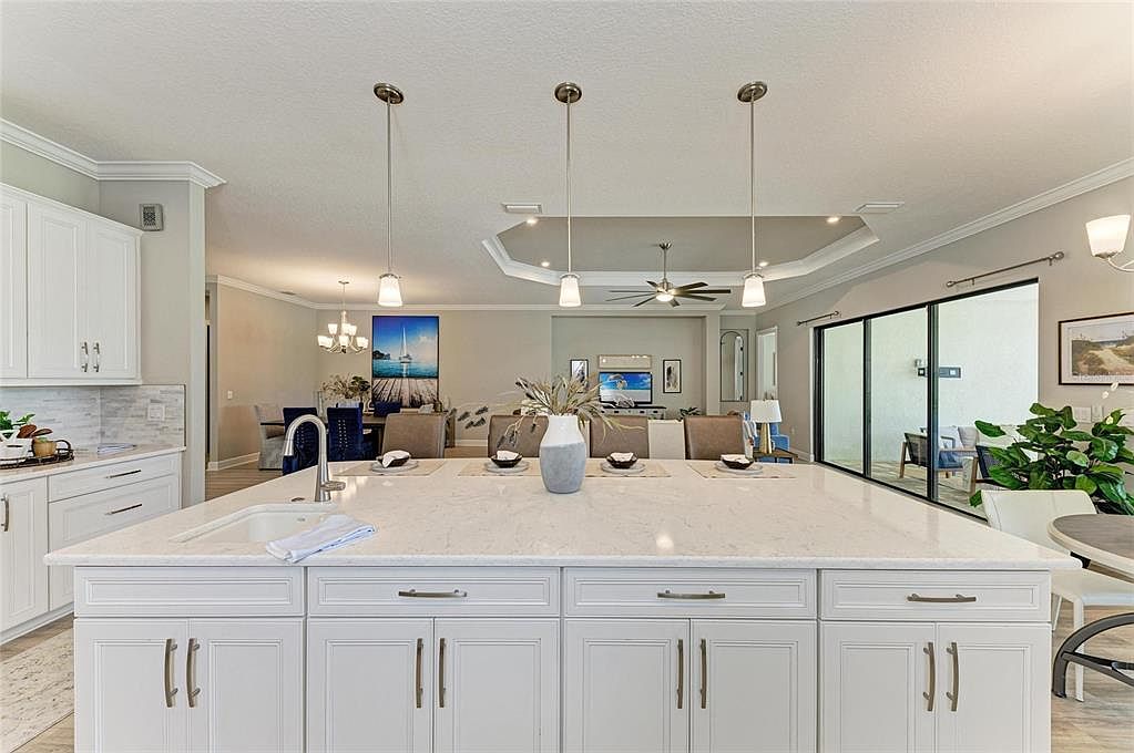 Welcome to luxury living at its finest in this exquisite Pallazio model home in Esplanade at Azario in Lakewood Ranch. Featuring 3 bedrooms, 3 bathrooms, a private office/den, and breathtaking views of the signature fairway of the 15th hole and lake views. Nestled within the highly desirable Esplanade at Azario community in Lakewood Ranch, this residence is designed for both elegance and comfort. Step through the elegant etched-glass front door into an expansive open floor plan boasting a spacious great room and dining area, soaring tray ceilings, and crown molding throughout. The gourmet kitchen is a dream for entertainers and chefs alike, featuring two sinks, state-of-the-art appliances, a large center island, and panoramic views of the heated pool, spa, golf course, and lake—framed beautifully by a Clearview pool cage. The primary suite offers a peaceful retreat, complete with tray ceiling, luxurious ensuite bath with a garden tub, walk-in shower, dual vanities, and a private water closet. A custom walk-in closet with built-in storage ensures effortless organization. Designed with privacy in mind, this split floor plan provides ensuite baths for each bedroom. The private den with double pocket doors offers versatility as a home office or relaxation space, with direct access to an adjoining full bathroom. Additional highlights include: Extended garage Kevlar hurricane screen and impact windows in the front Whole-house generator Covered lanai with resort-style heated pool and spa Unobstructed golf and lake views All golf included at no additional cost except for golf carts $28. Esplanade at Azario redefines resort living with world-class amenities, including: A heated resort-style pool State-of-the-art fitness center with aerobic classes Luxury spa offering facials and massages Multiple pickleball, tennis, and bocce ball courts Community walking trails, vitality park, and fire pit The Bahama Bar, a full-service outdoor bar and restaurant The new 15,000-square-foot Culinary Center for upscale dining An 18-hole championship golf course open to members and public tee times Whether you’re looking to relax, stay active, or socialize, this home and its community is the ultimate Florida lifestyle. Don't miss your chance to own a piece of paradise—schedule your private showing today!