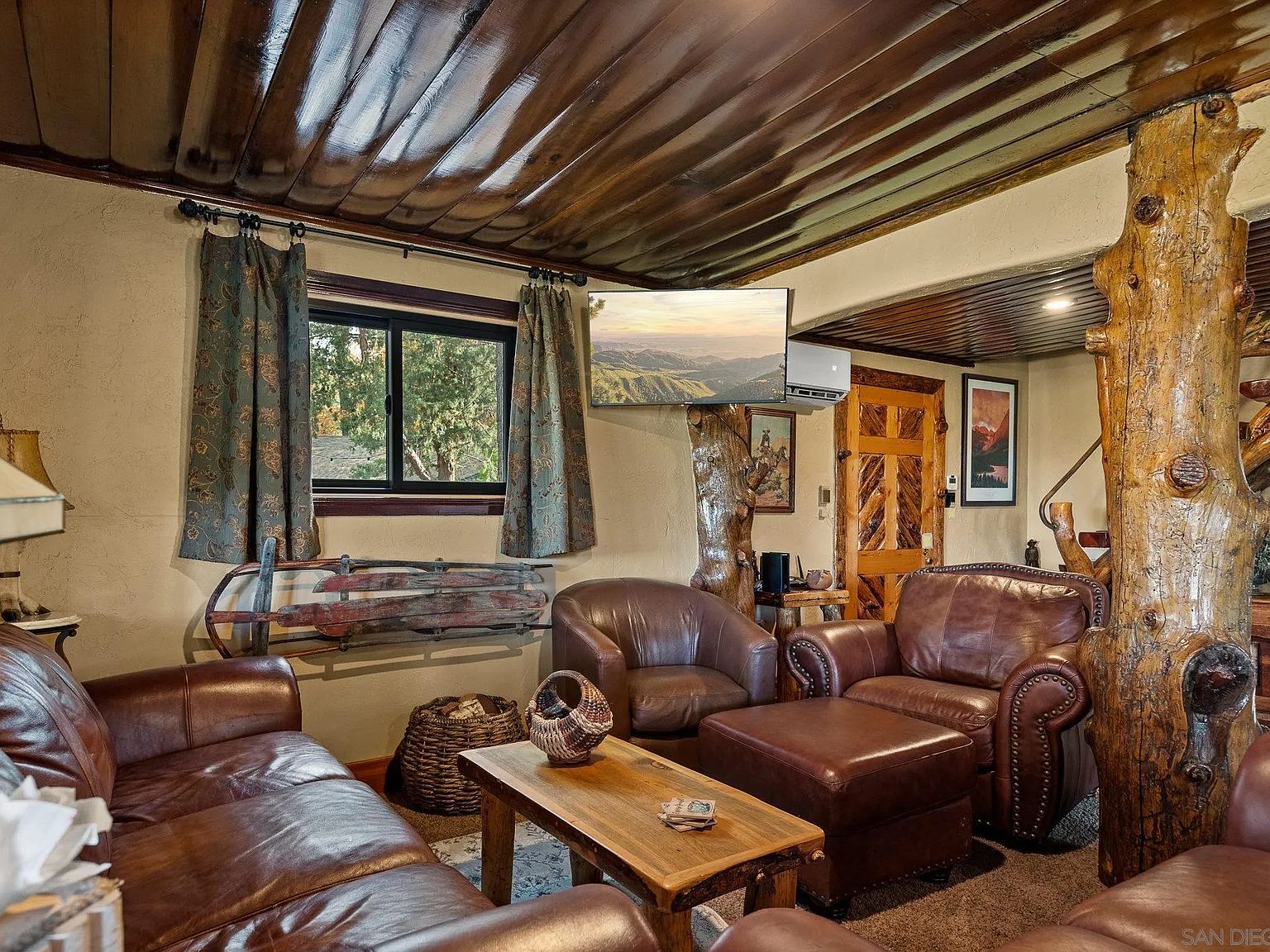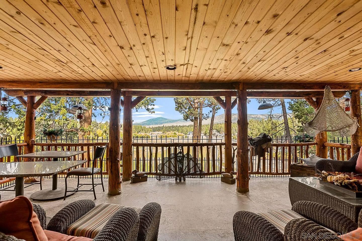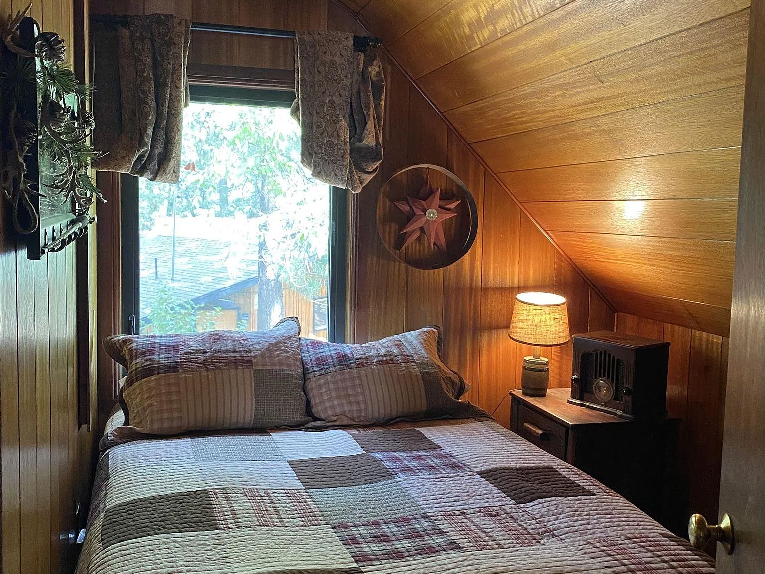 Beautiful log home with an amazing view to the west, located on the 4th T of the Big Bear Golf Course.. This home was built in 1954, much of the home was hand crafted in the very garage it has now.. Then in 2006, the home was given a new life with more of today's amenenties. It is one of the most unique homes you will see in Big Bear today. Main level has one bedroom and bath, living room,dining room and kitchen. Top level has 2 bedrooms with one bath.. With a small adjustment, a 3rd bedroom can be achieved. The lower level bedroom has a full bath, claw foot tub, gas free standing stove, and a small kitchenette. With a little addition to that room, it could be used as a separate livable space. VRBO history for one year, this year will be better. The owners have added many ameneties, including heat and air split units on all levels. Free standing gas fireplace in the lower bedroom/basement aread, 90% of the windows are new dual pane, new large hot water heater, new spa as of 2024 located outside the front door. The lot is oversized with large wood decks on both sides of the home.. Commerial lighting lights up the large trees at night. Part of the roof was replaced and the roof is in good condition. New dishwasher as of 2023. New metal and glass door leads into the mudroom with combo lock. The garage has also been crafted with wood doors and elk handles on all of them. Plenty of storage in the garage and in the attic above the garage. Both refrigerators, kitchen and garage stay.. Garage door has auto opener. 2 additional concrete parking spaces were added so 4 cars fit comfortably on the property. The lighting fixture above the dining table and the one in the upstairs hallway are works of art.. This is a unique, old school big bear cabin. And, your kids can sled right outside the back door onto the golf course. It's fun to watch the golfers too.
