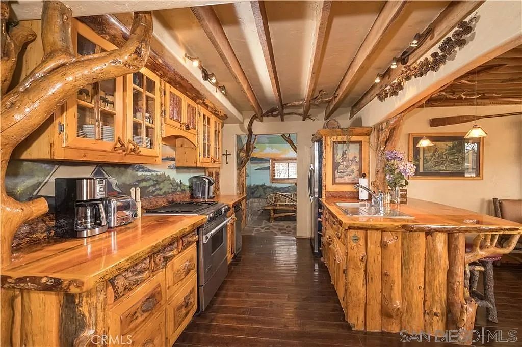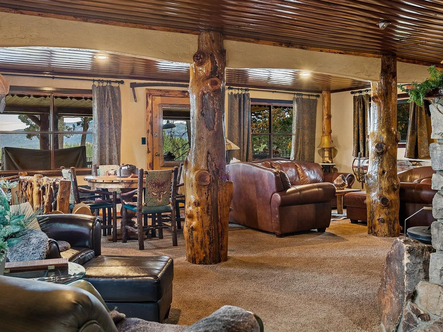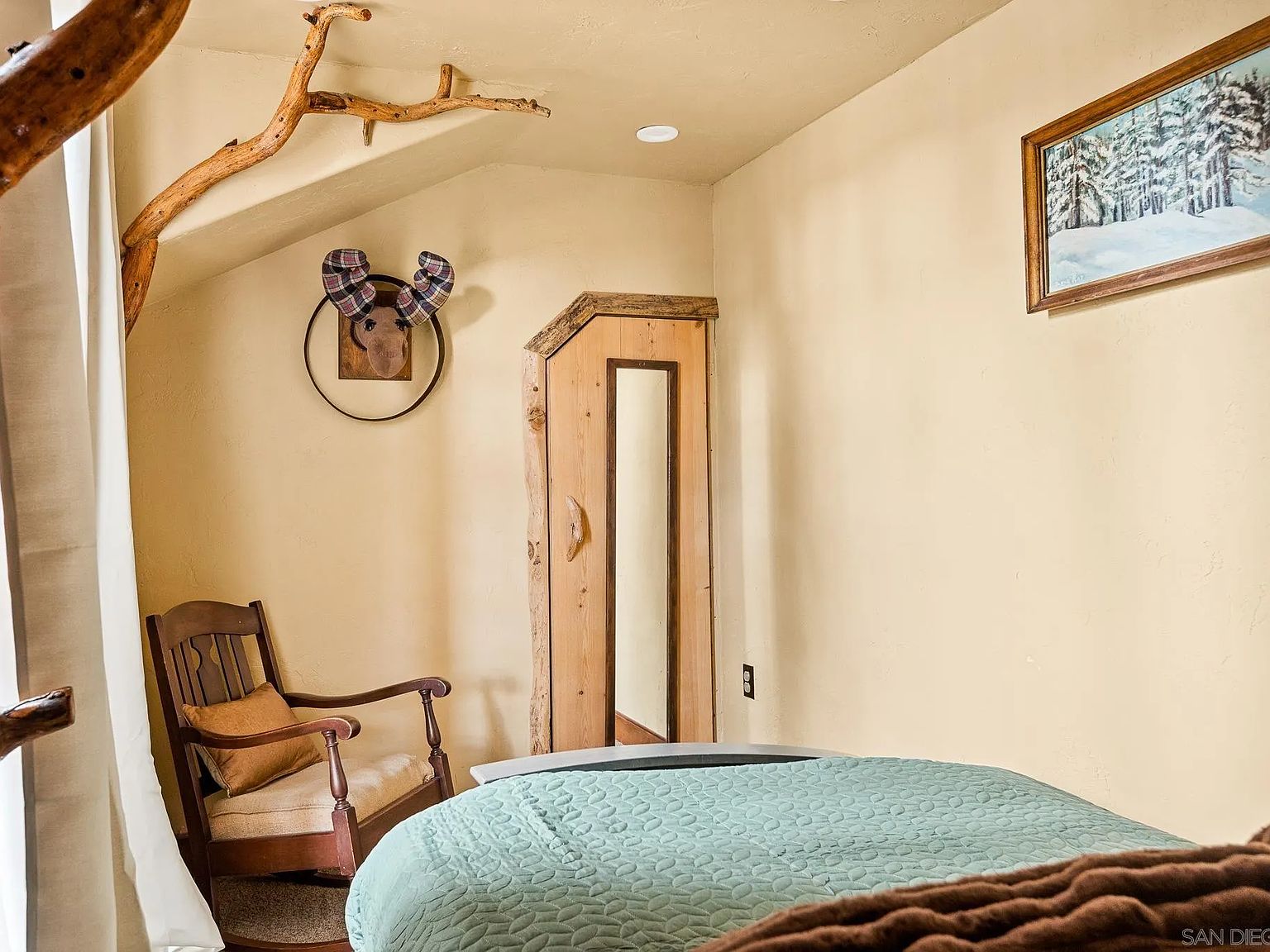Beautiful log home with an amazing view to the west, located on the 4th T of the Big Bear Golf Course.. This home was built in 1954, much of the home was hand crafted in the very garage it has now.. Then in 2006, the home was given a new life with more of today's amenenties. It is one of the most unique homes you will see in Big Bear today. Main level has one bedroom and bath, living room,dining room and kitchen. Top level has 2 bedrooms with one bath.. With a small adjustment, a 3rd bedroom can be achieved. The lower level bedroom has a full bath, claw foot tub, gas free standing stove, and a small kitchenette. With a little addition to that room, it could be used as a separate livable space. VRBO history for one year, this year will be better. The owners have added many ameneties, including heat and air split units on all levels. Free standing gas fireplace in the lower bedroom/basement aread, 90% of the windows are new dual pane, new large hot water heater, new spa as of 2024 located outside the front door. The lot is oversized with large wood decks on both sides of the home.. Commerial lighting lights up the large trees at night. Part of the roof was replaced and the roof is in good condition. New dishwasher as of 2023. New metal and glass door leads into the mudroom with combo lock. The garage has also been crafted with wood doors and elk handles on all of them. Plenty of storage in the garage and in the attic above the garage. Both refrigerators, kitchen and garage stay.. Garage door has auto opener. 2 additional concrete parking spaces were added so 4 cars fit comfortably on the property. The lighting fixture above the dining table and the one in the upstairs hallway are works of art.. This is a unique, old school big bear cabin. And, your kids can sled right outside the back door onto the golf course. It's fun to watch the golfers too.