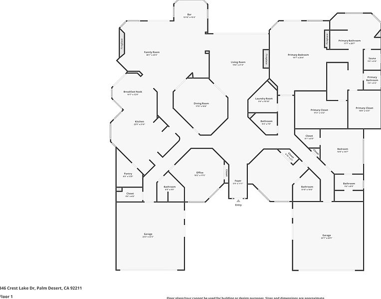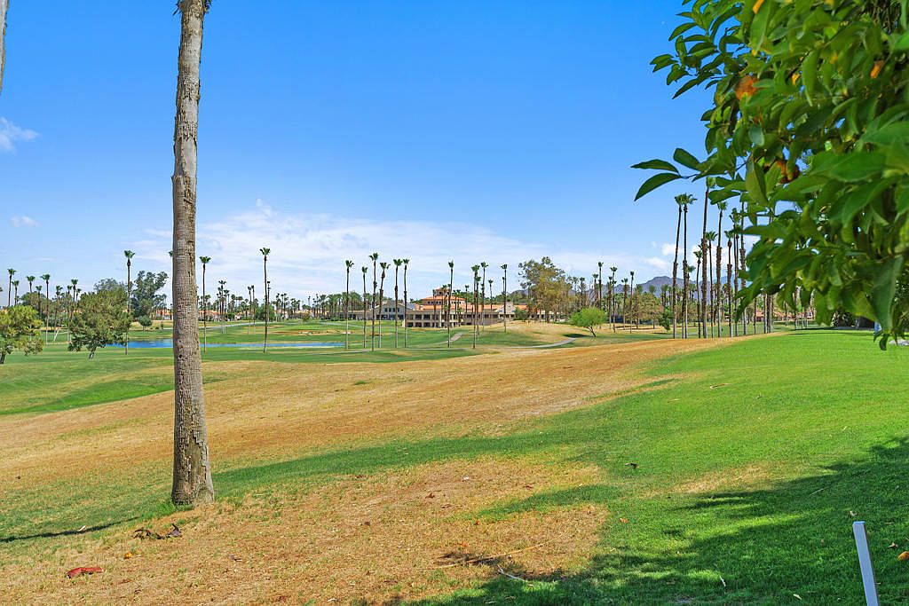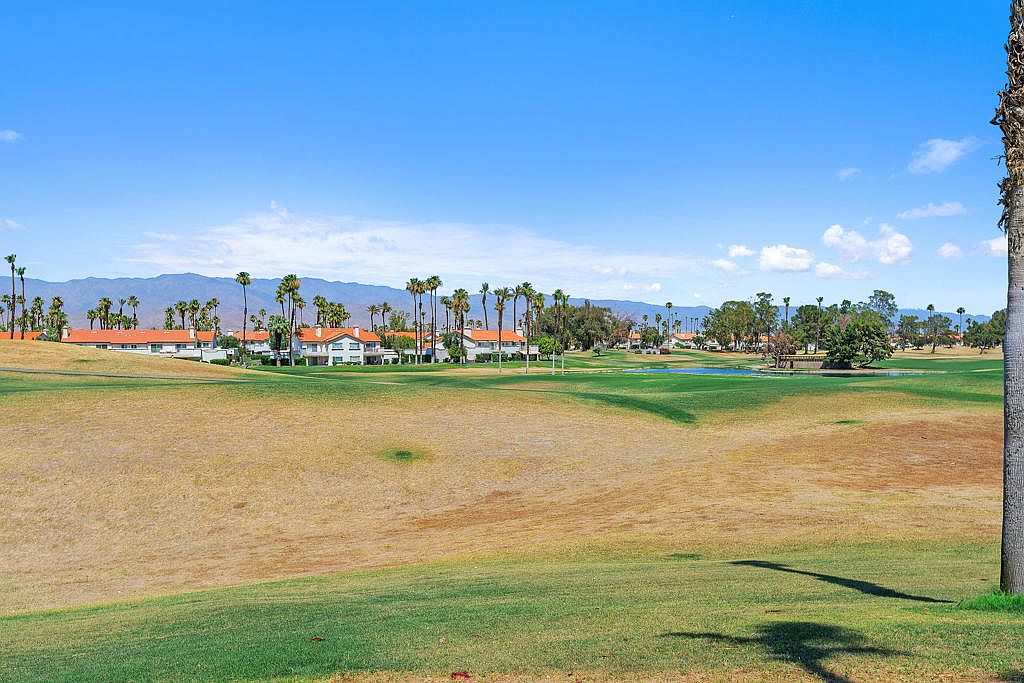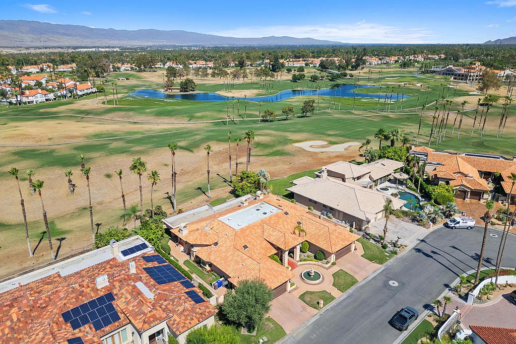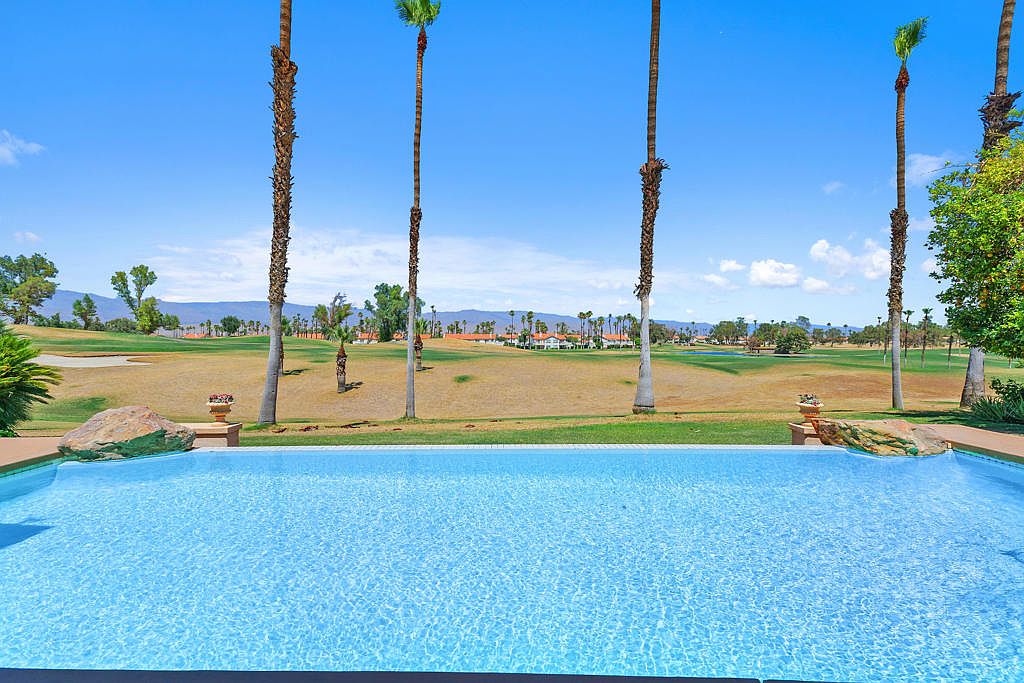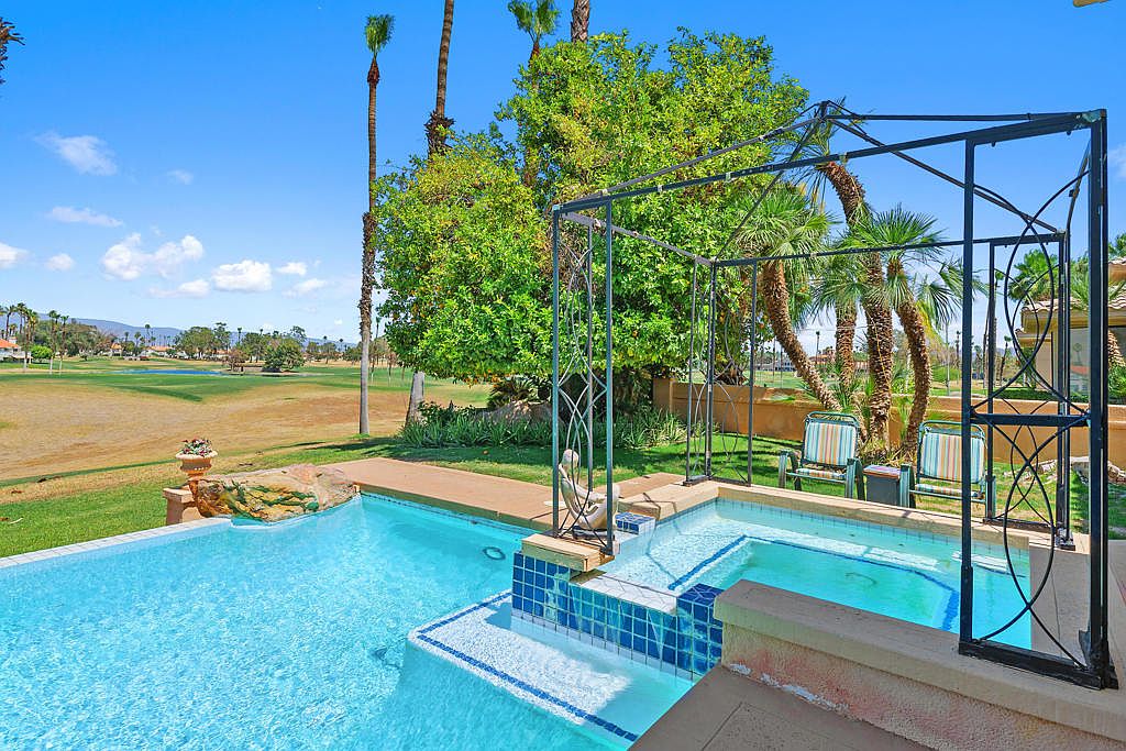 Welcome to a one-of-a-kind estate nestled in the prestigious Desert Falls Estates in Palm Desert. This custom-built home is strategically positioned on the golf course and features breathtaking panoramic mountain views. Built in 1991, this meticulously maintained residence boasts 4 spacious bedrooms, 5 luxurious bathrooms, and 5,003 square feet of architectural charm and luxury. From the grand fountain courtyard entryway to the vibrant interior spaces, every detail has been meticulously crafted with vaulted and coffered ceilings, rich architectural details, and custom-built-ins. The home features multiple living areas, each with its own fireplace, and the custom wet bar is perfect for entertaining or relaxing in style. The gourmet kitchen boasts a large island, a gas cooktop, ample cabinetry, and a sunny breakfast nook that opens to the backyard patio. The spacious primary suite is a private retreat complete with a cozy fireplace, golf course views, a spacious walk-in closet, and a spa-like bathroom featuring dual vanities, a jetted soaking tub, an oversized walk-in shower, and a cedar-lined sauna. Each guest bedroom is generously sized and well-appointed, providing comfort and privacy for family or visitors. Step outside to your private backyard oasis, where an infinity-edge pool and spa overlook the lush fairway with a striking panoramic mountain views. The large covered patio offers multiple areas for lounging, dining, and entertaining. A four-car garage is perfect for car collectors, golf cart storage, or accommodating guests with ease. Located behind the gates of Desert Falls Country Club, residents enjoy access to golf, tennis, pickleball, and a full-service clubhouse. Whether you're hosting a lively celebration or enjoying a peaceful morning with coffee and panoramic views, this home offers an unmatched lifestyle in one of Palm Desert's most desirable golf course communities.