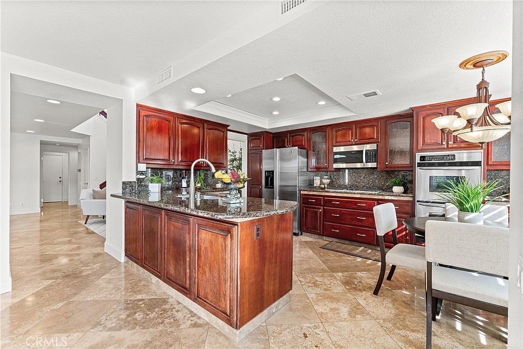 As you step inside, you’re greeted by high ceilings and elegant tile flooring throughout. The spacious living room features a cozy fireplace, perfect for relaxing or entertaining. The open-concept kitchen is outfitted with high-end appliances and ample counter space, making it ideal for both casual meals and large gatherings. It flows seamlessly into the dining and seating areas, creating a welcoming space for family and friends.