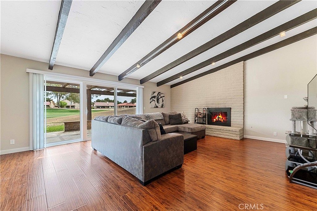 As you step inside, you are greeted by a spacious living room featuring vaulted beamed ceilings and a stunning centerpiece fireplace, creating an inviting atmosphere for both relaxation and entertaining. The open-concept design seamlessly flows into the kitchen, where you'll find crisp white cabinetry and elegant neutral granite countertops, perfect for any culinary endeavor.