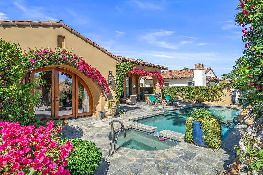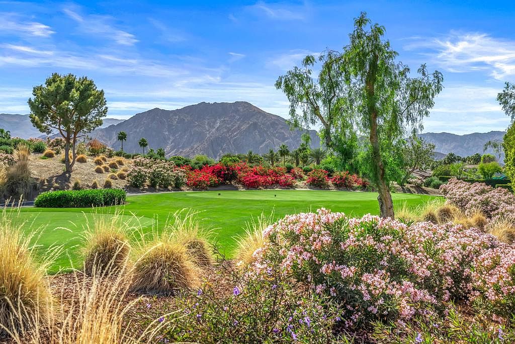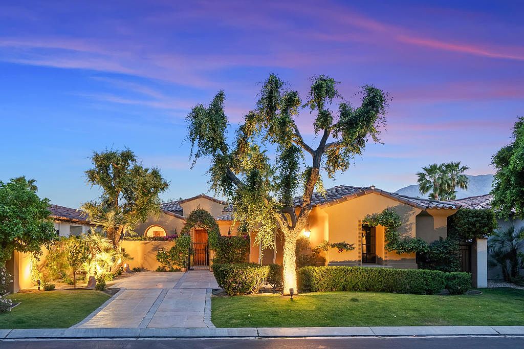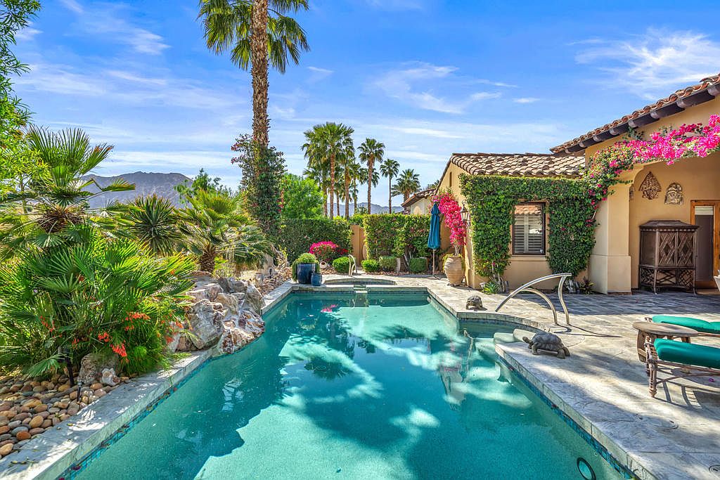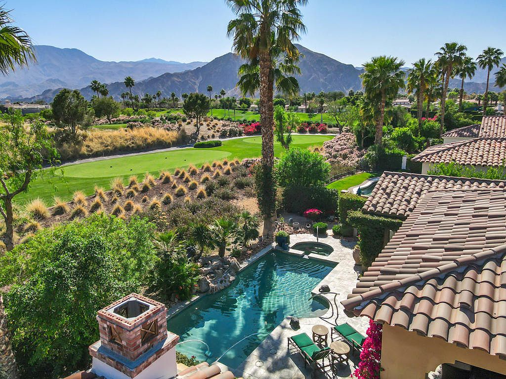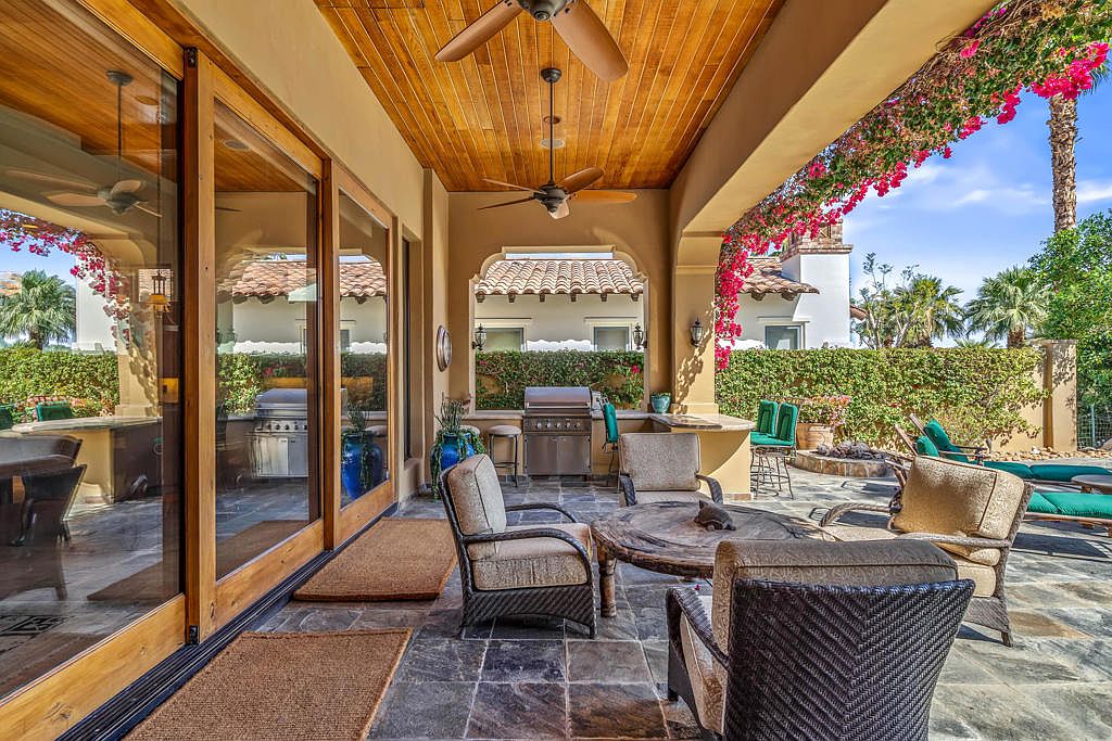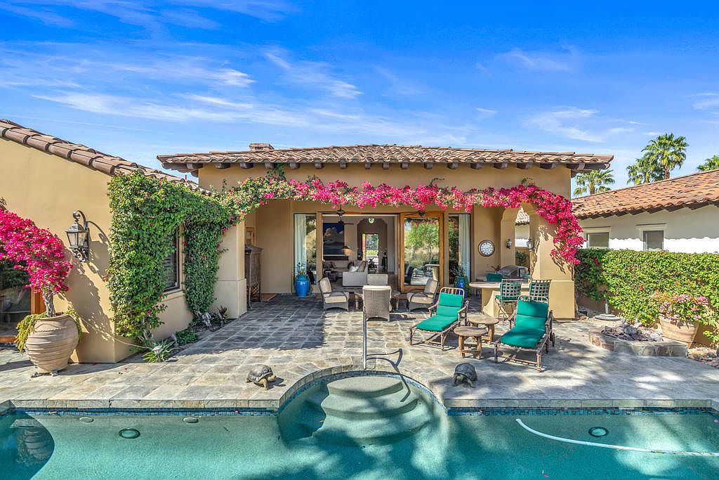 Desert Golf Lifestyle Living at Its Finest in Your Private Oasis at The HideawayDiscover the ultimate in desert luxury with this exceptional Plan 2 Villa offering 2,900 sq ft of refined living within the prestigious, guard-gated Hideaway Golf Club--an exclusive enclave celebrated for its world-class golf, privacy, and architectural sophistication. Perfectly situated just steps from the driving range and putting green, this is a rare opportunity to own one of the best-priced grand homes in the community. The lush desert landscaping enhances privacy and creates a serene, secluded retreat. Tastefully updated and professionally maintained, the home overlooks the 5th Hole of the Clive Clark Golf Course with sweeping mountain and fairway views. Featuring 3 bedrooms and 3.5 baths plus a dedicated den/office, this thoughtfully designed residence blends luxury and comfort. The oversized chef's kitchen impresses with Wolf commercial-grade appliances, Sub-Zero refrigerator, wine fridge, granite countertops, and custom cabinetry. Step through a charming courtyard into a dramatic open-concept living space highlighted by polished wood plank, peg-and-beam artisan ceilings, hand-carved architectural doors, a limestone-surround fireplace, and a built-in media center. Expansive 14' Fleetwood sliding doors open to a newly renovated pebble-finish pool and spa with waterfall fountain and a outdoor kitchen--ideal for entertaining beneath the desert stars. Exquisite finishes include limestone, marble, and stone flooring, designer carpet in the bedrooms, and meticulous craftsmanship throughout. The luxurious primary suite offers direct pool and spa access, creating a true resort-style experience. Complete with a 2-car garage plus golf cart parking and offered fully furnished, this one-of-a-kind Villa is the epitome of desert golf lifestyle living--where timeless elegance meets breathtaking views in your own private oasis.