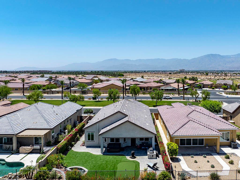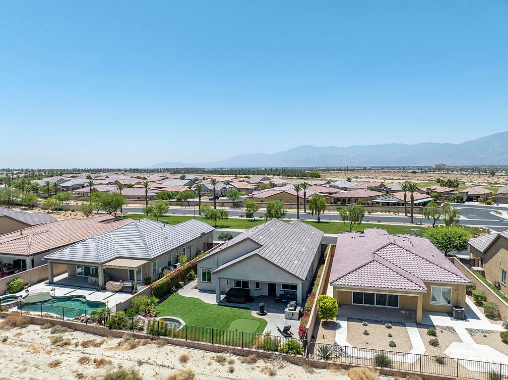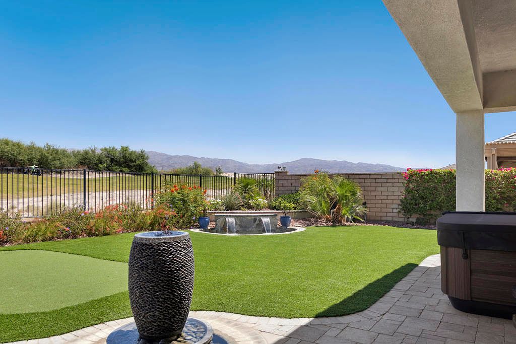 Welcome to your beautiful and uniquely furnished and incomparably upgraded desert home with unlimited north and south mountain views located on only one of a few private, large lots (representing less than 3% of properties) in Terra Lago Four Seasons. Architecturally appealing and splendid inside and out...the open floor plan includes features not seen in most valley homes including: Spa level relaxing, glass enclosed 'In-Master' bathroom steam shower and soaking tub State of the art jacuzzi with multi-color lighting right outside your back door. A spacious ensuite master with an inviting sitting area, large dressing closet. A furnished private guest room and full adjacent bath. Prep and cook to your hearts delight in your inviting chefs kitchen equipped with high-end appliances. Home living is enhanced with select, custom-designed furniture and state-of-the art TV's/sound systems. Also features high-end laundry equipment, energy efficient heat/air conditioning, a low maintenance tankless hot water heater, ceiling fans, humidity controls and dimmer-controlled LED lighting fixtures throughout. The private, beautifully landscaped exterior enables unobstructed mountain views. There is a practice putting green incorporated in the low maintenance artificial turf front and backyard...and a dramatic custom lit waterfall and backyard fountain and front yard night lit water features. Abundant closet space throughout and a large two car garage with potential to add a third bedroom or office. The guard-gated community features include resort-outdoor pool with spa, indoor year-round Olympic-size pool, pickleball & tennis courts, bocce-ball, a fully equipped gym, pool tables, library, group activities galore, a hair salon and massage room. Looking for a vacation home escape, or unrivaled quality full-time living? This property stands out from most Terra Lago Four Seasons homes.