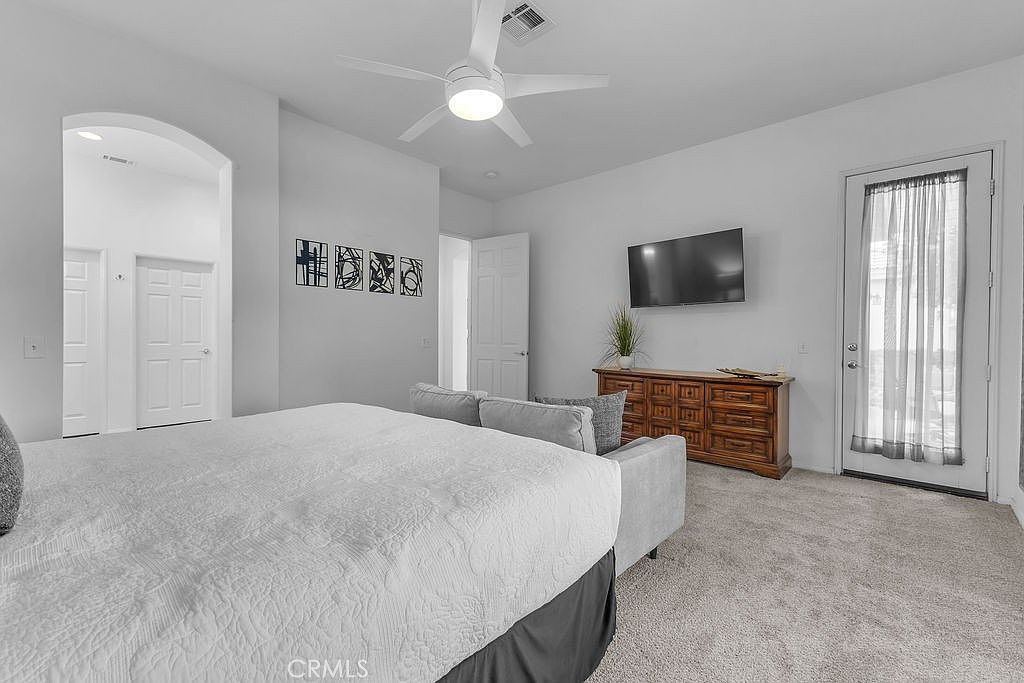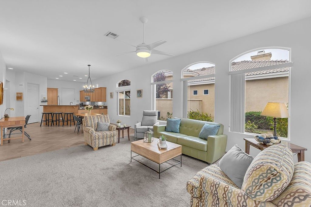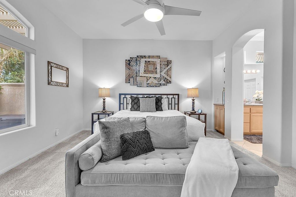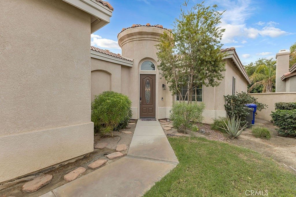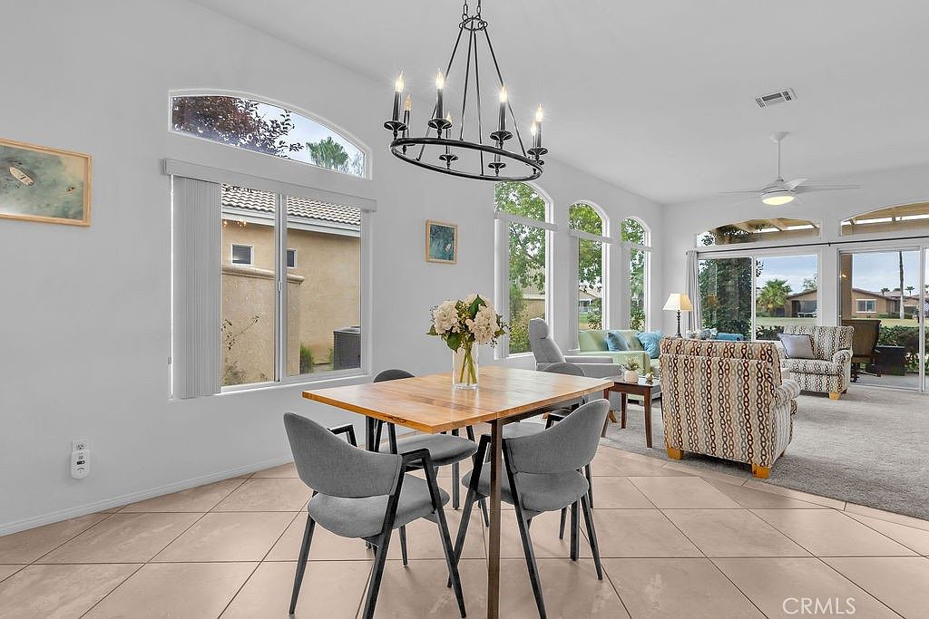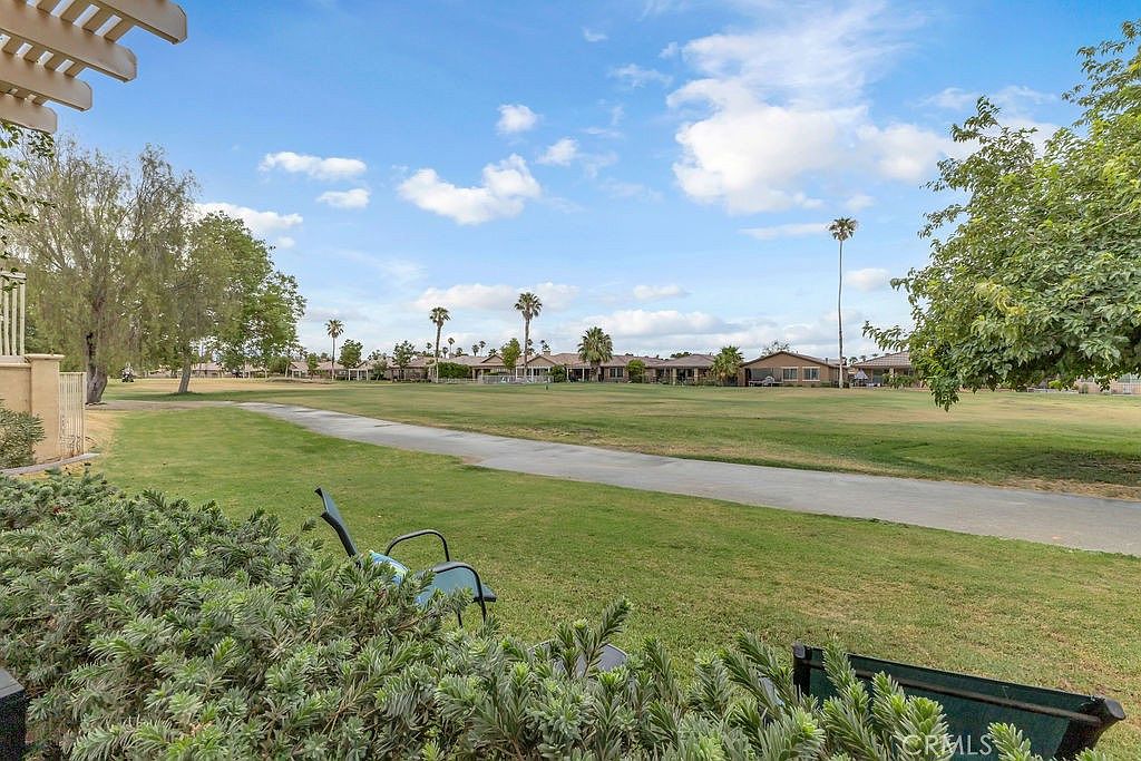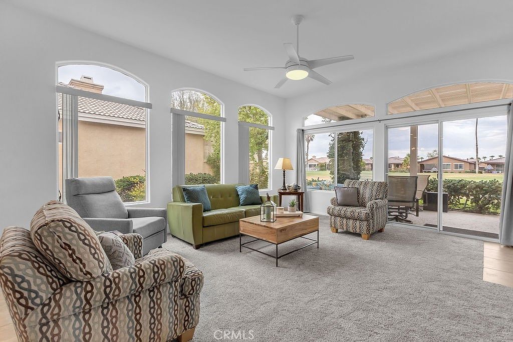 Stylishly updated, turnkey furnished home in the guard gated community of Indian Palms Country Club – Resort-style living with a 27-hole golf course right in your backyard! This 2-bed, 2-bath, 1627 sq. ft. one level residence can be an investment opportunity with short-term rentals allowed all year long. It is especially desirable due to its close proximity to the Empire Polo Grounds, home to world famous Coachella and Stagecoach festivals. This spacious home features a bright, open floor plan with high ceilings and large windows that blend indoor and outdoor living. The kitchen includes granite countertops and a breakfast bar, and the living area includes a charming gas fireplace. The spacious primary suite boasts a double vanity, soaking tub, separate shower, and a generous walk-in closet. New carpeting was installed in June 2024. The secondary bedroom is privately located away from the main suite with a full bath adjacent to it. The indoor laundry room includes a washer and dryer. The home offers parking for four vehicles-two in the driveway and two in the garage, which also includes additional space suitable for a golf cart.