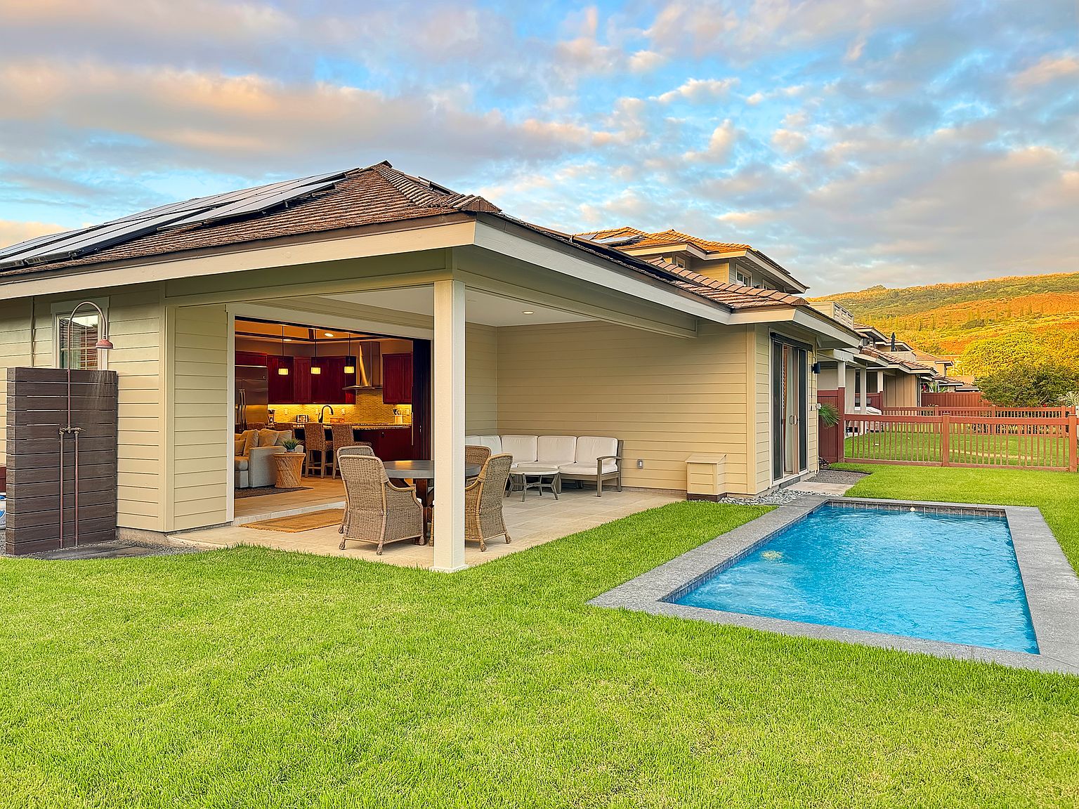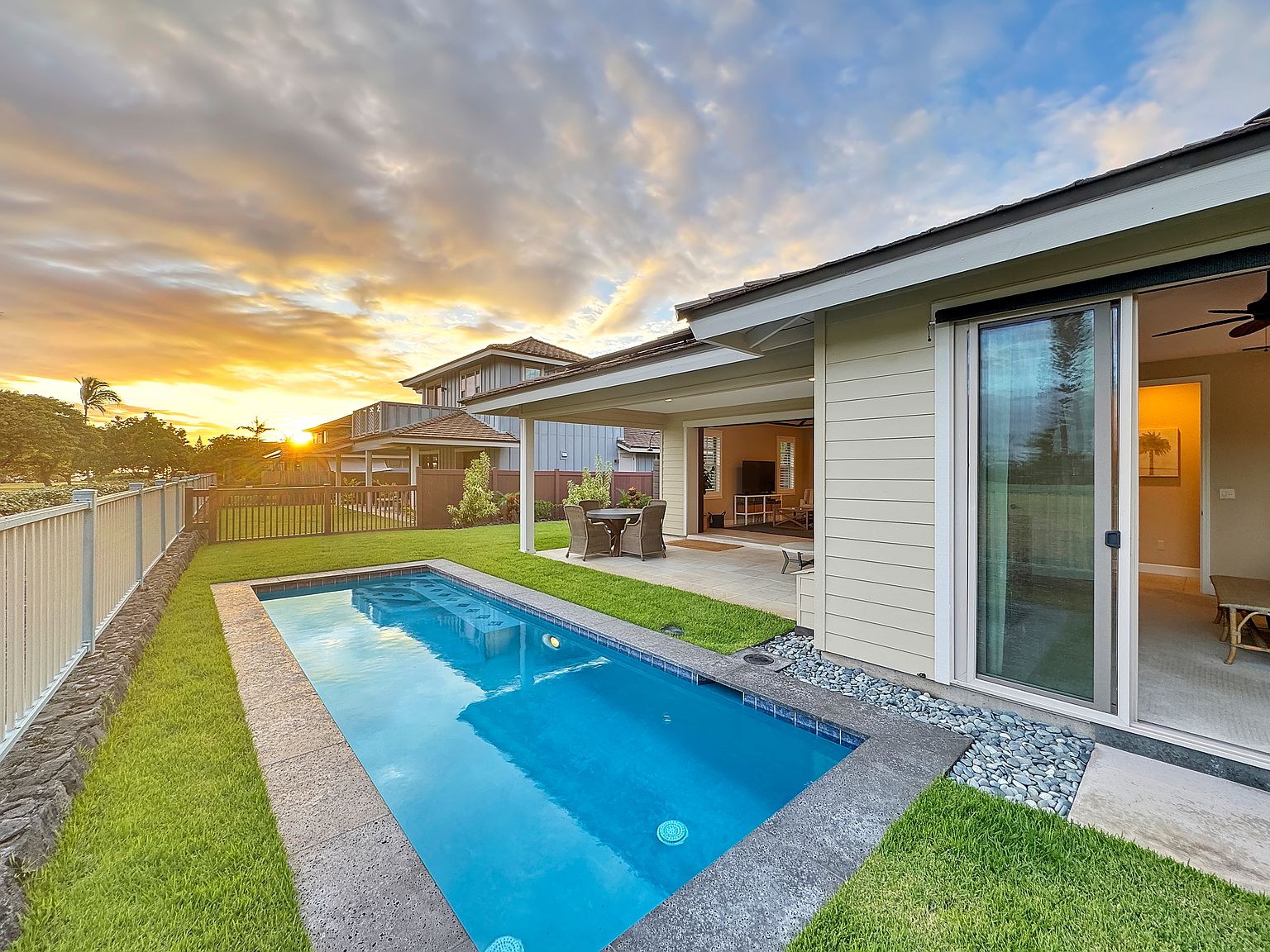 Welcome to 78-122 Holuakai, a lucrative resort zoned, short term vacation rental property in the gated neighborhood in Holua Kai at Keauhou. This stunning property is offered fully furnished, and turn-key ready. <br><br>This Holua Kai home features seamless indoor/outdoor living with pocket door sliders opening to an oversized covered lanai, golf course views and peek-a-boo ocean views. Relax by the inviting heated pool with swim jets that can accomadate any swim level. There is an outdoor shower with hot and cold water. Built in 2019, this home has 20 owned PV solar panels with three back-up batteries. The driveway is one of the best driveways in the subdivision and allows for plenty of parking. The home is fully fenced with palm trees, a julie dwarf mango tree, on sewer, county water, and in a neighborhood with underground utilities.<br><br>Inside the air conditioned home, there are resort-like tray ceilings, an open concept kitchen with a large dining and living room area. The primary bedroom suite, separate from the rest of the house, opens to the pool and yard. The primary bathroom has a walk-in shower with a giant soaking tub and a walk-in in closet.<br><br>The other two bedrooms are found on the opposite side of the home, along with a full bathroom with a double sink and an additional half bath for guests.<br><br>Currently used as a short term rental, you'll enjoy a home that's already dialed in for vacation rentals. Or enjoy this as your second home or primary residence. <br><br>This 41 home gated community is surrounded by the Kona Country Club golf course. Residents and guests also enjoy the Holua Kai pool, hot tub, pavilion and overlook out to the pacific ocean right above the 3rd hole, par 3 at Kona Country Club. Convenient access to Keauhou Bay, beaches, Kona Country Club, Holua tennis and pickleball courts, Keauhou shopping center, and Ali’i Drive.<br><br>Walkthrough video: https://player.vimeo.com/video/1027533460