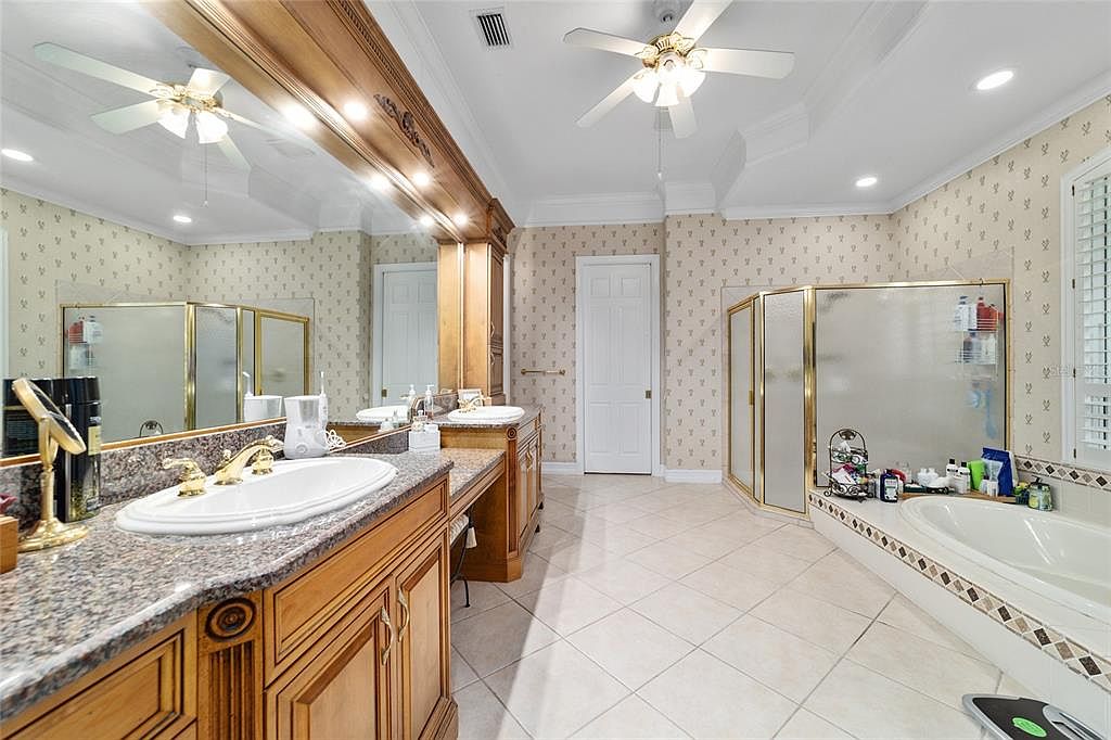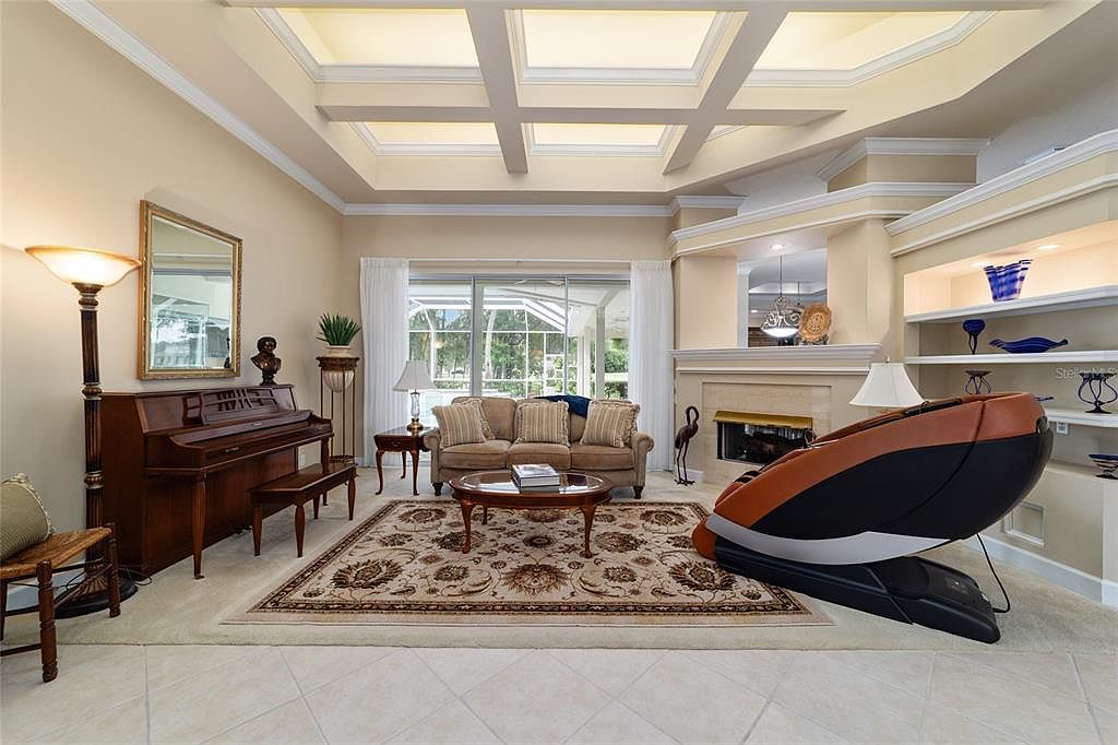 Welcome to this stunning 4 bedroom/3 bath Rutenberg-built home, with 4,614 sq ft of living square footage and situated in a gated golf community with beautiful views of the 18th hole. Step inside to find a well-planned triple split floor plan that includes formal living and dining rooms, a private office, and a spacious bonus/game room with sliders that open out to the pool. Enjoy movie nights in your very own theater room—perfect for entertaining guests or relaxing with family. The heart of the home is the expansive kitchen, featuring abundant cabinetry and a large center island complete with granite countertops. A cozy breakfast room shares double sided fireplace with formal living room and has a mitered glass window overlooking the pool and lanai. The family room, with built-ins also opens to the pool area with sliding glass doors, creating a seamless indoor-outdoor flow. The spacious primary suite has large walk-in closets and a spa-like bath. Bedroom 2 has its own private bath, while Bedrooms 3 and 4 share a convenient Jack and Jill layout. Step outside to your private backyard oasis! The screen-enclosed covered lanai offers a shaded retreat, while the saltwater pool is surrounded by a beautiful pavered deck—perfect for soaking up the sun or entertaining friends and family. Additional features include a spacious laundry room, an attached 3-car garage, and a detached garage for extra storage or hobbies. With its spacious layout and unbeatable golf course views, you won’t want to miss this one!!