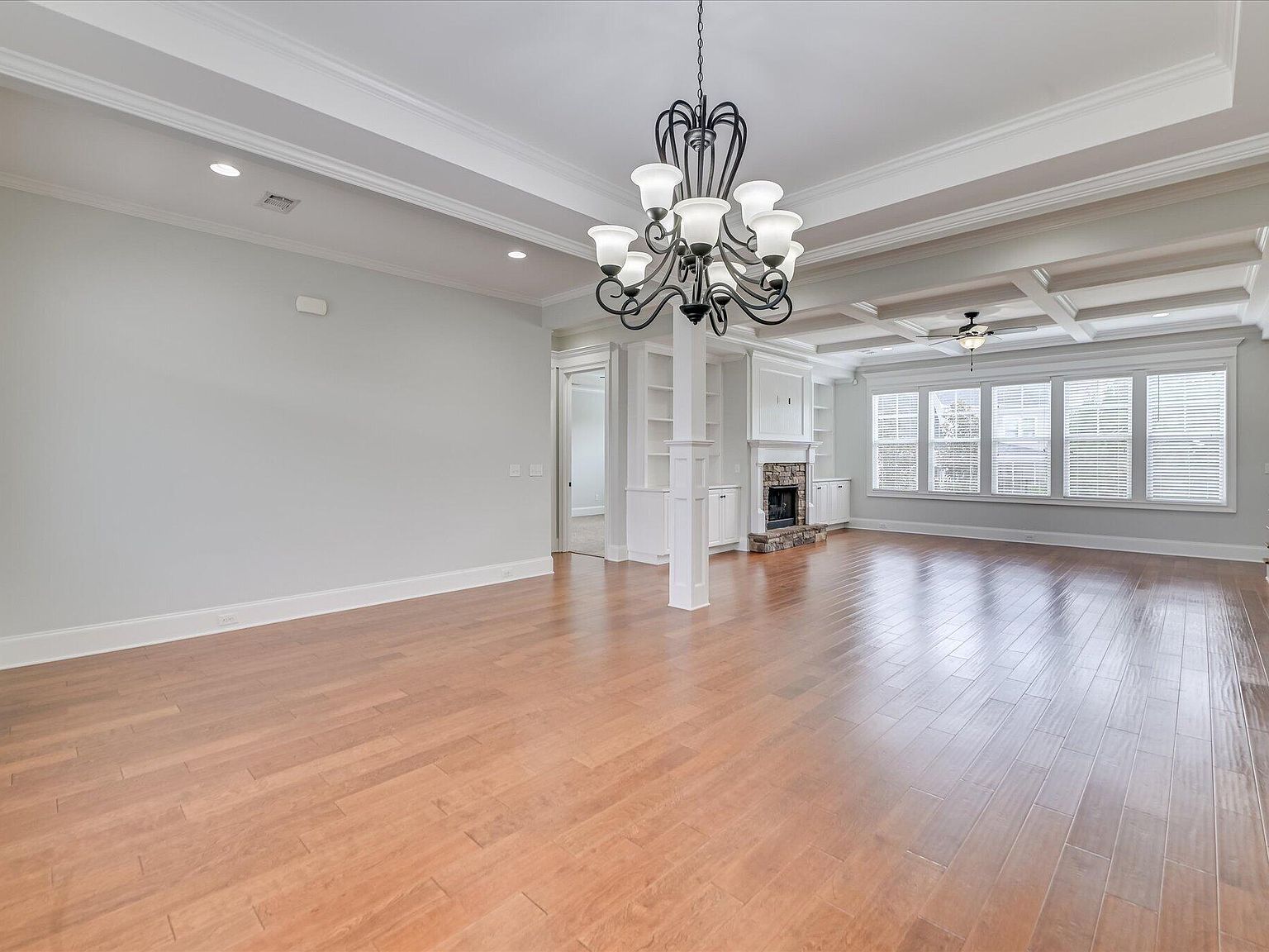 Step inside to an open floor plan that flows seamlessly across the main level, accented by beautiful wood floors, coffered ceilings, and custom built-ins. The heart of the home is the gourmet kitchen, boasting an oversized island, granite countertops, stainless steel appliances, gas cooktop, hidden hood, and a cozy breakfast room.