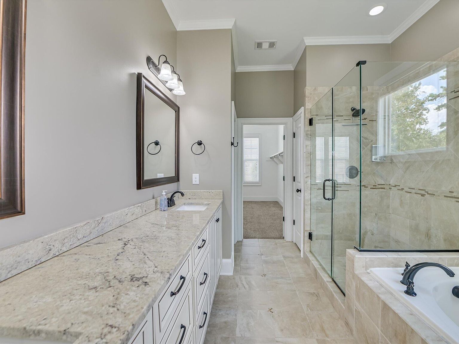 The living room offers warmth and charm with a gas fireplace and elegant touches throughout. Retreat to the luxurious primary suite, featuring a custom ceramic tile shower and large custom closet.