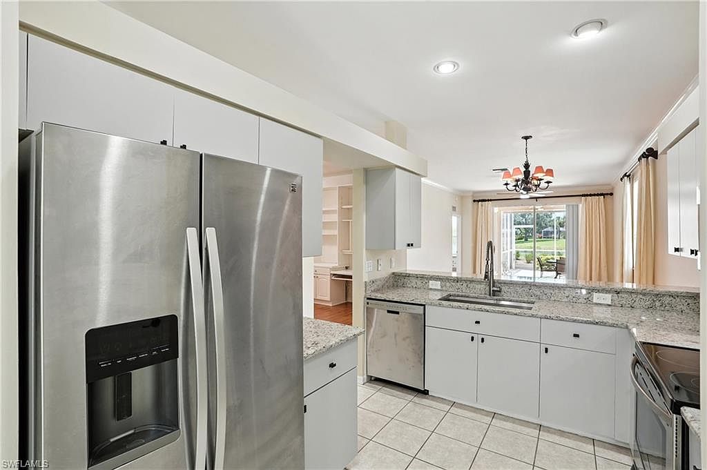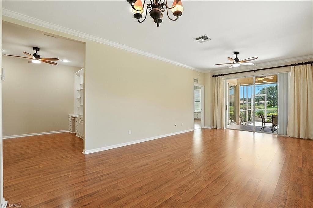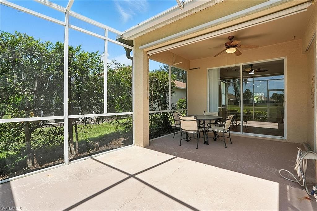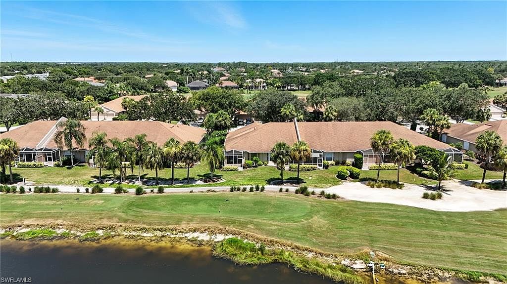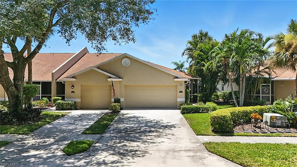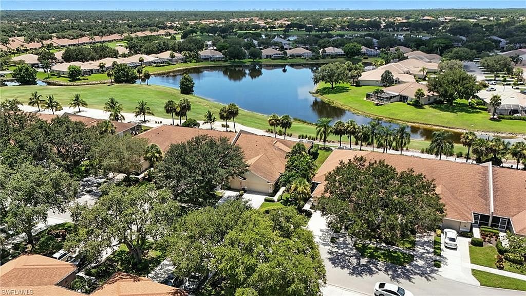 Enjoy peaceful golf course and lake views from this spacious 2 bedroom + den, 2 bath end-unit villa in the gated community of Heritage Greens. With no mandatory golf membership and low HOA fees, this home offers exceptional value in North Naples. The open-concept layout features split bedrooms, tile and vinyl flooring throughout, and tasteful updates. The kitchen includes granite countertops, stainless steel appliances, and a breakfast bar that opens to the main living area - ideal for entertaining. The primary suite offers a bay window, walk-in closet, and updated ensuite bathroom. Additional highlights include built-in shelving in the den, two screened patios - one in front and an extended lanai in the back with serene golf and lake views - and a 2-car garage with a large driveway for extra parking. HOA fees include cable, internet, and lawn care for easy, maintenance-free living. Amenities include Arrowhead Golf Course (public, pay-as-you-play), community pool, clubhouse, tennis, pickleball, fitness center, and playground. Rentals allowed 12x/year. Quick closing possible!