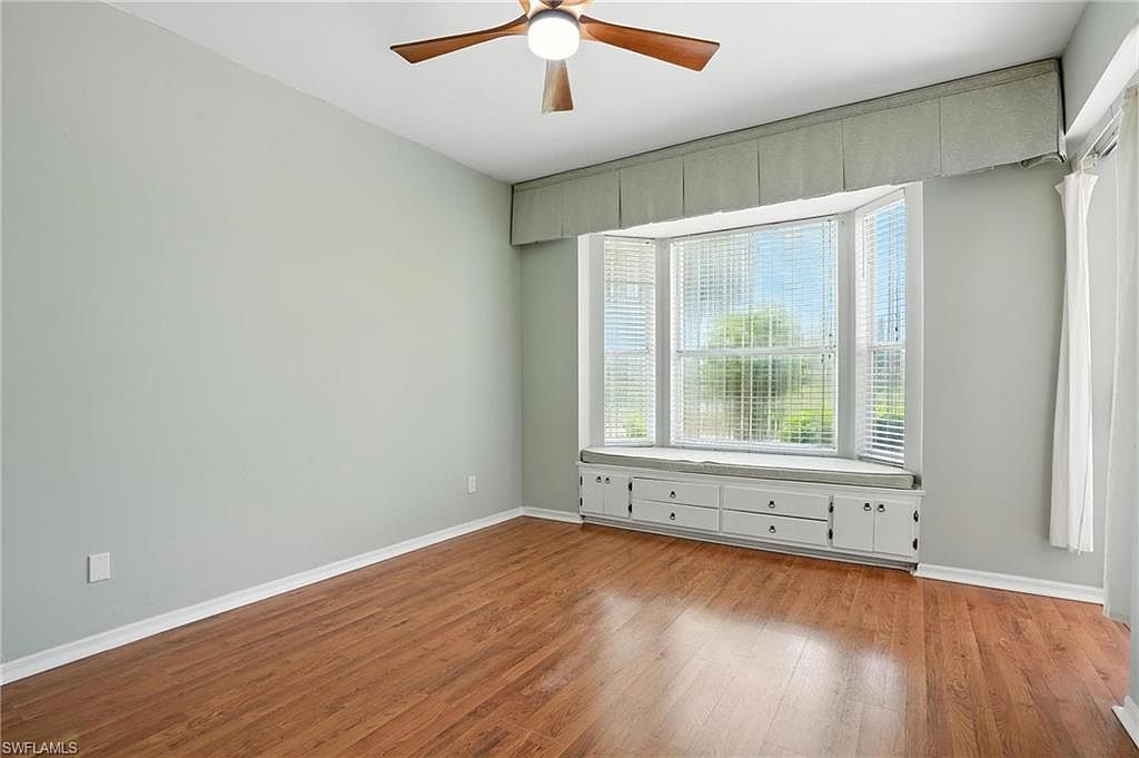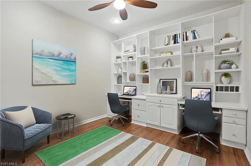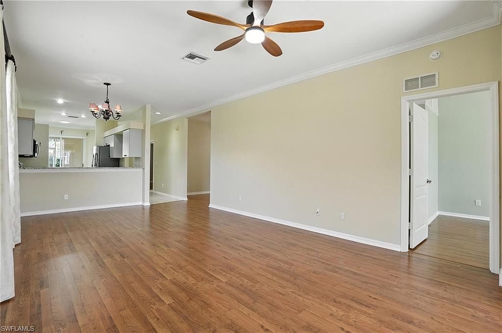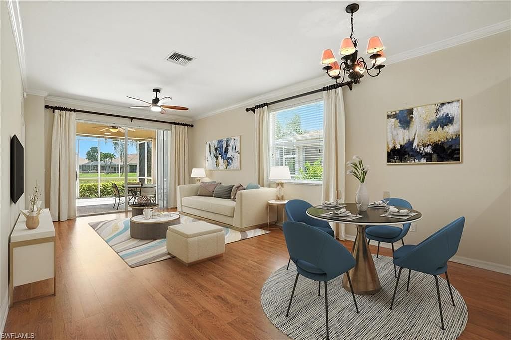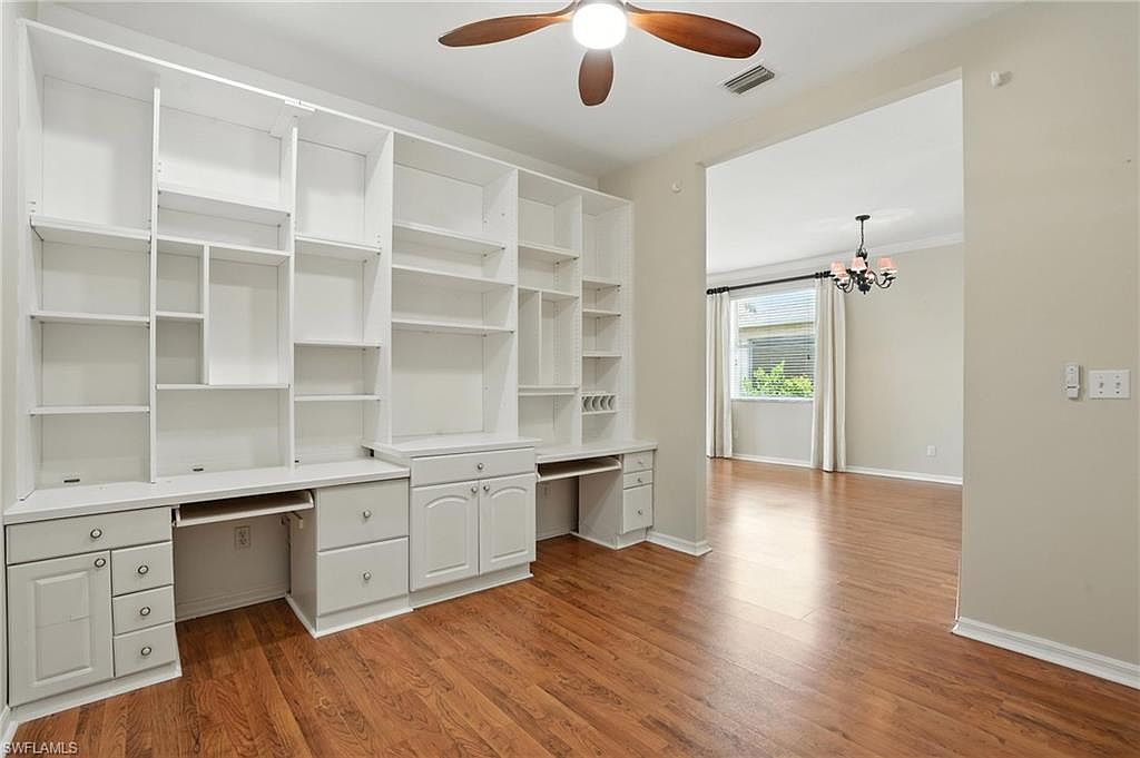 Enjoy peaceful golf course and lake views from this spacious 2 bedroom + den, 2 bath end-unit villa in the gated community of Heritage Greens. With no mandatory golf membership and low HOA fees, this home offers exceptional value in North Naples. The open-concept layout features split bedrooms, tile and vinyl flooring throughout, and tasteful updates. The kitchen includes granite countertops, stainless steel appliances, and a breakfast bar that opens to the main living area - ideal for entertaining. The primary suite offers a bay window, walk-in closet, and updated ensuite bathroom. Additional highlights include built-in shelving in the den, two screened patios - one in front and an extended lanai in the back with serene golf and lake views - and a 2-car garage with a large driveway for extra parking. HOA fees include cable, internet, and lawn care for easy, maintenance-free living. Amenities include Arrowhead Golf Course (public, pay-as-you-play), community pool, clubhouse, tennis, pickleball, fitness center, and playground. Rentals allowed 12x/year. Quick closing possible!