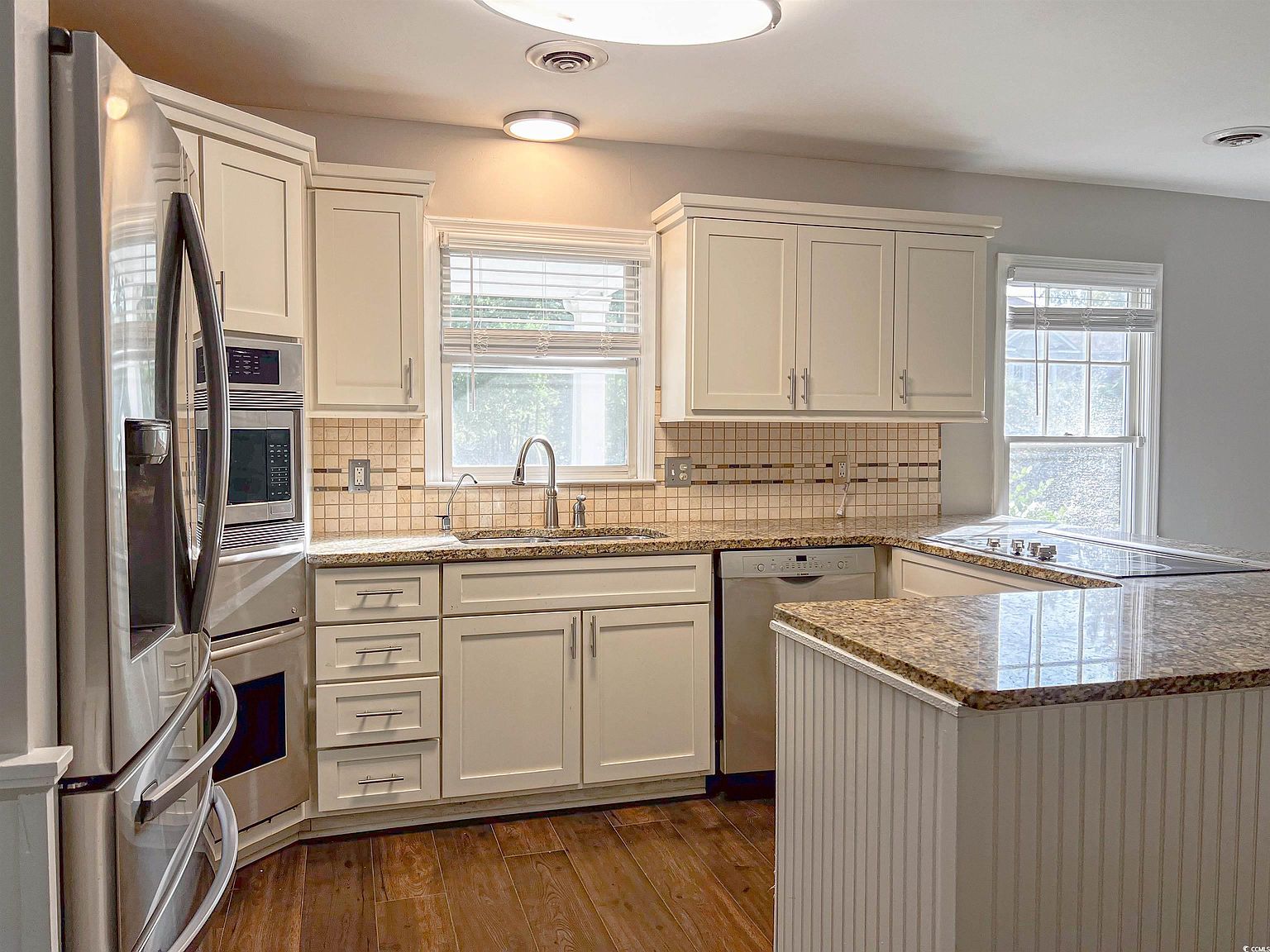 Welcome to the beautiful golf course community of Indigo Creek! This spacious 3-bedroom home offers a bonus room with a sink that could easily serve as a 4th bedroom, office, hobby room, or guest suite. You’ll love the vaulted living room with a cozy fireplace, perfect for relaxing or entertaining. The kitchen features granite countertops, stainless steel appliances, and an open layout for easy flow to the dining and living areas. Enjoy peaceful mornings on the covered front porch or step out back to your large, wooded backyard, where a small bridge connects directly to the driving range—a golfer’s dream! The large utility room is conveniently accessible from both the attached two-car garage and the primary bedroom, adding exceptional functionality. Situated on a beautiful, oversized lot in a popular, established subdivision, this home combines charm, comfort, and location—just minutes from shopping, dining, and the beach.