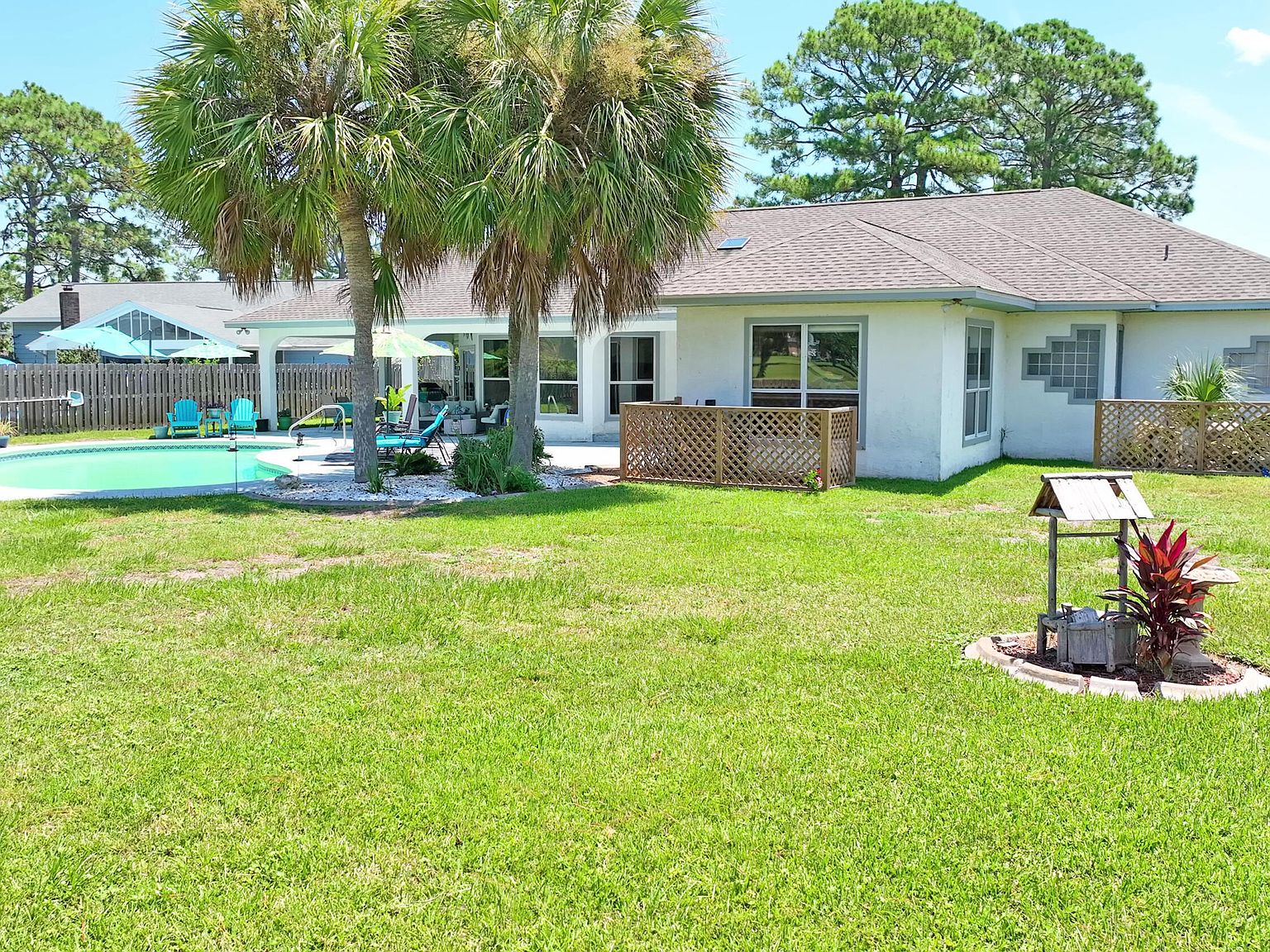Welcome to 361 Eagle Drive in beautiful Panama City Beach, Florida. Located in the desirable tucked away Golf Course community of ''COLONY Subdivision'' mere blocks from the Gulf coast and just minutes from your choice of white sand public beaches, Pier Park, R, Seltzer, & Frank Brown public parks, St. Andrews State Park, public boat ramps, Duplin Winery, golf, dining, shopping, Gayle's Trail and the newly opened Top Golf and Pirates Voyage Dinner Theater (Much of this accessible by golf cart, scooter, bicycle, or even on foot). A very quiet and well-kept neighborhood with no vacation rentals allowed and NO HOA!With its original charm and extensive modernizations totaling over $100K, this exceptional custom stucco residence offers a blend of open central space and secluded spa-like atmosphere thoughtfully designed to accommodate a variety of lifestyles. It rests on a beautiful property fronting the 14th hole of Legacy Championship Golf Course, positioned for amazing westerly sunset views across 4 open fairways with two ponds. A sprawling one level home with oversized two-car plus attached garage, that has ample storage and off-street parking for your boat, RV and guests. For your convenience, the home includes a separate and private well with new pump assy, new pool equipment, several new windows, added HVAC UV lighting system for improved air quality/ efficiency, and is now generator ready with new external hook-ups for both electrical panels in case of outage. Additionally, this home was originally designed with ADA accommodations throughout, including indoor garage entrance ramp, wide halls and doorways & bath services not afforded in many homes.Inside, the open-concept layout creates a seamless flow between the living, dining, and kitchen areas, all freshly finished with attention to detail. The spacious, modern kitchen area features a beautiful bay garden window, new lighting, granite countertops, a nicely appointed center island/breakfast bar, and stainless-steel appliances including wall mount oven and above cooktop venting microwave. The ceilings are 9'+ with skylights in the kitchen and the central living space is vaulted with a multitude of windows including high foyer glass and sliding glass doors for the perfect amount of added sunlight. Boasting 3 huge brms (2 primary ensuites & one adjoining bathroom), 3.5 fully remodeled total bathrooms, a spacious eat-in kitchen, laundry/mud room, and 4 additional multi-functional spaces currently used as Pilates studio, Billiards rm, a wet bar/reading rm and private office.The backyard is people & pet friendly, fenced, large and spacious with a covered patio and beautiful gunite swimming pool that has access from three separate home locations and is perfect for relaxing, entertaining, or simply enjoying the Florida sunshine. Best of all may be the westerly golf course and sunset rear facing views that end every day in awe.This is a rare opportunity to enjoy an unparalleled golf and coastal lifestyle in a truly picturesque setting. Call today for your private tour and see for yourself the many details that make up its delightful charm! All information is deemed reliable, but all measurements and square footage should be verified if important.