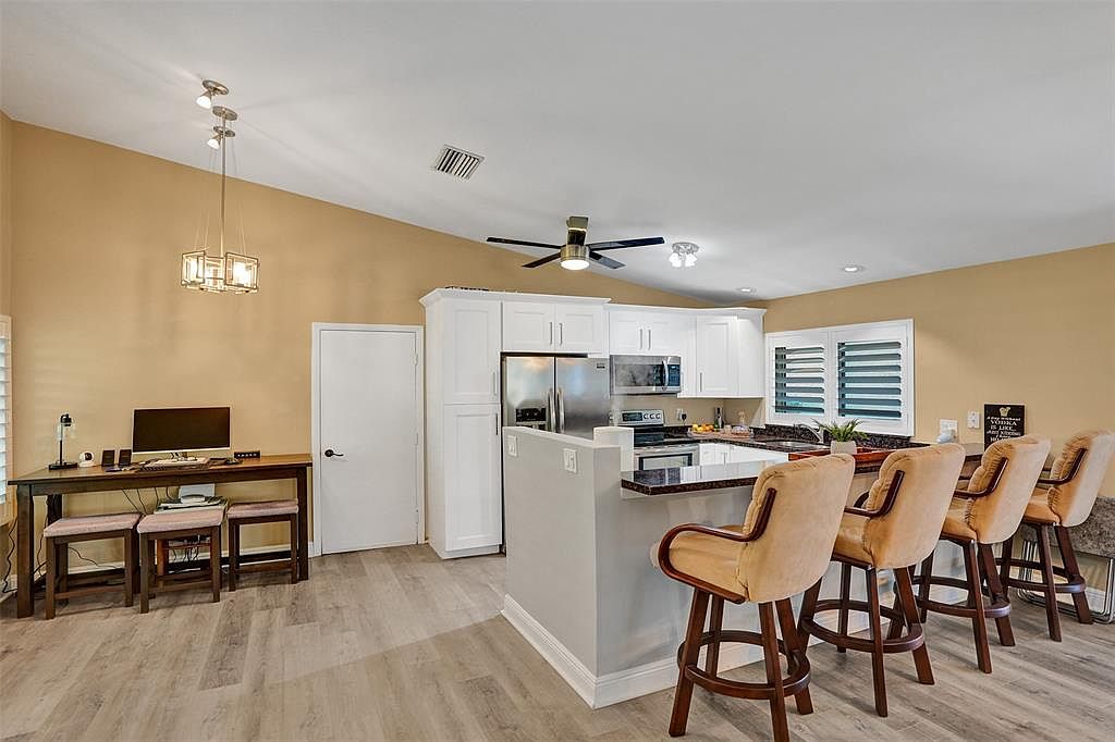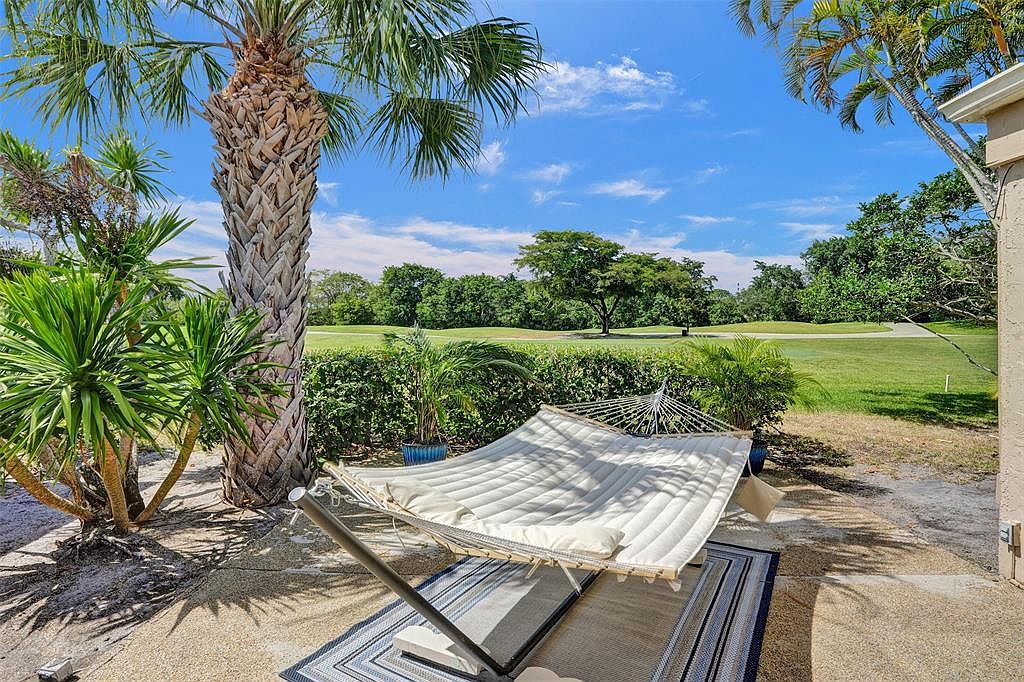 It is one-story, fully updated and features a light and bright open-concept floor plan with high ceilings, 2 spacious bedrooms, and 2 baths. Upgrades include impact windows with beautiful plantation shutters, and custom-made panel coverings for the sliding doors to the patio. Looks like a designer lives here! LVP floors, updated baths, and sleek white kitchen could make this decorator-look home, move-in ready with furnishings & decor negotiable. Use the enclosed patio for relaxing or entertaining, and enjoy the community pool, tennis and pickleball courts. Indian Spring is a 24/7 guard-gated, security patrolled, golf course community, with membership not required but affordable.