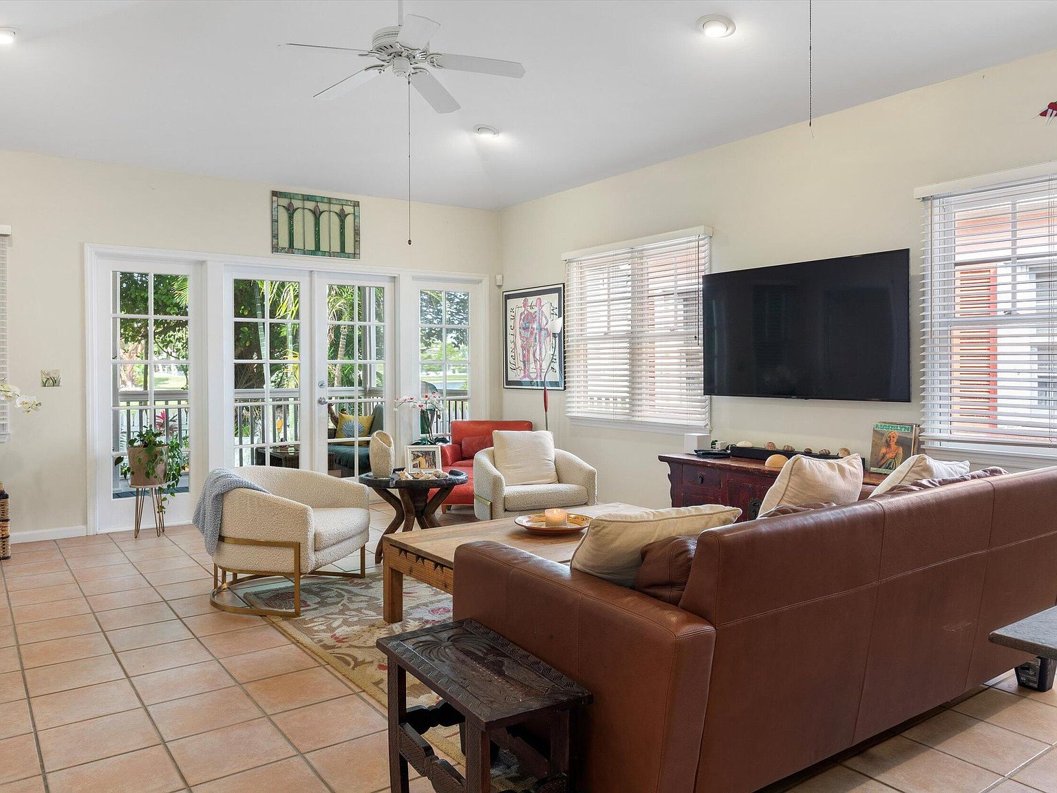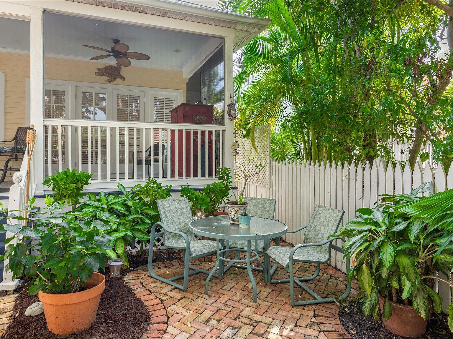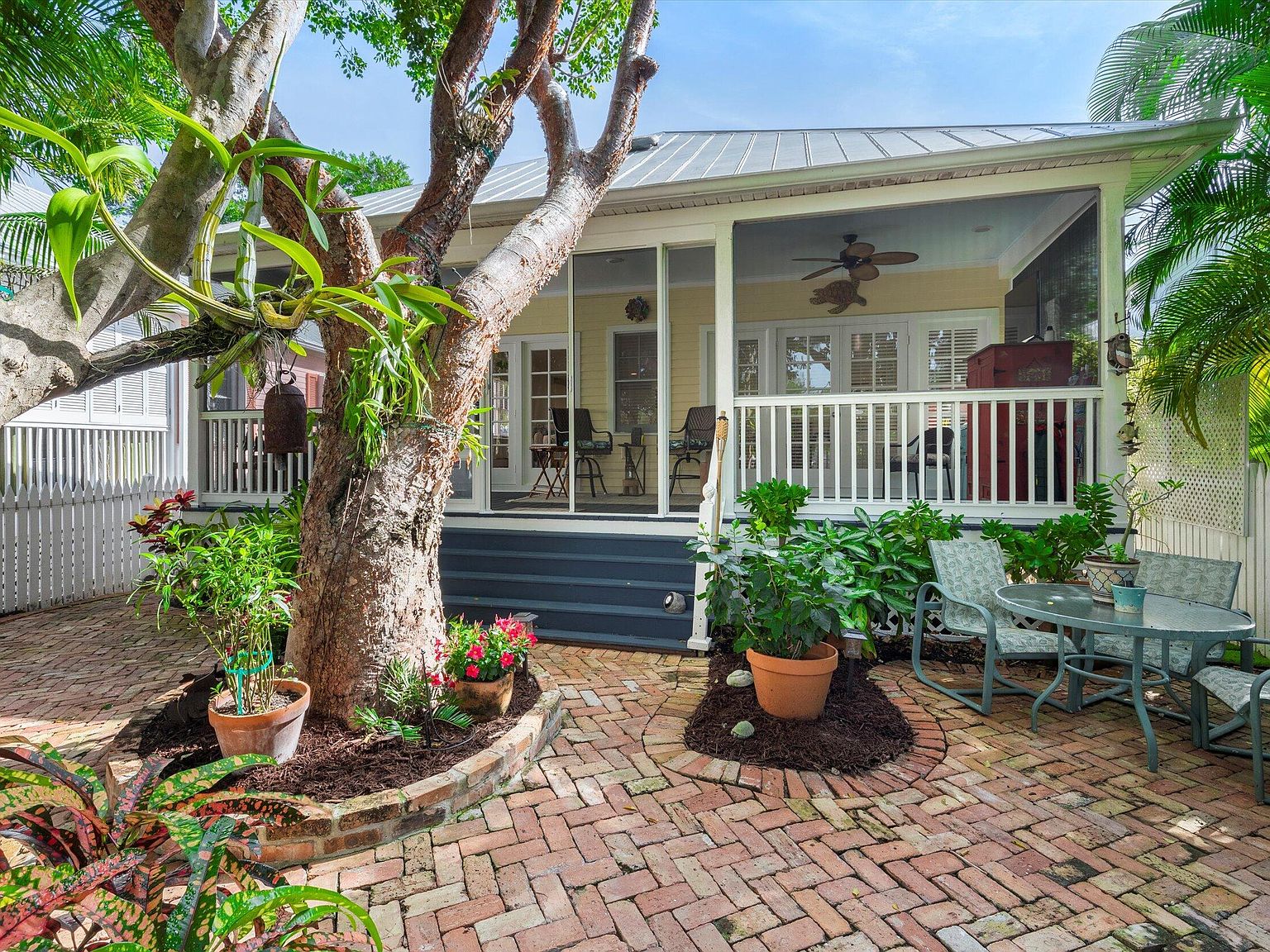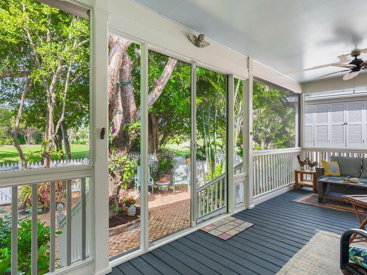 Nestled within the prestigious Key West Golf Club, a rare opportunity beckons with this exceptional single-level home, one of only four of its kind in the golf course. Designed for effortless living and entertaining, this residence combines the ease of no interior steps with the luxury of a spacious layout and stunning views. Offering a unique blend of privacy, elegance, and serene golf course vistas, this home presents an unparalleled living experience. Upon entry, the home welcomes you with its open floor plan that seamlessly integrates living spaces with the beauty of the outdoors. Freshly painted interior and ceramic tile flooring throughout set a tone of understated elegance. The foyer leads to two guest bedrooms, thoughtfully positioned to offer comfort and privacy. High vaulted cathedral ceilings amplify the sense of space and light, while wooden blinds and lots of windows ensure a bright and inviting atmosphere.The heart of the home lies in its main entertaining area, which overlooks the lush greenery of the golf course. The open concept design fosters a sense of community, making it perfect for gatherings or quiet evenings in. French doors open onto a magnificent 30'x10' screened veranda, extending the living space into the outdoors. This veranda offers a splendid vista of the fully bricked large yard, complete with irrigated, lush tropical foliage and the striking presence of a gumbo limbo tree. Situated on a quiet one-way lane, the home offers unsurpassed tranquility, yet is close enough to enjoy the vibrancy of Key West life.
