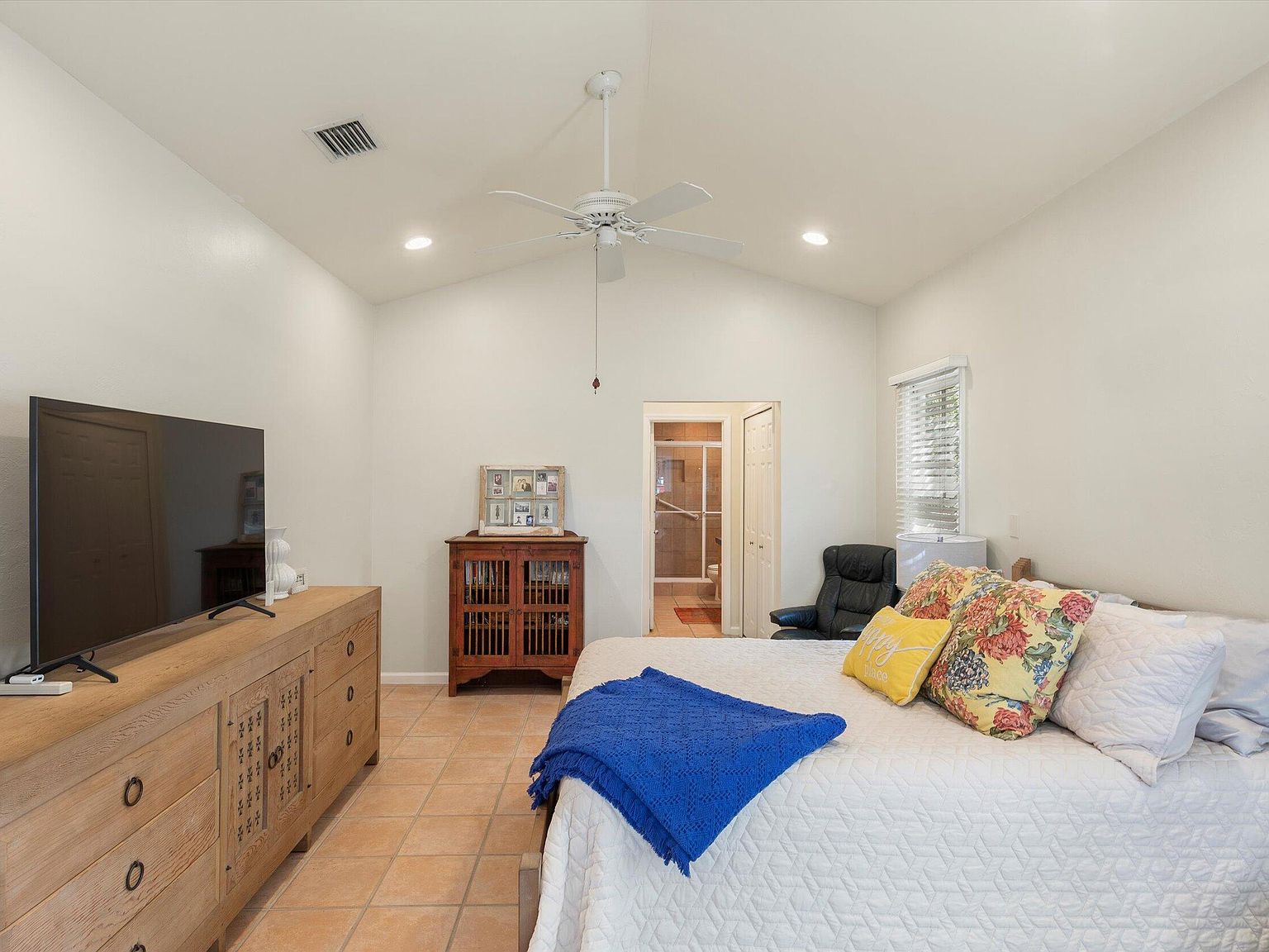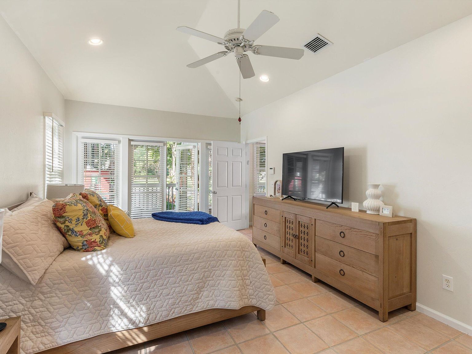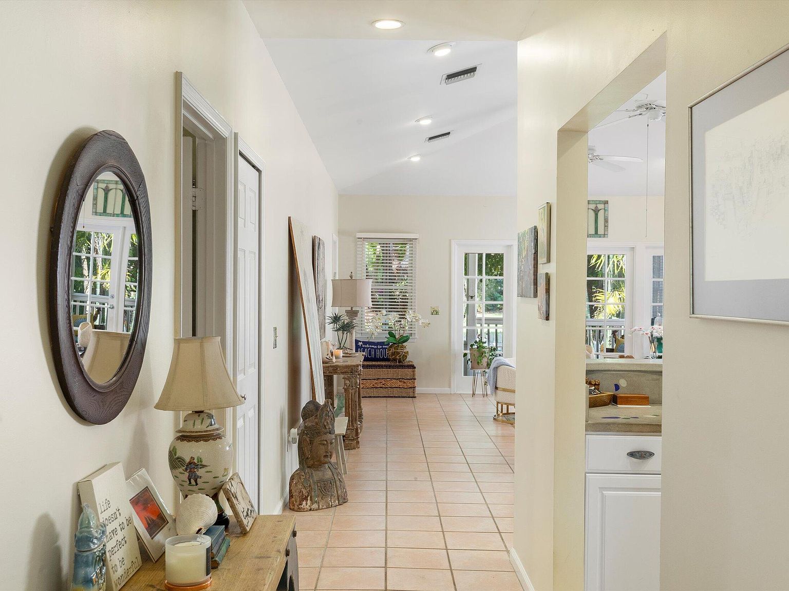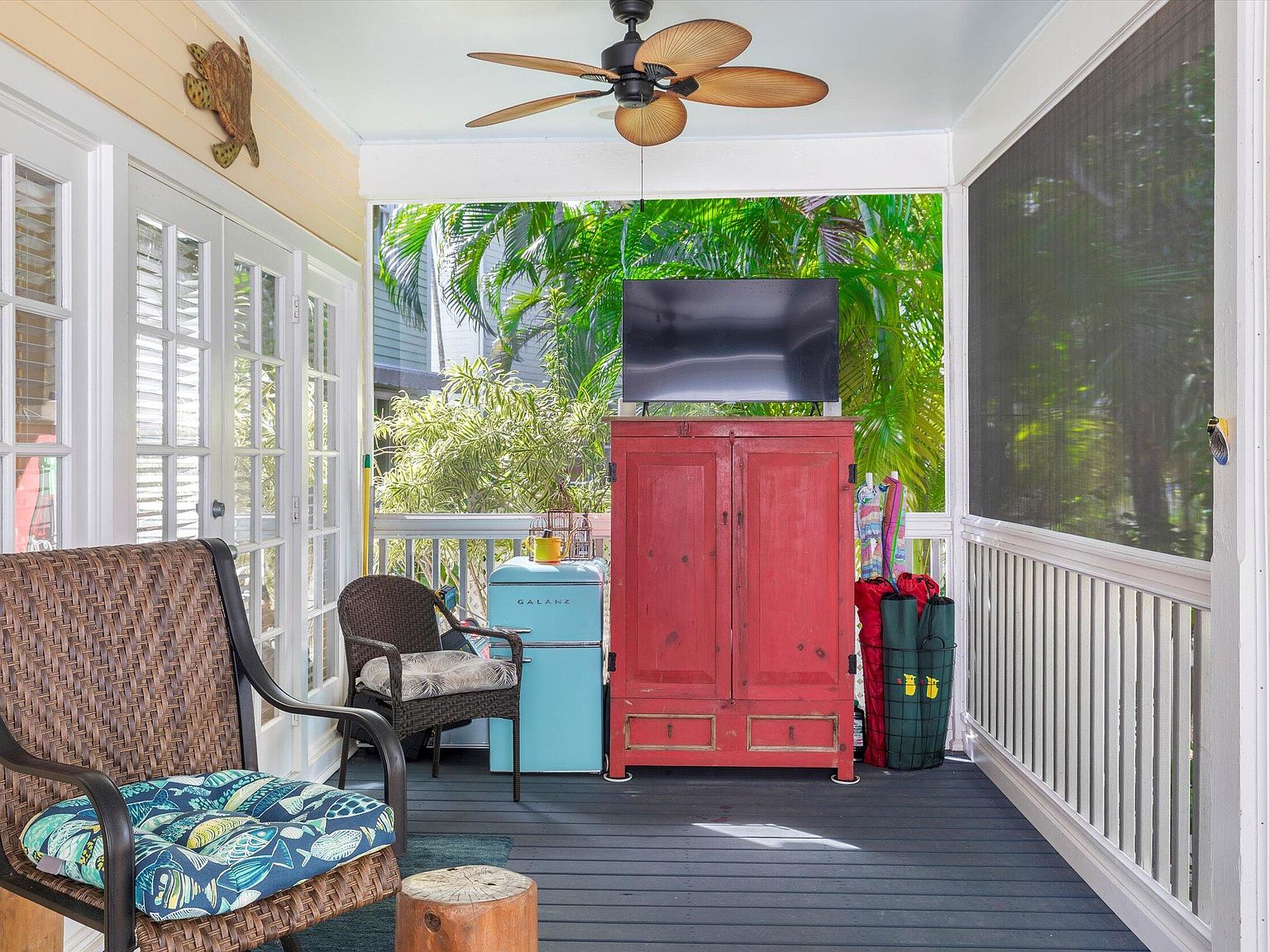 Nestled within the prestigious Key West Golf Club, a rare opportunity beckons with this exceptional single-level home, one of only four of its kind in the golf course. Designed for effortless living and entertaining, this residence combines the ease of no interior steps with the luxury of a spacious layout and stunning views. Offering a unique blend of privacy, elegance, and serene golf course vistas, this home presents an unparalleled living experience. Upon entry, the home welcomes you with its open floor plan that seamlessly integrates living spaces with the beauty of the outdoors. Freshly painted interior and ceramic tile flooring throughout set a tone of understated elegance. The foyer leads to two guest bedrooms, thoughtfully positioned to offer comfort and privacy. High vaulted cathedral ceilings amplify the sense of space and light, while wooden blinds and lots of windows ensure a bright and inviting atmosphere.The heart of the home lies in its main entertaining area, which overlooks the lush greenery of the golf course. The open concept design fosters a sense of community, making it perfect for gatherings or quiet evenings in. French doors open onto a magnificent 30'x10' screened veranda, extending the living space into the outdoors. This veranda offers a splendid vista of the fully bricked large yard, complete with irrigated, lush tropical foliage and the striking presence of a gumbo limbo tree. Situated on a quiet one-way lane, the home offers unsurpassed tranquility, yet is close enough to enjoy the vibrancy of Key West life.
