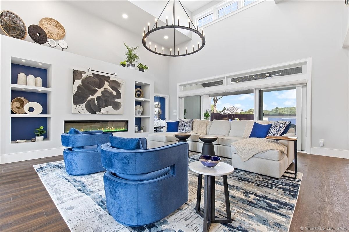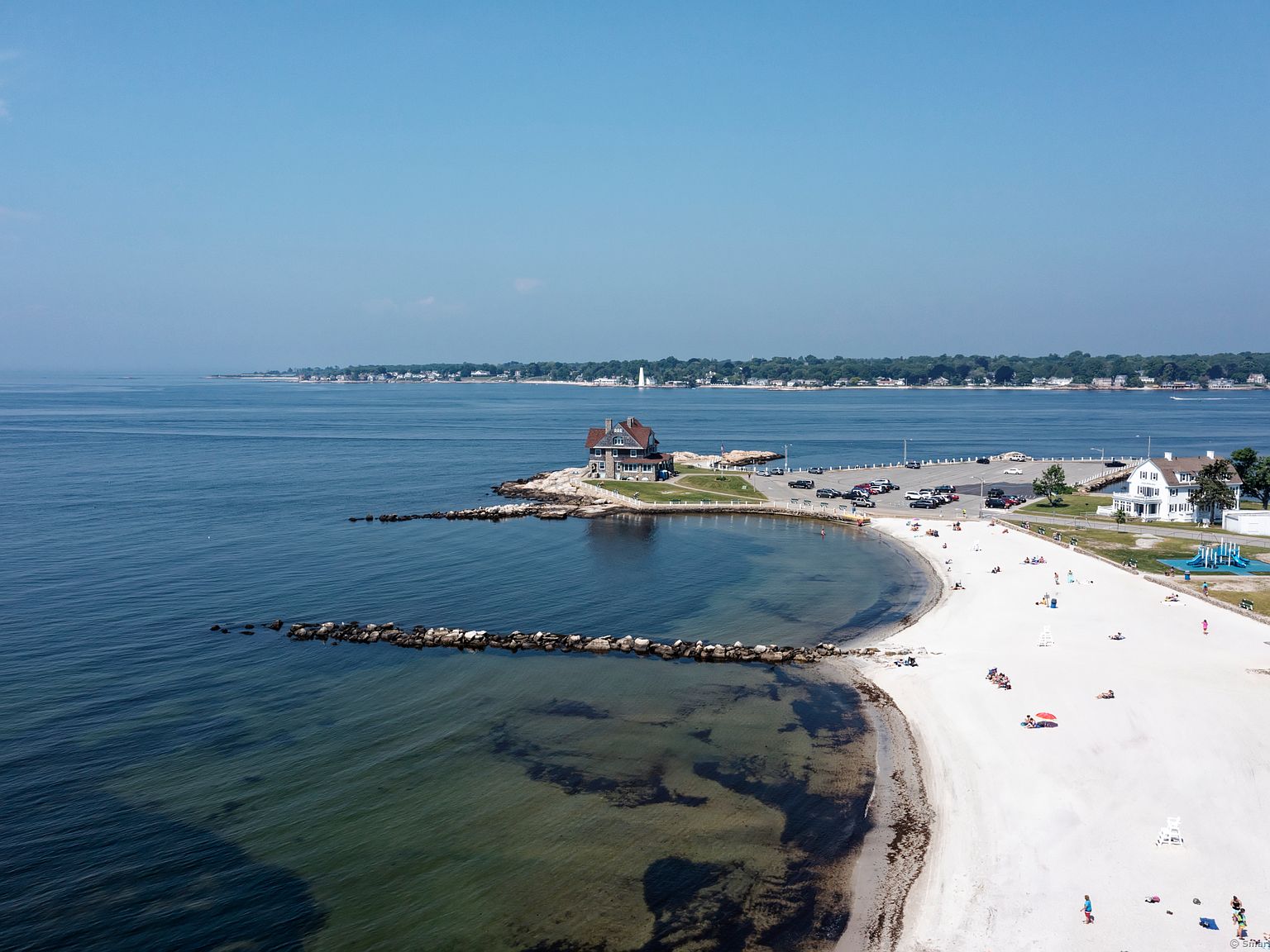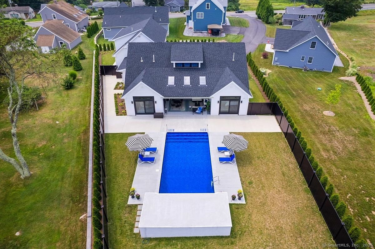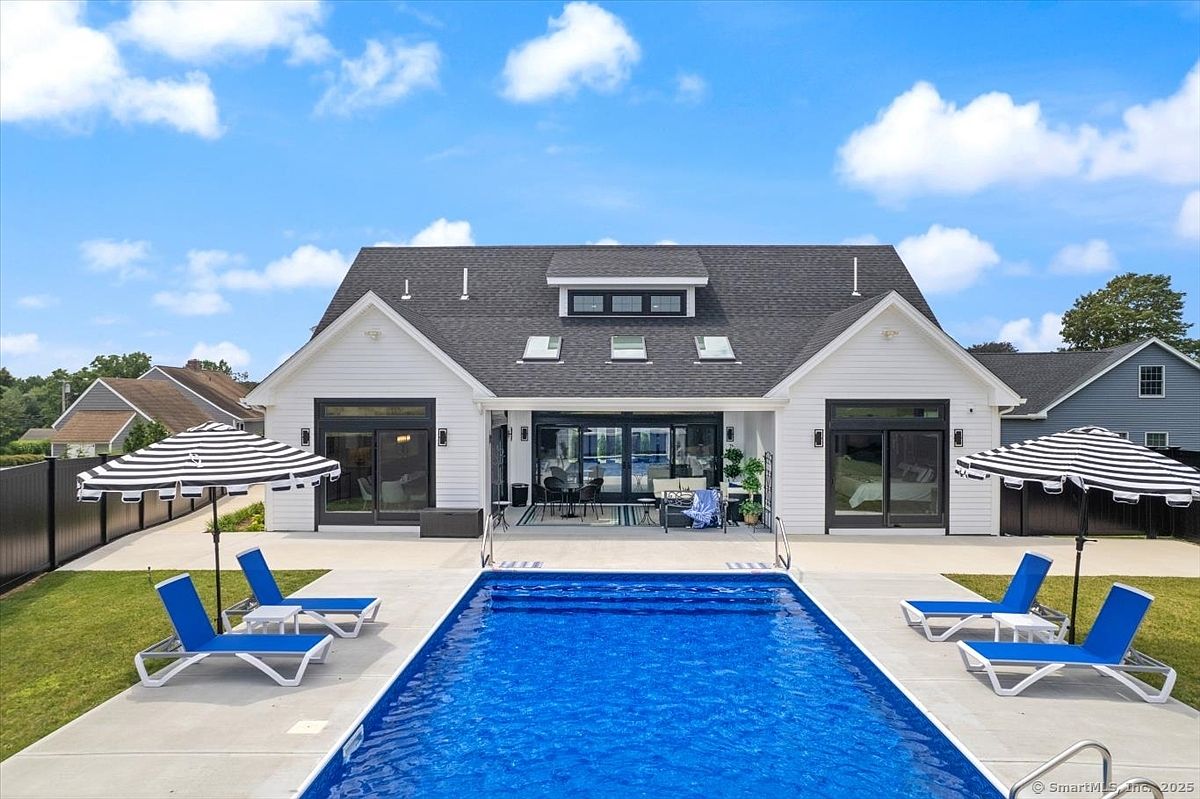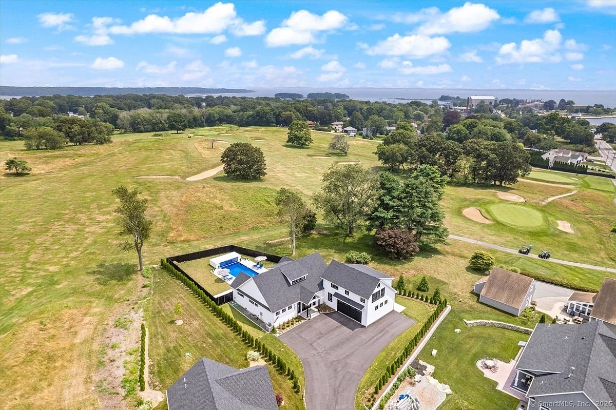 Modern luxury meets coastal charm in this stunning newly built custom home set directly on the picturesque Shennecossett Golf Course facing the 14th hole. Located in the desirable Eastern Point neighborhood, just a short stroll to the waterfront, beaches, and marinas, this home offers an open floor plan with vaulted ceilings, custom built-ins, and a sleek fireplace. You will be impressed by the stylish entrance and the stunning interior that flows to the outdoor patio room and pool deck. The chef's kitchen features a large island, white cabinetry, pantry nook, and opens to a dining area with walls of windows overlooking the backyard oasis. The main-level primary suite includes a walk-in closet, dressing area, and spa-like bath all leading to the convenient full laundry room. Upstairs offers two additional bedrooms, a full bath, and a loft with built-ins plus a luxurious full bath. Enjoy outdoor living relaxing in the covered lanai with fans and dip into the cool blue saltwater pool with a stunning waterfall and rinse off in the outdoor shower. Additional features include shiplap siding, professional landscaping, a two-car garage with epoxy floors and EV hookup. The full basement offers option for more living space. A rare gem offering style, comfort with views and a walker's paradise.