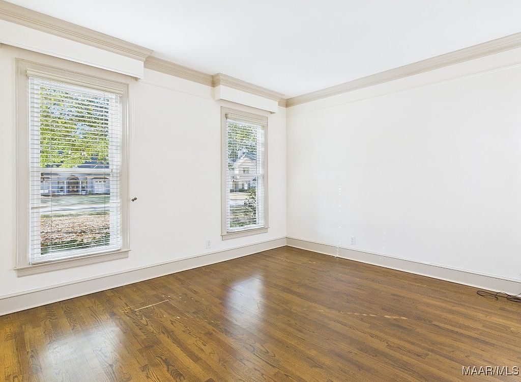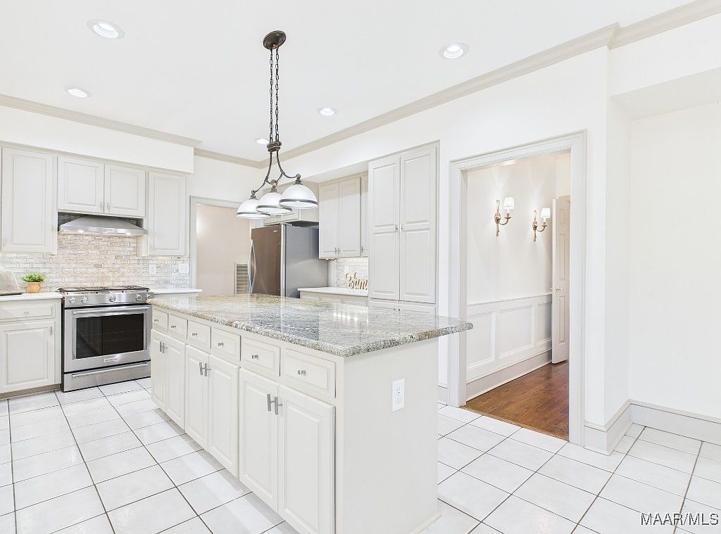 The main floor features real hardwood floors, fresh paint, and detailed molding throughout. The updated kitchen is a standout, offering upscale appliances, solid-surface countertops, roll-out cabinet shelving, a large center island, and abundant storage. An oversized eat-in area with French doors opens to the back patio, making it ideal for everyday living and entertaining.