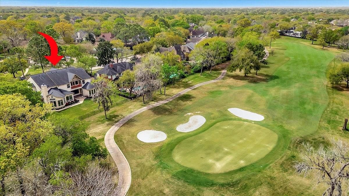 Custom home on the course was inspired by a Texas Hill Country Resort, built of natural limestone and surrounded by native oaks. A soaring foyer leads to a vaulted library with exposed wood beams, knotty pine paneling bookcase wall and expansive windows. Banquet-sized formal dining room offers a butted glass wall framing the view of #6 green BOCC Golf Course. The Cathedral family room with a soaring stone fireplace is open to the morning area and island kitchen. Primary suite and luxurious bath with dual wardrobes and vanities on main level. Four bedrooms up (two are en suite)are spacious, raised game room opens to a golf-view balcony. Wood and slate flooring, three car garages plus porte cochere. 1000+ bottle wine cellar, butler's pantry, two half baths downstairs. Additional play room upstairs. Construction plans are available, the property has never flooded, foundation design is supported by builder's bell bottom piers and home is built of wood and steel framing.