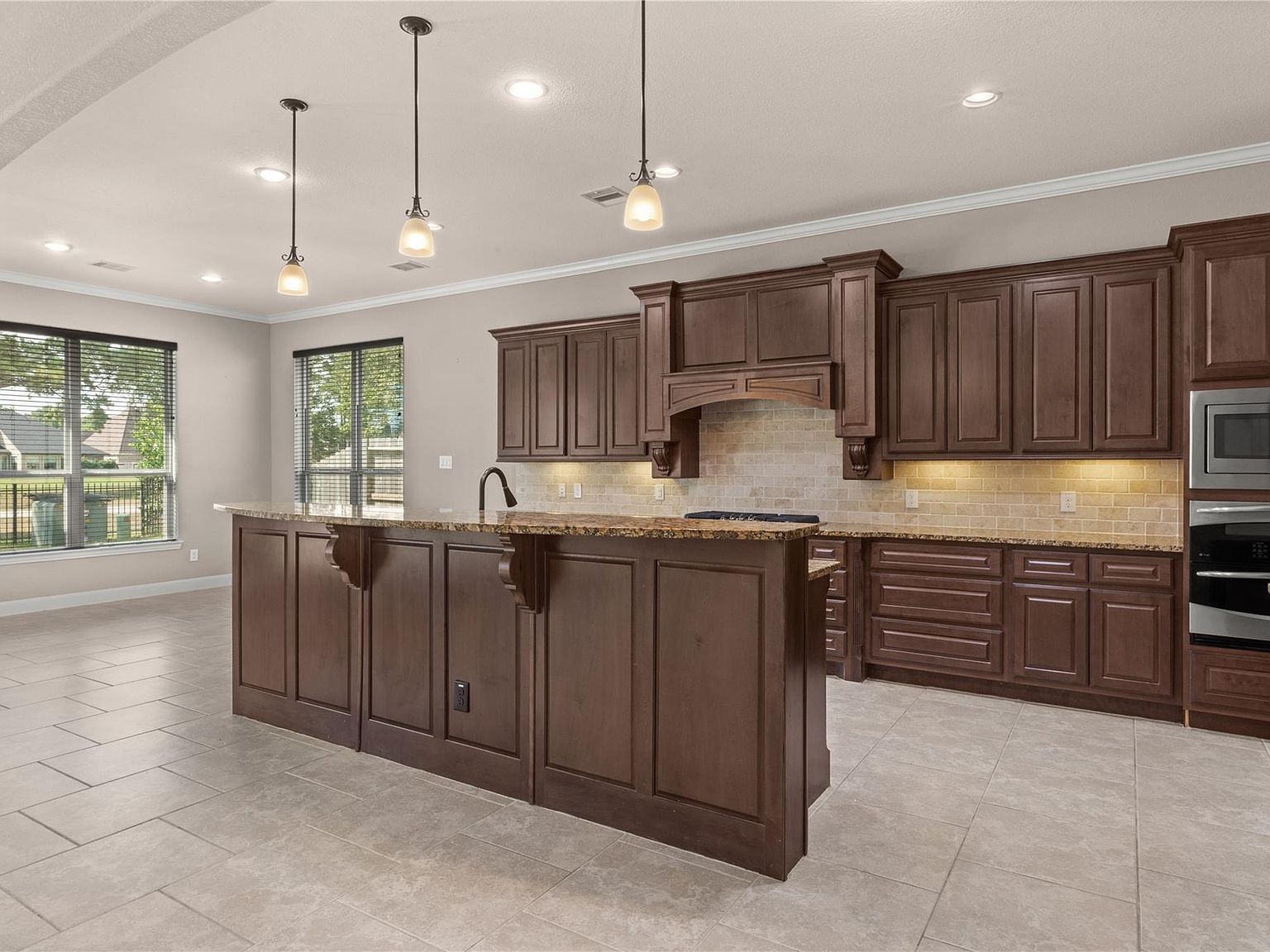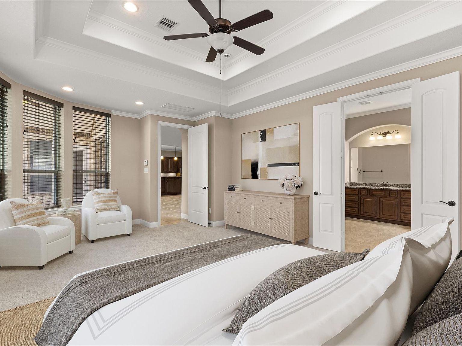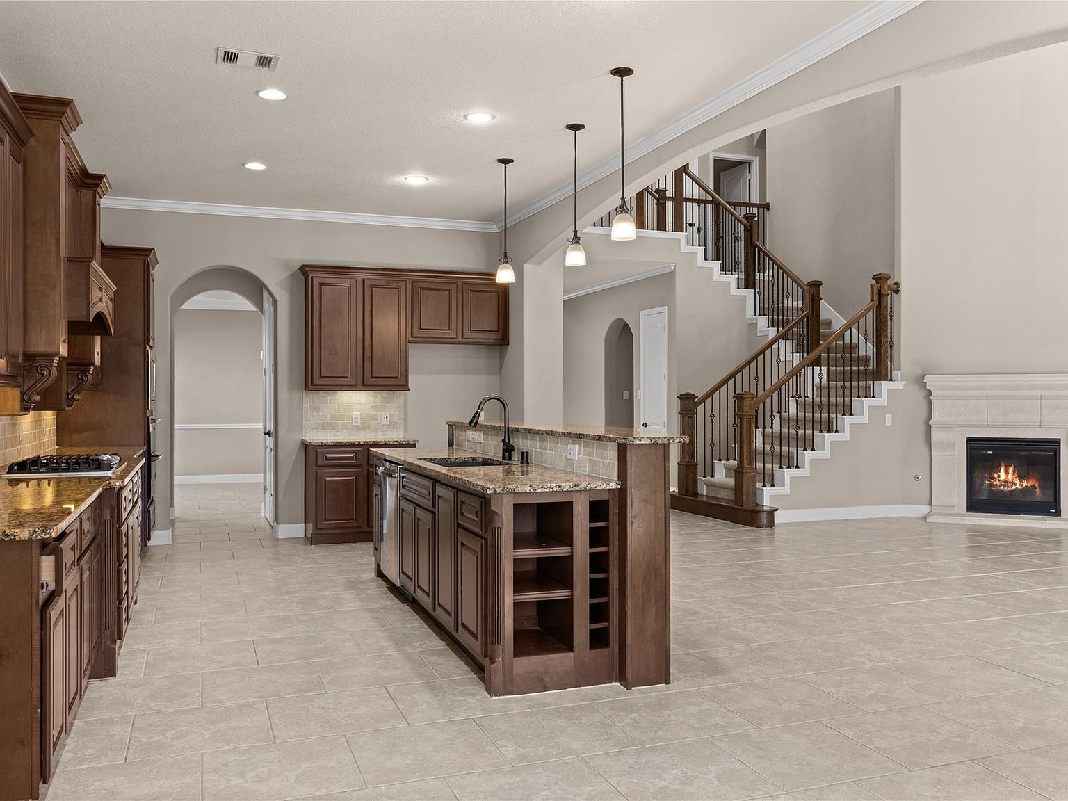 This exquisite property boasts views of the 4th Fairway of the Oakhurst Golf Club. Two primary bedrooms with ensuite bathrooms are located on the main floor, including a luxurious main bedroom with a spa-like bathroom and walk-in closet. The living room features high ceilings, while the chef's kitchen is perfect for hosting guests. A study/home office and formal dining room are also on the main floor. Upstairs, you'll find a media room, game room, and three additional bedrooms. The outdoor patio overlooks the golf course, providing a peaceful space for relaxation. Don't miss out on this 4500 square foot home in a family-friendly golf course community, conveniently near 59, shops, and restaurants.