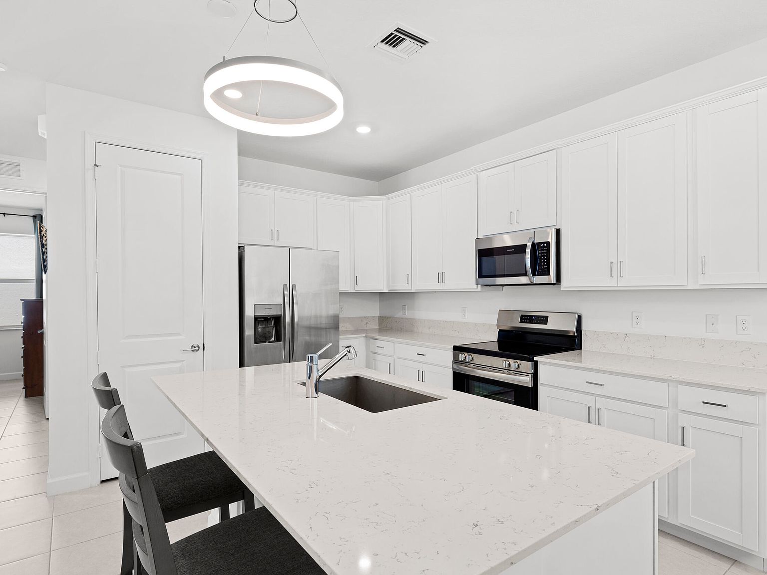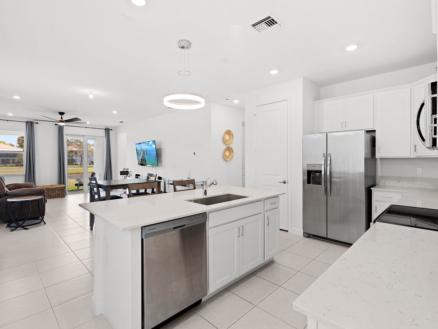 + A BRIGHT, modern kitchen with white QUARTZ countertops, stainless steel appliances, and an ISLAND that faces the lake.