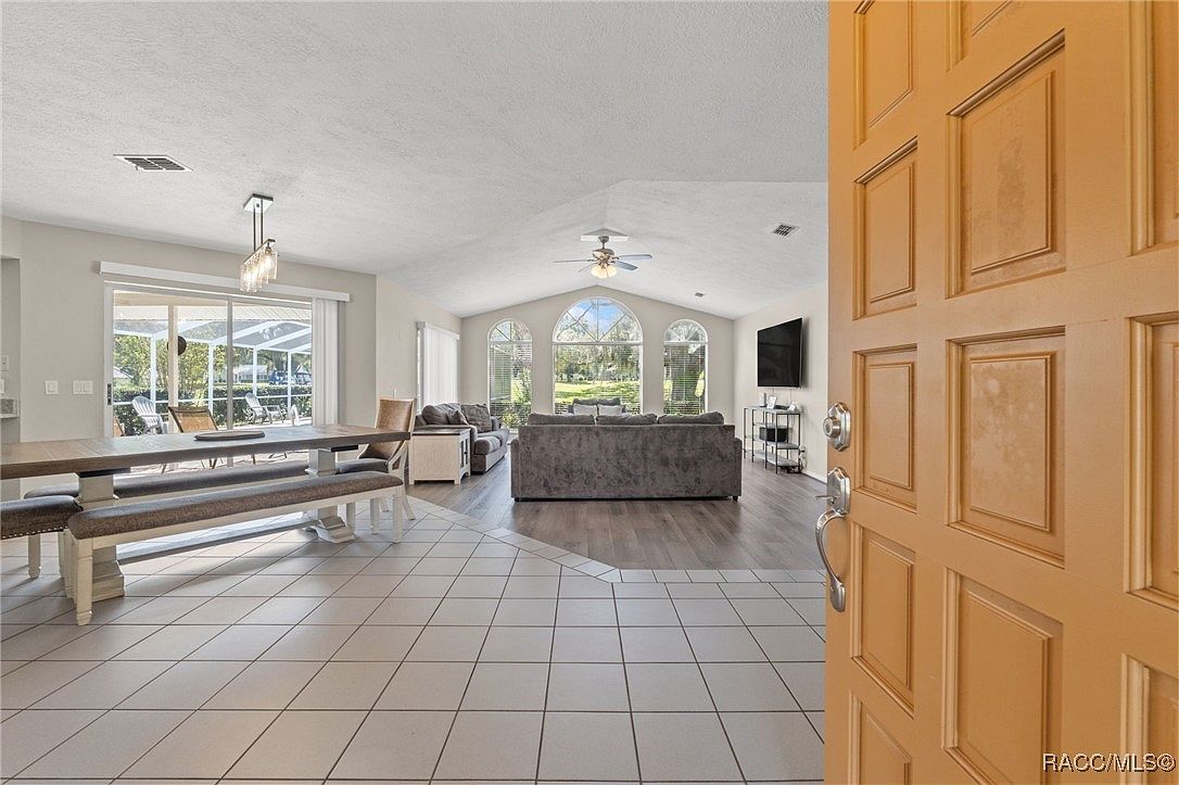 BRAND NEW ROOF TO BE PUT ON BEFORE CLOSE! Discover the perfect blend of comfort, style, and Florida living in this beautiful 3-bedroom, 2-bath, 2-car garage pool home located in sought-after Citrus Hills. Nestled on a half-acre homesite with golf course views, this home features a sunken living room with cathedral ceilings and floor-to-ceiling windows that flood the space with natural light. The open kitchen offers granite countertops, a pass-through to the lanai, and a breakfast bar for easy entertaining. Enjoy a spacious owner's suite with a walk-in closet, dual sinks, and a walk-in shower. On the opposite side of the home, ideal for privacy, are two guest bedrooms, that share a full bath with a tub/shower combo and double sinks, ideal for guests or family. Step outside to your Florida oasis-- featuring an oversized screened, covered lanai, the ideal place to enjoy outdoor living! The expansive paver decking has spots to enjoy the shade or soak up the sun! The heated pool, overlooks the 18th hole — your own private retreat! Surrounded by lush tropical landscaping for beauty and privacy, and ideally located close to shopping, dining, medical centers, trails, rivers, and beaches. This is the Florida lifestyle you've been dreaming of!