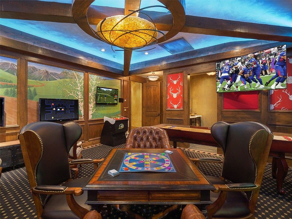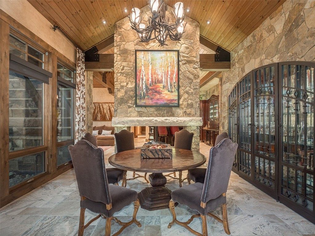 The home boasts 10 fireplaces, including two outdoors, five in ensuites, and a striking 10-foot stone mason fireplace in the great room. A 300-bottle wine room, multiple wine coolers in the kitchens, and an entertainment level with three TVs and a surround sound system. The design includes exposed structural beams, hand-hewn logs, and a steel and stone exterior finish. Its architectural design ensures that every primary room, offers expansive mountain views.
