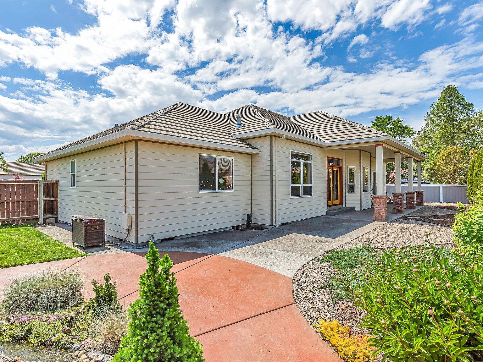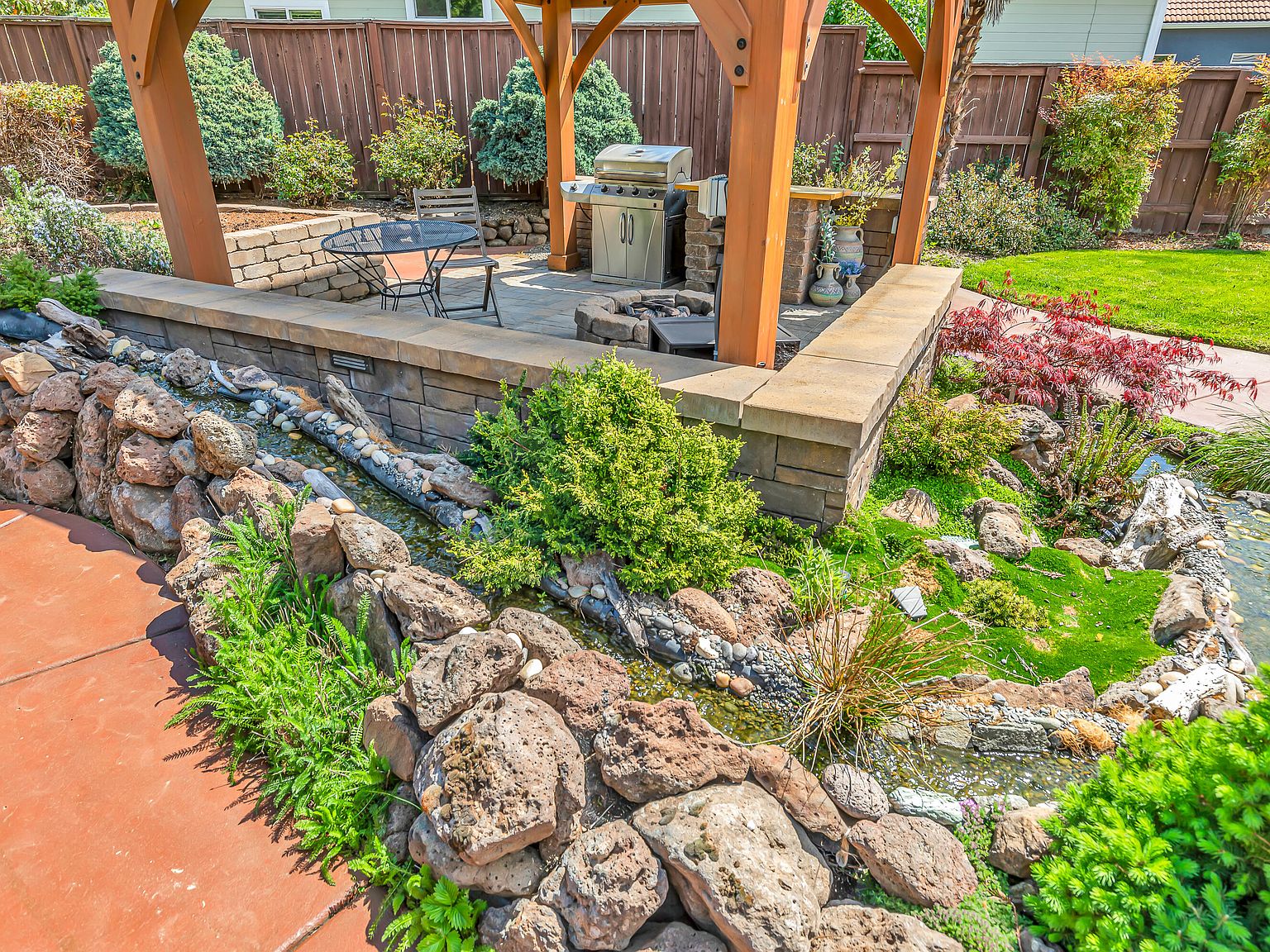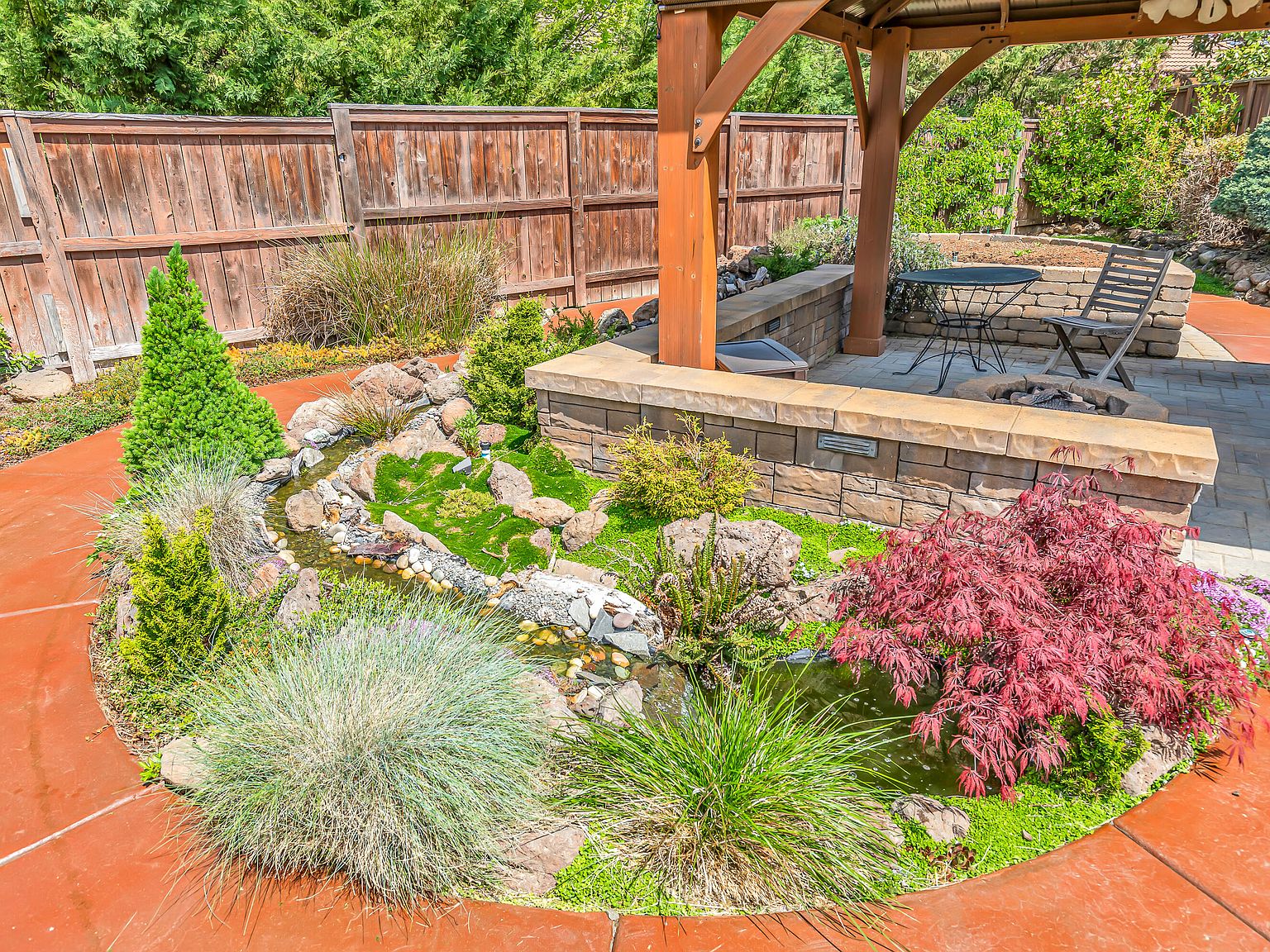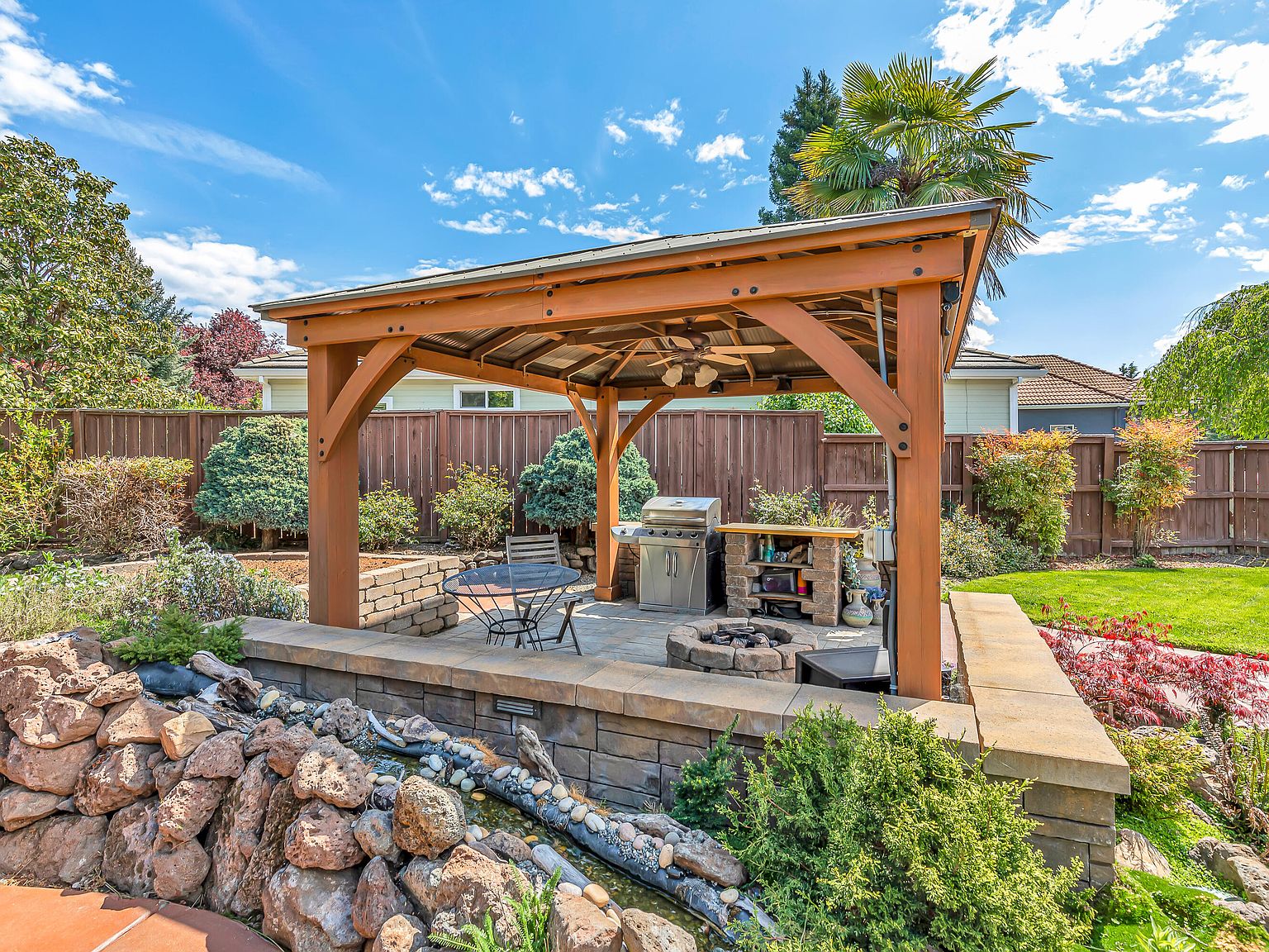 Established secure neighborhood within the Pine lakes subdivision. beautiful surrounding homes all have tile roofs, high-end facades and well maintained landscapes. Quiet cul-de-sac entry to 3 car garage with stained concrete entrance path leading to this grand entry Home. Features include grand foyer w/high arches, adjoining dining & family, open concept with beautiful lighting. Great room with over 11' coffering and gas Lennox fireplace w/custom tile hearth, light and bright with large doors to the covered patio. Split floor plan with large en-suite, coffered 11' ceilings, built-in tub/spa separate step-in shower, double sinks, lrg. 6x12 walk-in closet & access to the private backyard. Outside leads to pathway to; 12 x 14 cedar gazebo, led lighting ceiling fan, propane firepit surrounded by custom concrete and stone to complement outdoor living at its finest, including BBQ grill. All this and more awaits.