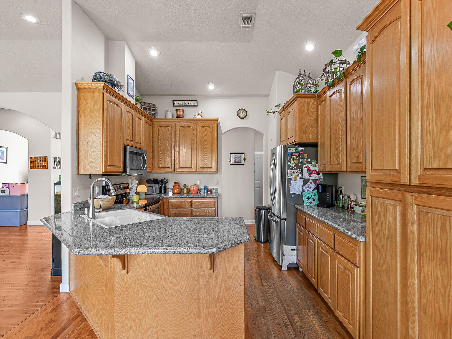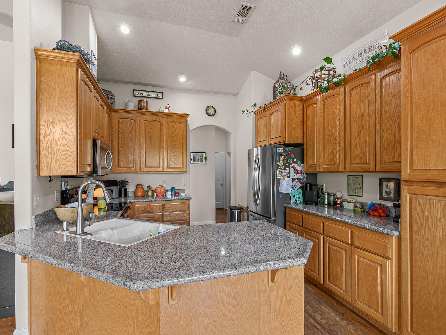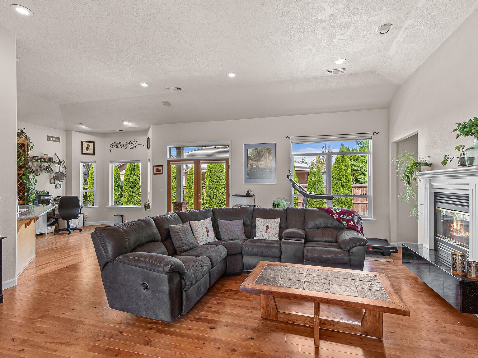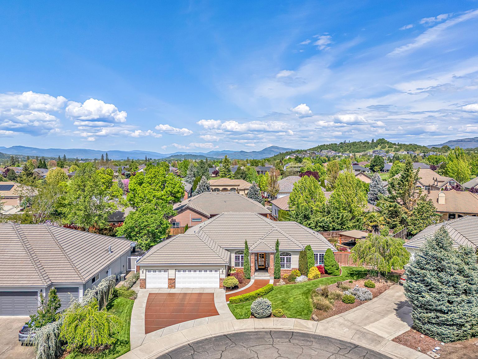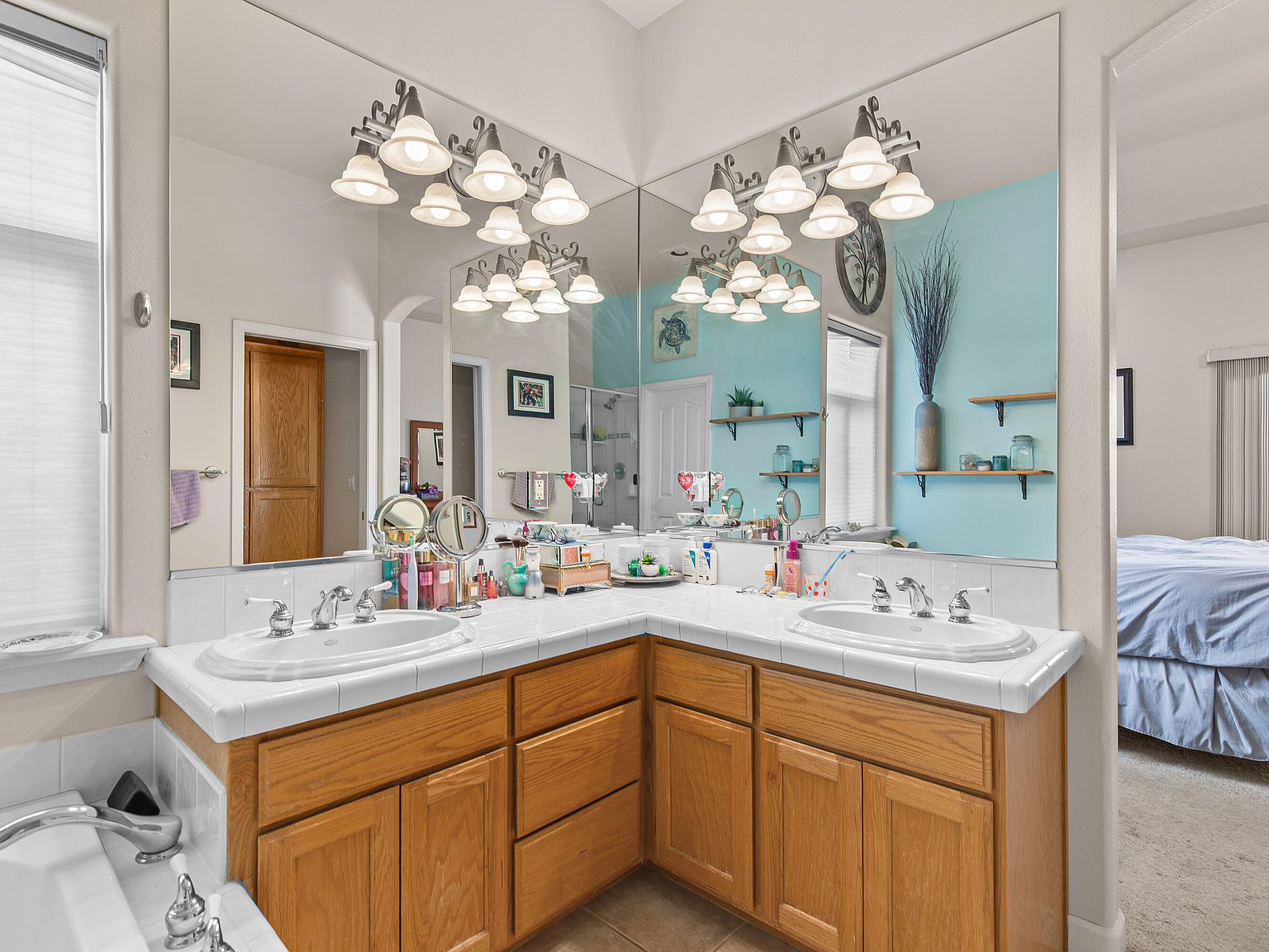 Established secure neighborhood within the Pine lakes subdivision. beautiful surrounding homes all have tile roofs, high-end facades and well maintained landscapes. Quiet cul-de-sac entry to 3 car garage with stained concrete entrance path leading to this grand entry Home. Features include grand foyer w/high arches, adjoining dining & family, open concept with beautiful lighting. Great room with over 11' coffering and gas Lennox fireplace w/custom tile hearth, light and bright with large doors to the covered patio. Split floor plan with large en-suite, coffered 11' ceilings, built-in tub/spa separate step-in shower, double sinks, lrg. 6x12 walk-in closet & access to the private backyard. Outside leads to pathway to; 12 x 14 cedar gazebo, led lighting ceiling fan, propane firepit surrounded by custom concrete and stone to complement outdoor living at its finest, including BBQ grill. All this and more awaits.