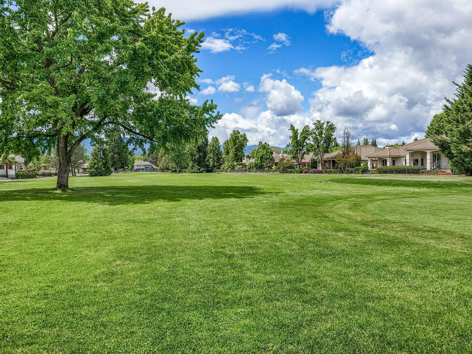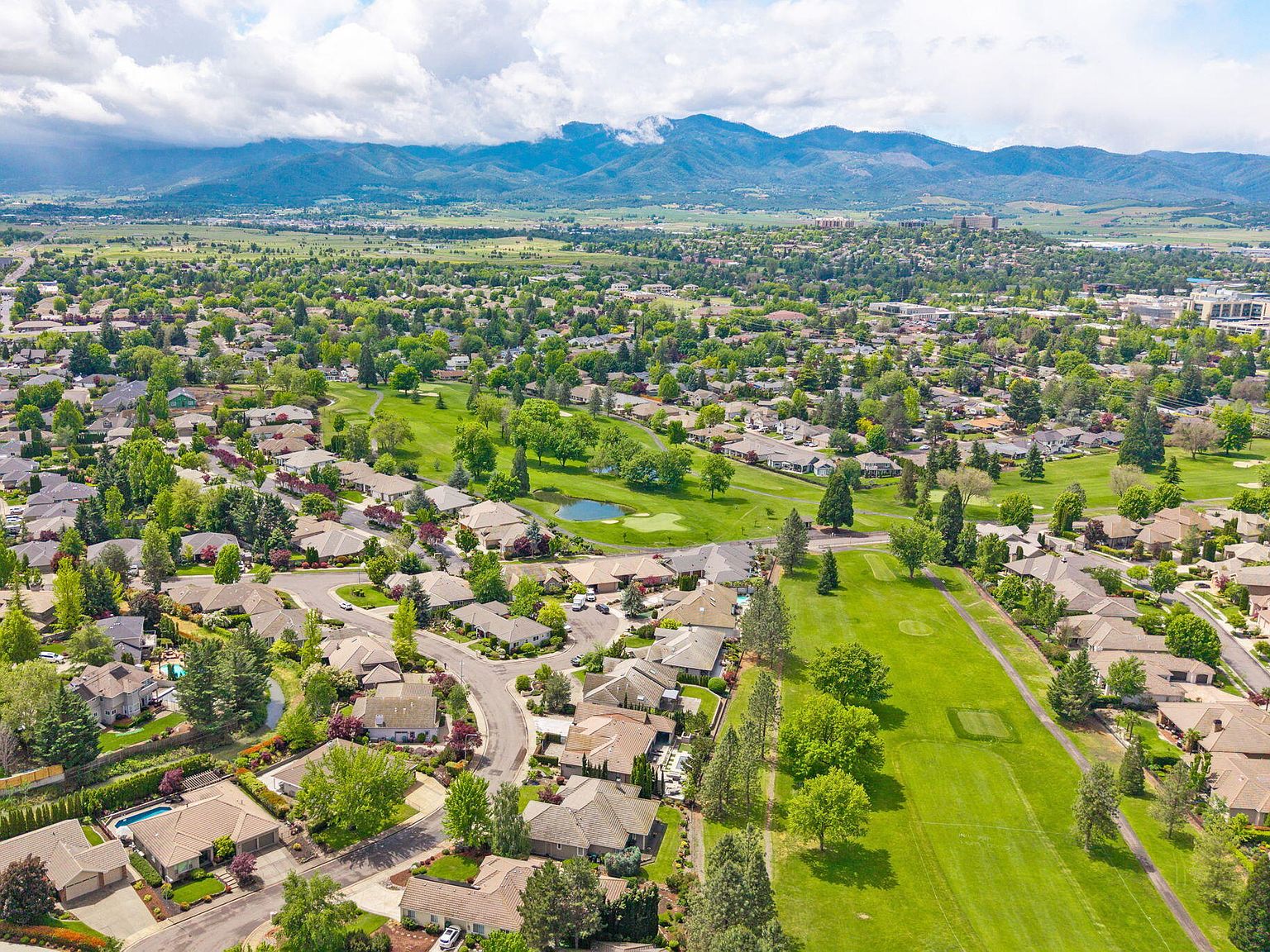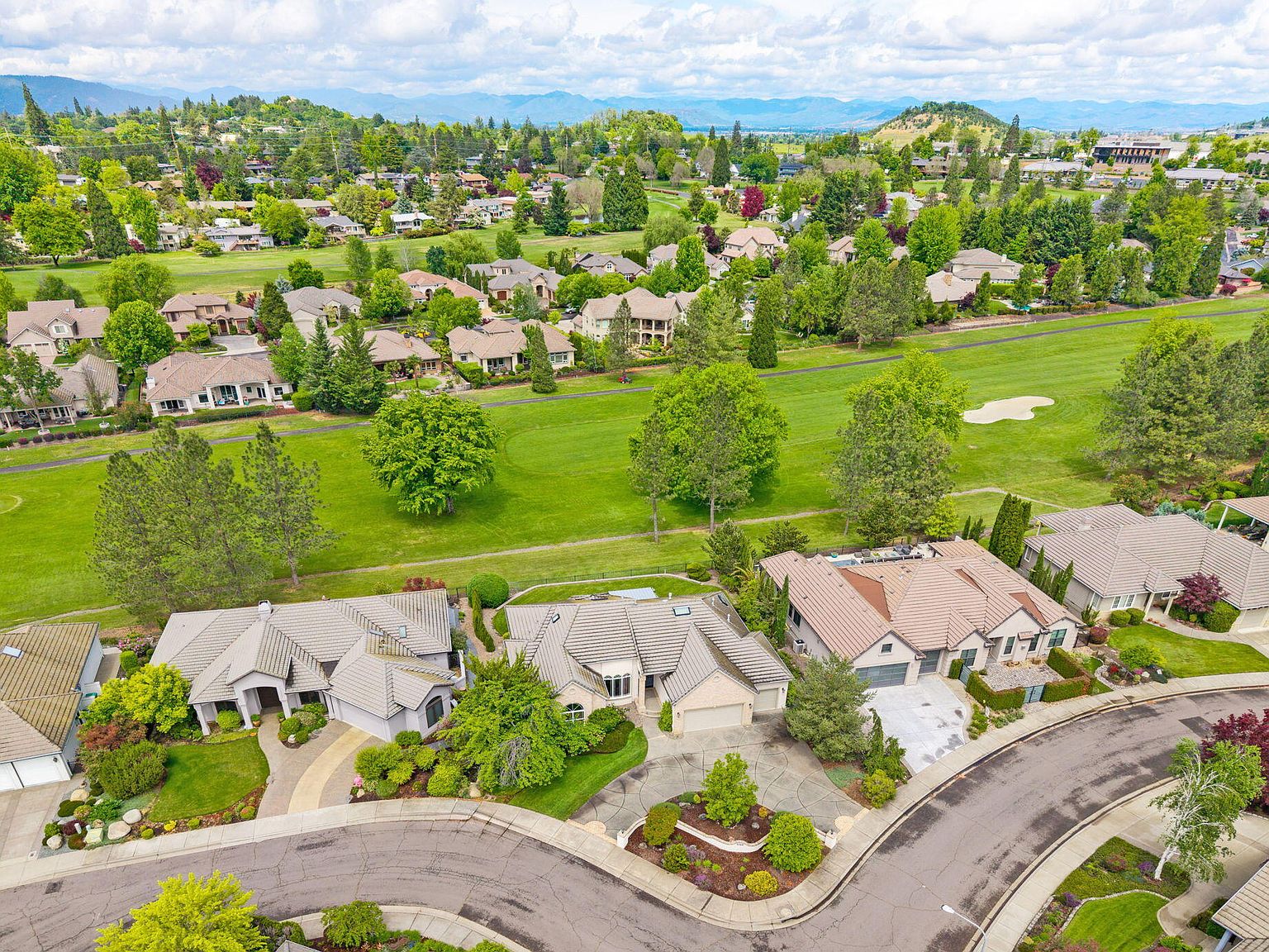 Golf course property! Rare Opportunity to live on the 8th Fairway of Rogue Valley CC. High-end, custom-built Pagnini home with single-level, split floor plan. 3 beds, 2.5 baths, office, dining, living room w/ natural gas fireplace, family room open to kitchen w/ natural gas fireplace, Indoor Laundry w/sink & storage. Modern design w/ soaring ceilings & skylights for natural light. Gourmet kitchen w/ island, Wolf gas range/induction oven, built-in fridge, Bosch dishwasher, walk-in pantry, soft-close cabinets w/ upper/lower lighting. Tastefully Updated w/ leathered granite & quartz counters, crown molding, coffered ceilings, wood floors. Primary suite features dual-head shower, soaking tub, double sinks & walk-in closet. Backyard ideal for entertaining w/ covered patio, sun shade, mounted TV, ceiling fan, built-in bench seating & golf course views. Prime East Medford location near shopping, restaurants, hospital & medical offices.