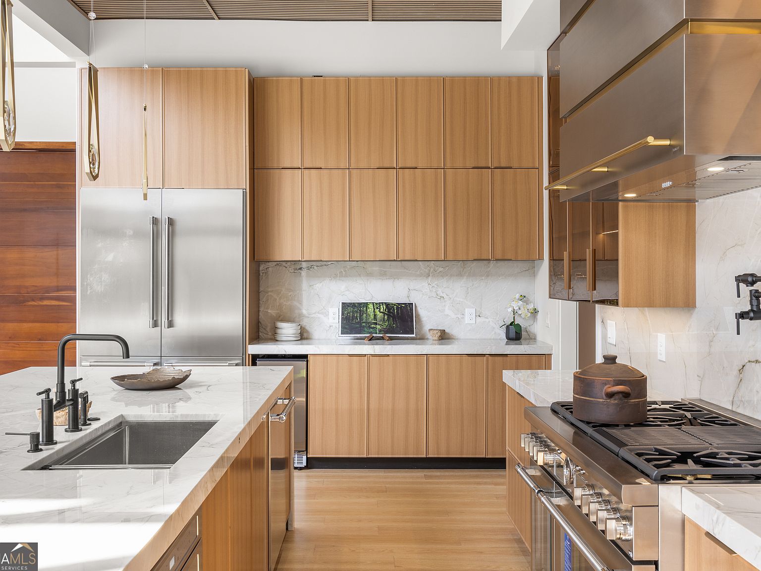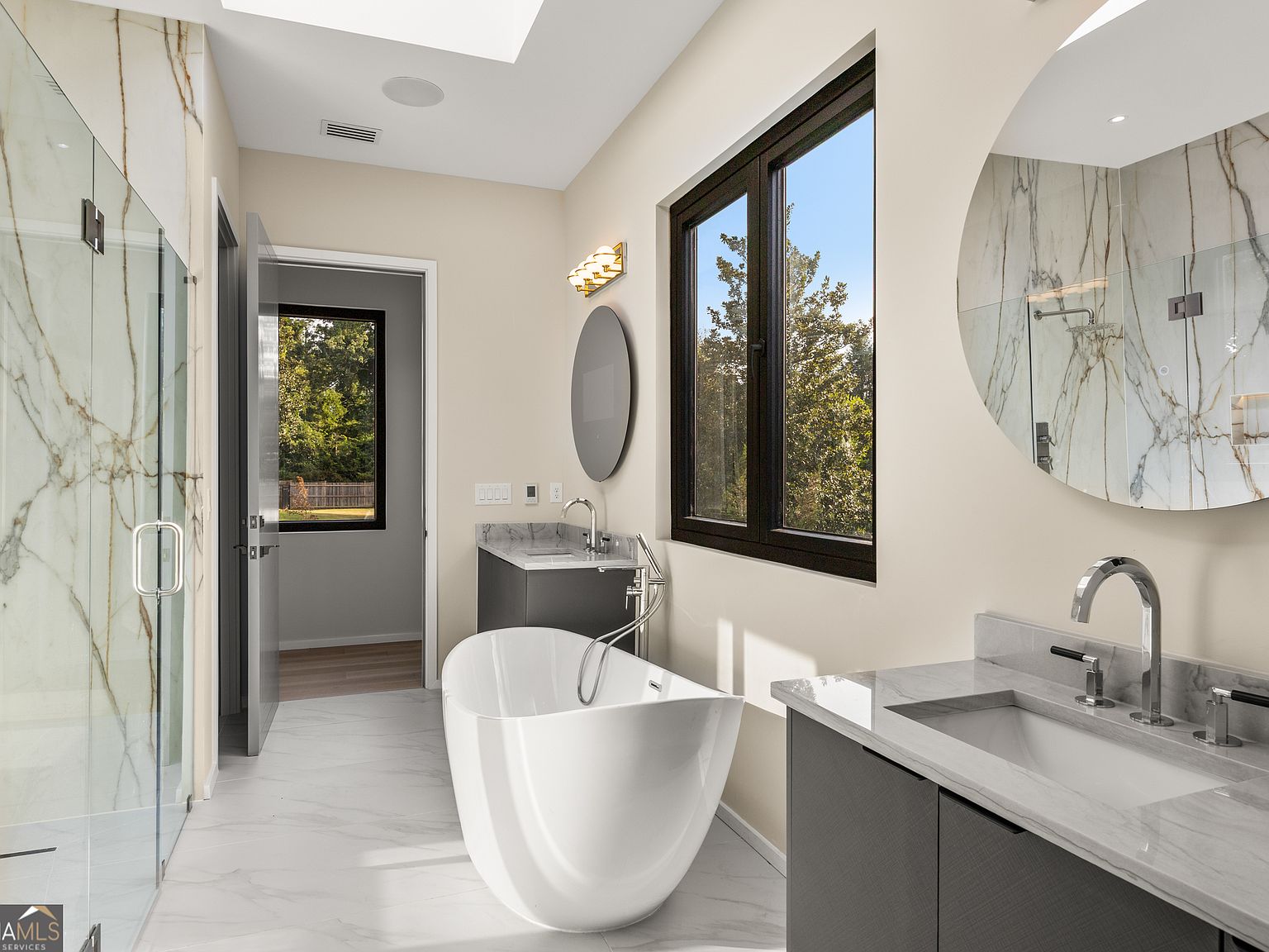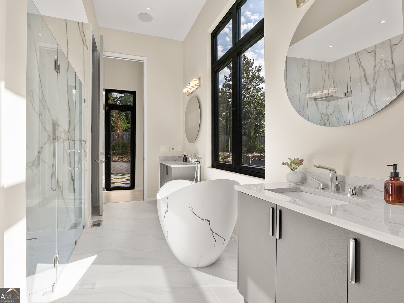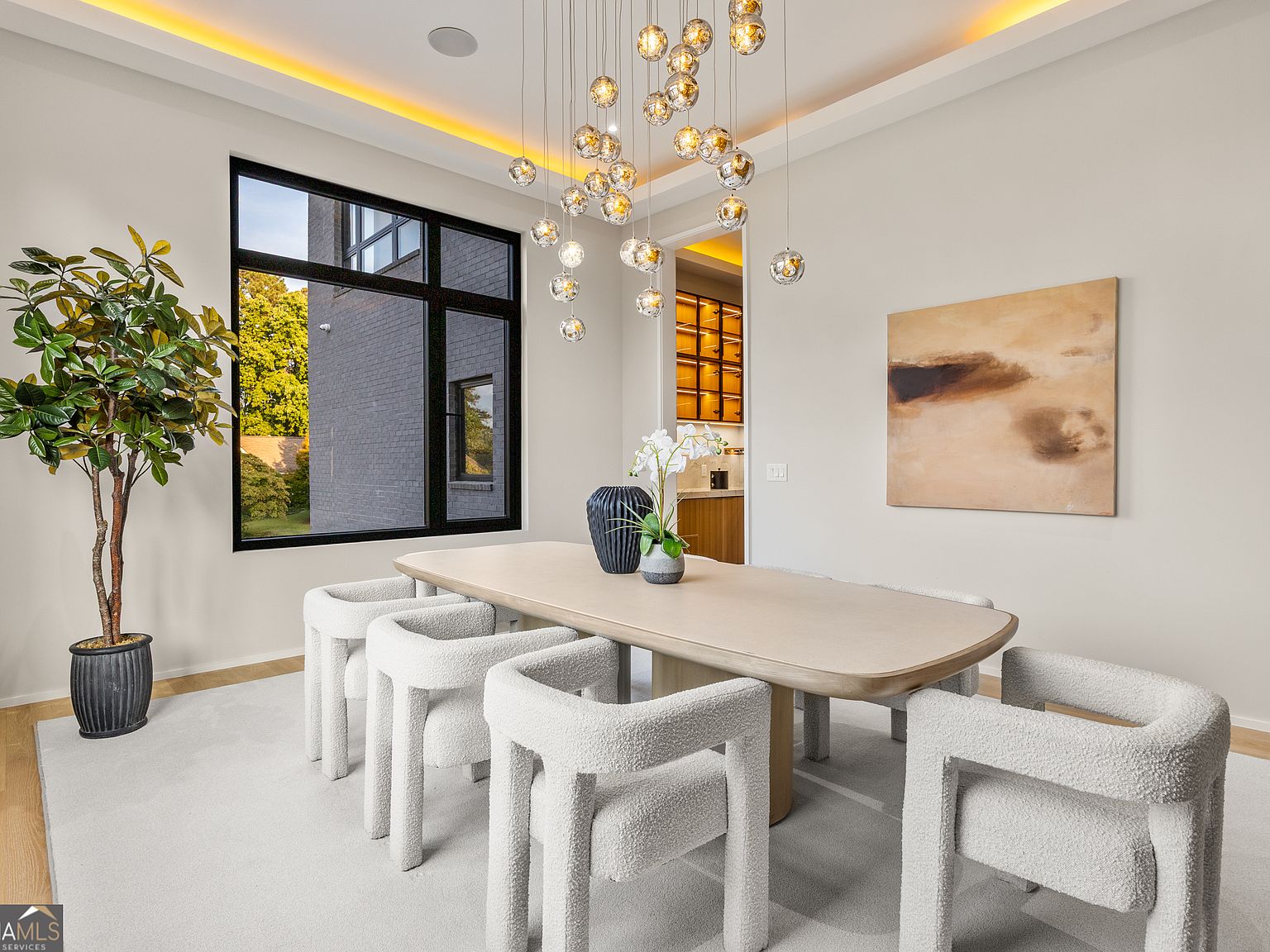 A modern masterpiece of distinction, 4232 Edgewood Court is nestled on a rare 0.75-acre corner lot-one of the largest within the prestigious Indian Hills Country Club-and located in the highly sought-after Walton High School district. Offering six bedrooms, seven full baths, two half baths, and approximately 9,200 square feet across three levels, this newly completed residence pairs sculptural architecture with a full suite of resort-style amenities. From its commanding curb appeal and manicured grounds to sleek casement windows with wood-look panels and curated architectural lighting, every detail reflects thoughtful design and modern luxury. Beyond the grand pivot door, soaring ceilings frame a dramatic foyer and family room where a floating steel staircase with motion-sensor lighting becomes the architectural centerpiece. Premium chandeliers, bespoke built-ins, and a striking fireplace set an atmosphere of elegance and sophistication. The state-of-the-art kitchen blends performance and artistry with custom cabinetry, quartzite waterfall countertops, acoustic wood panels, and commercial-grade appliances. A concealed scullery ensures effortless entertaining, while sleek nano accordion doors expand the living space seamlessly to the outdoors. The main-level primary suite serves as a private retreat, complete with bespoke closets and a lavish spa bath featuring a sculptural stone soaking tub, dual vanities, and designer finishes. Upstairs, the secondary suites are equally impressive, each generously scaled with private en- suite baths. For convenience, two laundry rooms with custom cabinetry are located on both the main and upper levels. Everyday ease is further enhanced by a three-stop elevator and an expansive four-car garage. The finished terrace level lives like a private club, showcasing a temperature-controlled wine cellar, media lounge, state-of-the-art glass-enclosed gym, fully equipped sauna, powder room, and a beautifully appointed guest suite that opens to a tranquil courtyard. Outdoors, the home transforms into a private resort. A saltwater pool with integrated spa and dramatic waterfall feature anchors the backyard, complemented by a cabana, fire pit, and lush green lawns. The setting is both intimate and expansive, designed for gathering, relaxation, and year-round enjoyment. Indian Hills Country Club offers a lifestyle as remarkable as the home itself, with a 27-hole golf course, newly renovated clubhouse, eight tennis courts, and three pools-all moments from shopping, dining, parks, and both public and private schools. A rare convergence of modern architecture, curated amenities, and resort-style living-4232 Edgewood Court is more than a home, it is a private retreat in one of East Cobb's most prestigious enclaves.