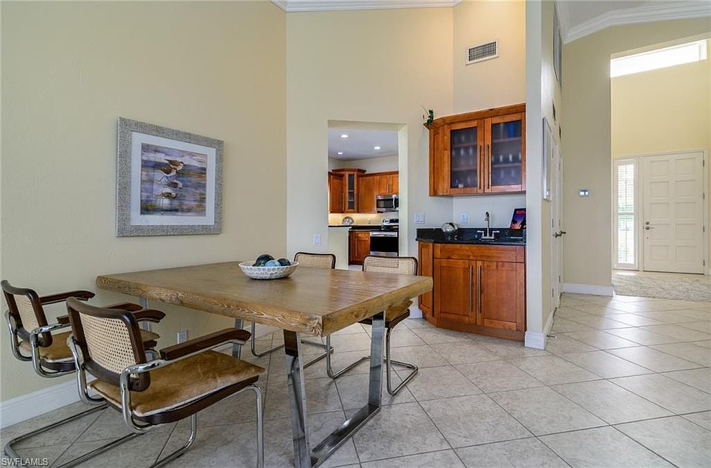 Beautiful Golf Course Setting in a Boutique Community Located within Villa Verona in The Vineyards—an intimate boutique community of just 34 homes—this bright former model residence offers a rare blend of privacy, comfort, and convenience. Featuring 2 bedrooms plus a versatile flex space ideal for a home office, den, or additional guest area, this home is offered turnkey furnished with contemporary décor for effortless move-in living. Enjoy serene landscape and golf course views, stunning sunsets, and a private heated pool from the screened lanai. Inside, soaring 12-foot cathedral ceilings and a wide-open floor plan create spacious, light-filled living areas that live larger than the square footage suggests. Abundant storage throughout adds practical everyday convenience. Whole-home storm shutters add peace of mind. Thoughtful updates include a fully equipped kitchen, modernized bathrooms, and Florida tile flooring. Original owners—no storm damage or flooding ever. Situated just minutes from Crossroads Market with dining, services, Publix, Walgreens, salons, and more, plus Physicians Regional Hospital right next door. A short drive brings you to public golf, Naples' white-sand beaches, Vineyards Community Park, top-rated schools, shopping, dining, and everyday conveniences. Immediate golf memberships are available at The Vineyards, which includes access to a 36-hole PGA Championship golf club, tennis, pickleball, bocce, a fitness center, and spa with a lap pool, social events, and more. Lifestyle memberships are also available. Perfect for full-time or seasonal living—an exceptional opportunity in one of Naples’ most sought-after locations.