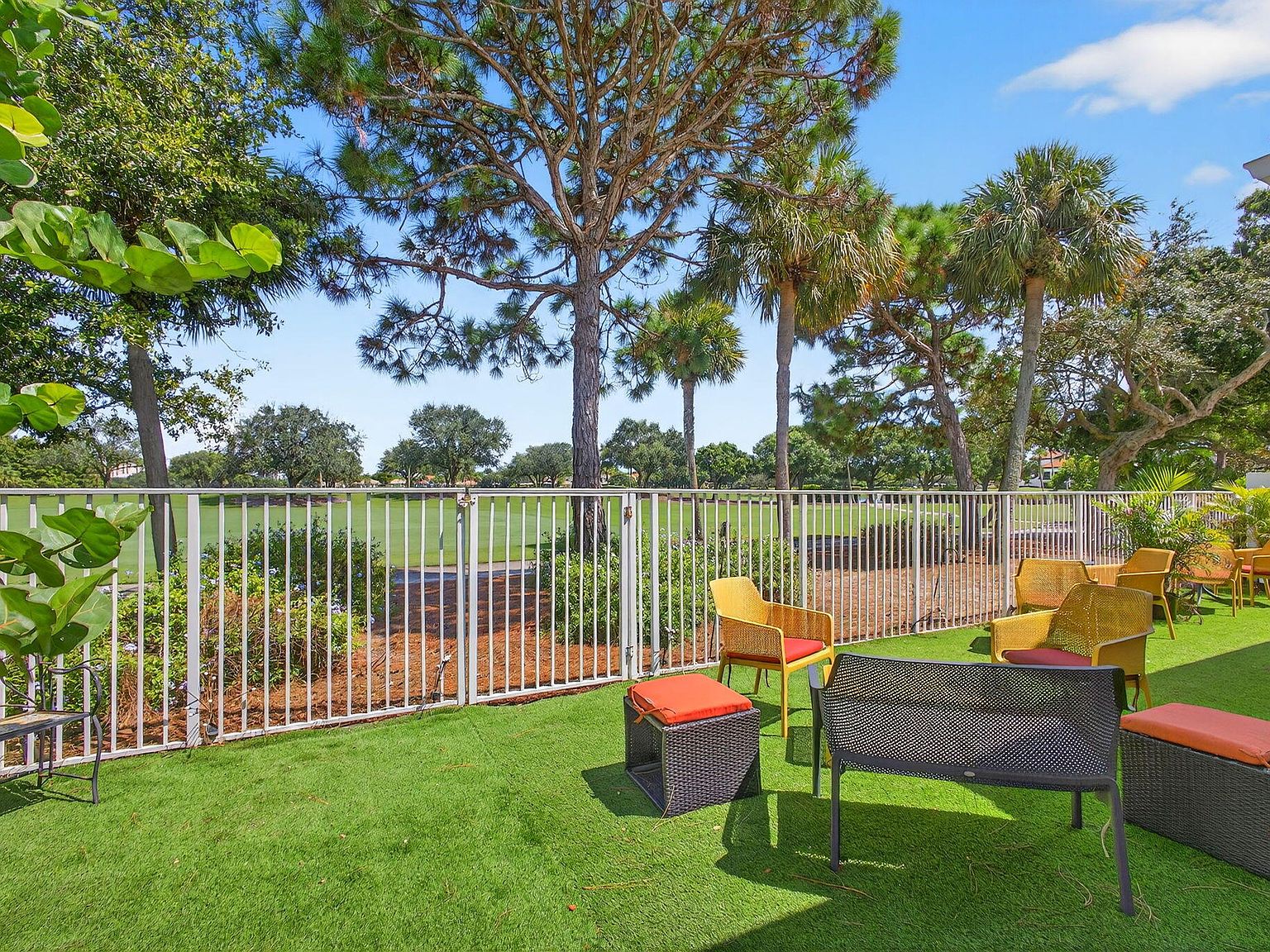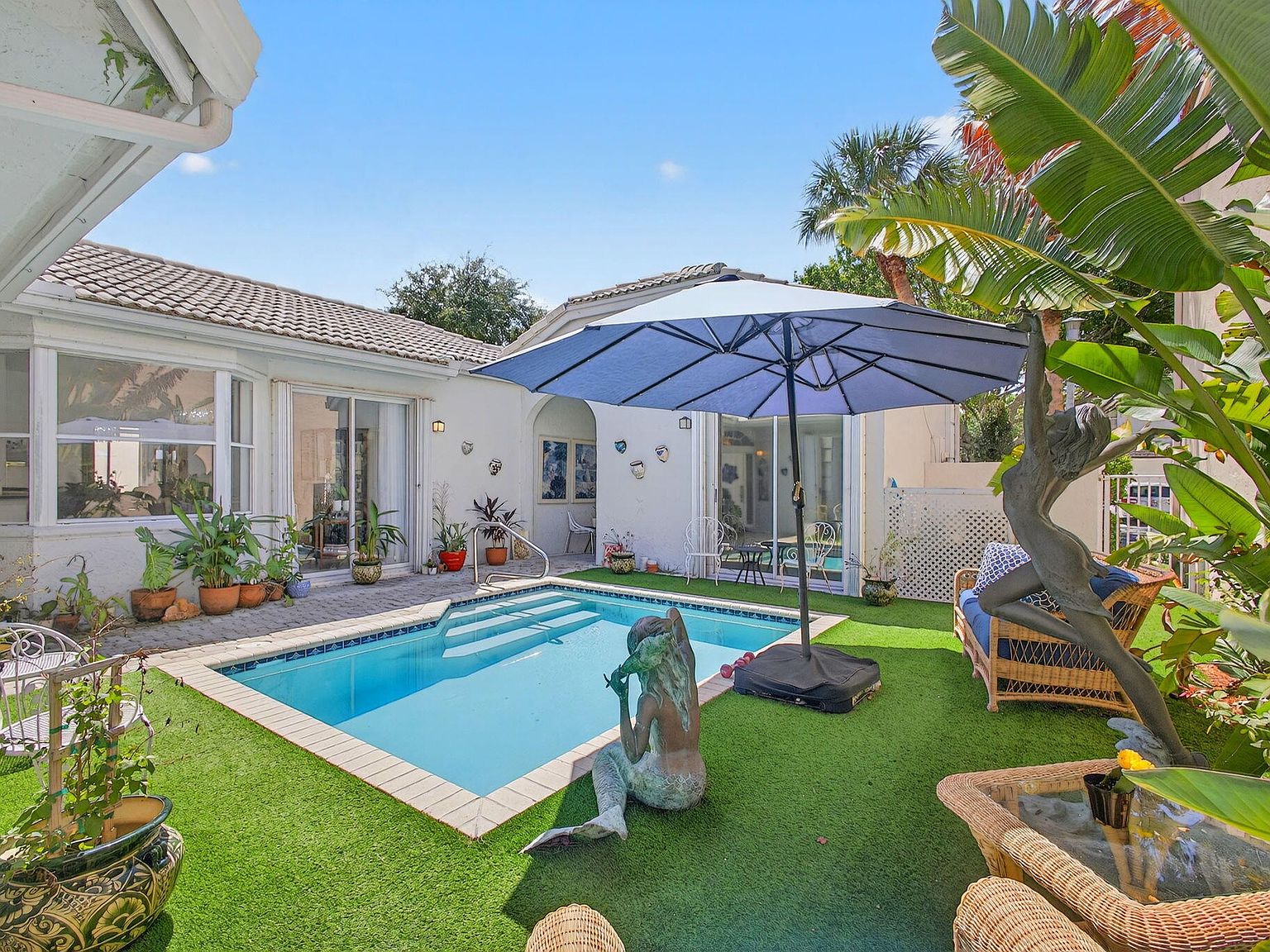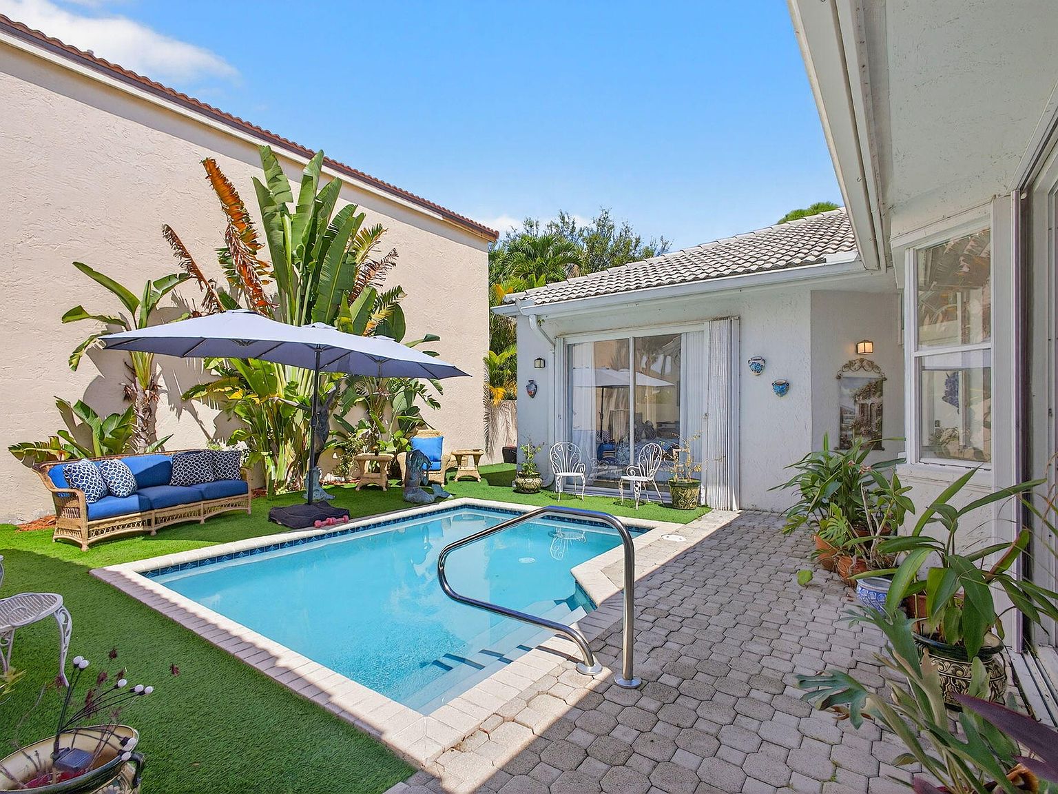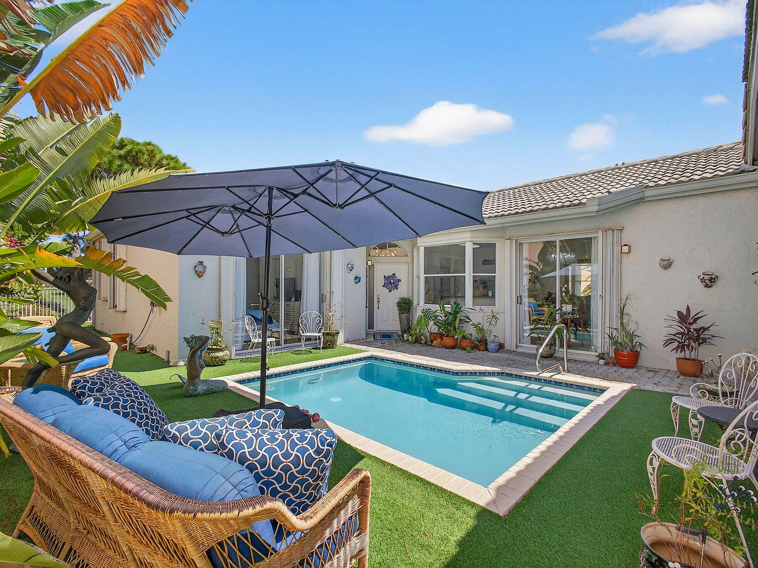 Rarely available single-story courtyard home perfectly situated on a private golf course lot! Experience the best of South Florida living with this distinctive floor plan, where the heart of the home opens to a private courtyard and sparkling pool surrounded by lush tropical landscaping. Start your mornings with coffee overlooking the tranquil fairways or unwind poolside in total privacy. The main residence boasts 2 bedrooms and 2 bathrooms, filled with natural light and highlighted by wood and tile flooring (no carpet!) The open airy design seamlessly blends indoor comfort with picturesque golf course views, creating a home that is both inviting and unique. The kitchen has been tastefully updated with plenty of cabinetry, Corian countertops, and an oversized stainless steel Kitchen Aid refrigerator - ideal for everyday cooking or hosting family and friends. A cozy breakfast nook with bay window, light-filled dining area, and spacious living room with sliders to the outdoor patio make the home feel open and welcoming. The primary suite is a relaxing retreat with 2 closets, direct access to the pool and a large bathroom featuring dual vanities, a Roman tub and separate shower. A comfortable guest bedroom and updated bath with a frameless glass tile shower complete the main home's generous living space.