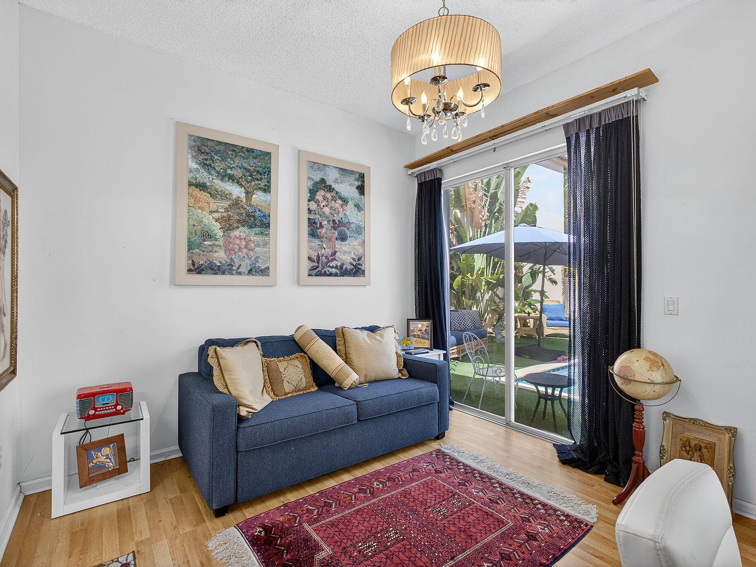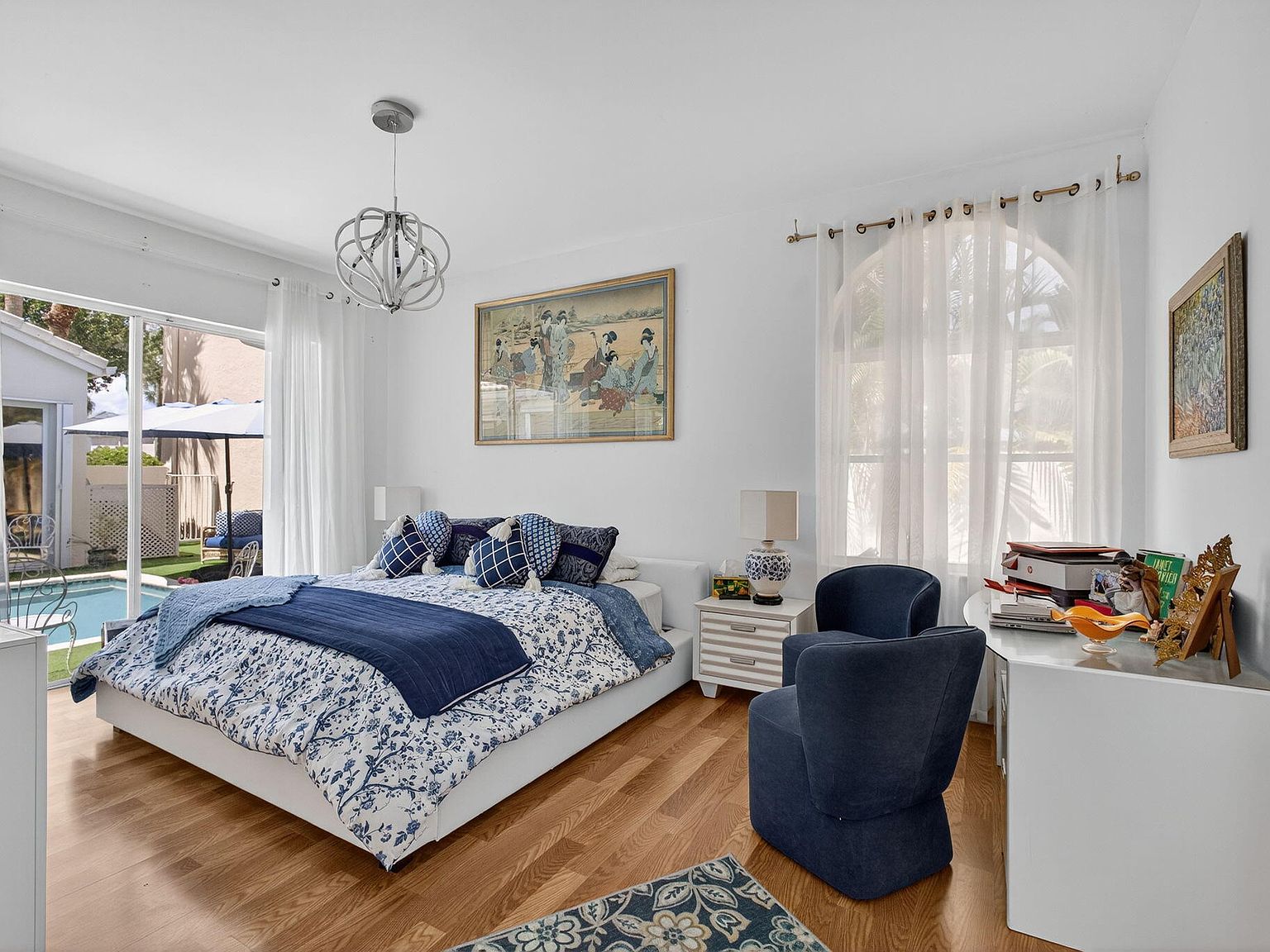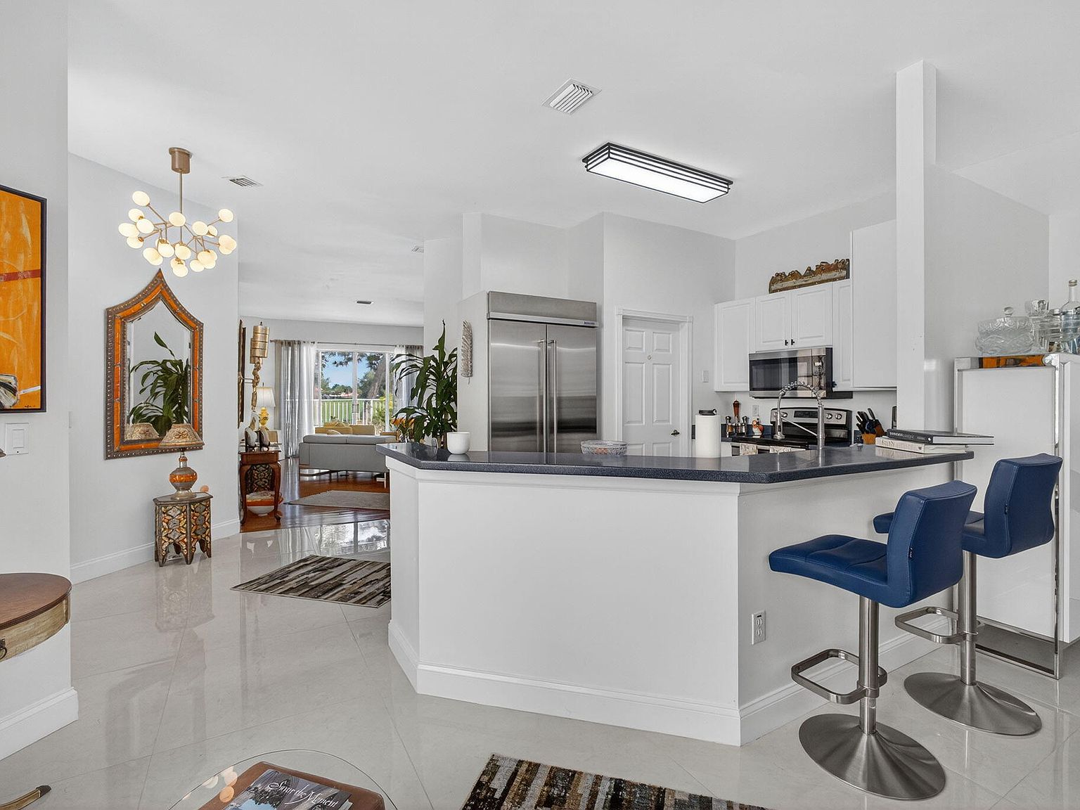Rarely available single-story courtyard home perfectly situated on a private golf course lot! Experience the best of South Florida living with this distinctive floor plan, where the heart of the home opens to a private courtyard and sparkling pool surrounded by lush tropical landscaping. Start your mornings with coffee overlooking the tranquil fairways or unwind poolside in total privacy. The main residence boasts 2 bedrooms and 2 bathrooms, filled with natural light and highlighted by wood and tile flooring (no carpet!) The open airy design seamlessly blends indoor comfort with picturesque golf course views, creating a home that is both inviting and unique. The kitchen has been tastefully updated with plenty of cabinetry, Corian countertops, and an oversized stainless steel Kitchen Aid refrigerator - ideal for everyday cooking or hosting family and friends. A cozy breakfast nook with bay window, light-filled dining area, and spacious living room with sliders to the outdoor patio make the home feel open and welcoming. The primary suite is a relaxing retreat with 2 closets, direct access to the pool and a large bathroom featuring dual vanities, a Roman tub and separate shower. A comfortable guest bedroom and updated bath with a frameless glass tile shower complete the main home's generous living space.