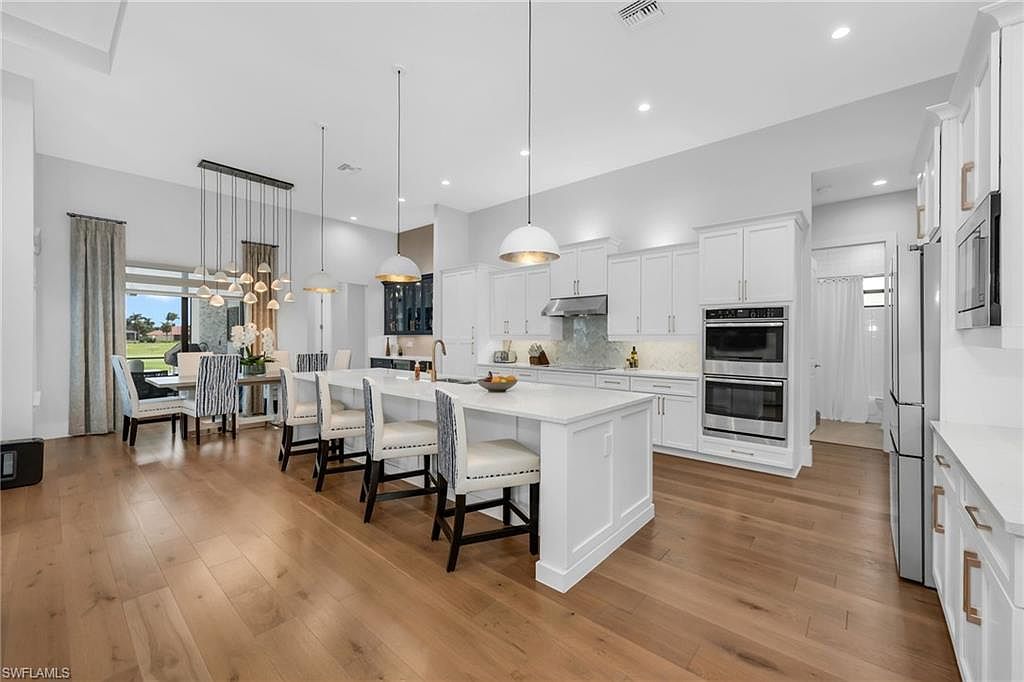 Located along the scenic Prince 3 fairway of the exclusive Cape Royal Golf Course, this elegant southern-exposure residence blends timeless design with modern comfort. Offering 3,000 sqft. of refined living space, the home features 4 bedrooms plus a den and 3 full baths, crafted with meticulous attention to detail throughout. The expansive 3-car garage with epoxy flooring, perfect for additional storage or a collector’s vehicle. Inside, soaring 12-foot ceilings, 8-inch baseboards, and a seamless mix of hardwood and porcelain tile flooring set the stage for an open, inviting interior. The kitchen serves as the heart of the home, designed for both culinary inspiration and effortless entertaining. Highlights include Bosch appliances, a 36" induction cooktop, convection double ovens, Cambria quartz countertops, and an oversized island that anchors the space. A hidden walk-in pantry provides abundant storage, while a chic beverage bar with glass-front cabinetry and wine fridge extends the kitchen’s entertaining appeal. The primary suite is a private sanctuary with direct access to the lanai, a spacious custom walk-in closet, and a spa-inspired bath featuring dual vanities, a separate makeup area, soaking tub, and a grand walk-through shower with dual shower heads. Step outside to an entertainer’s dream—an expansive pavered lanai overlooking the lush greens, complete with a heated saltwater pool and outdoor kitchen. Whether hosting guests or savoring a quiet sunset, the outdoor living space embodies the essence of Florida living. Cape Royal is a gated, luxury golf community offering championship fairways, super low HOA fees, and a serene atmosphere just minutes from Cape Coral’s best dining and amenities. Discover the perfect blend of sophistication, comfort, and resort-style living—your private showing awaits.