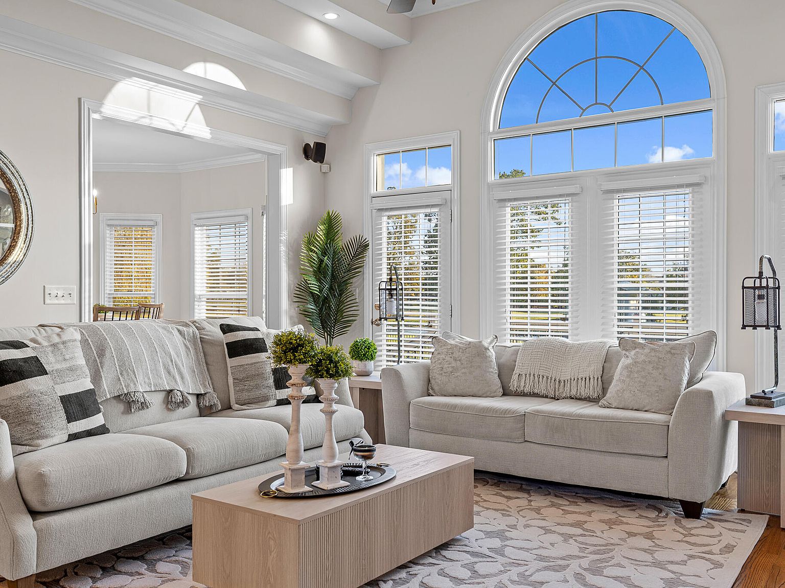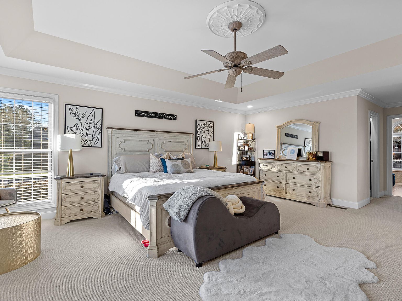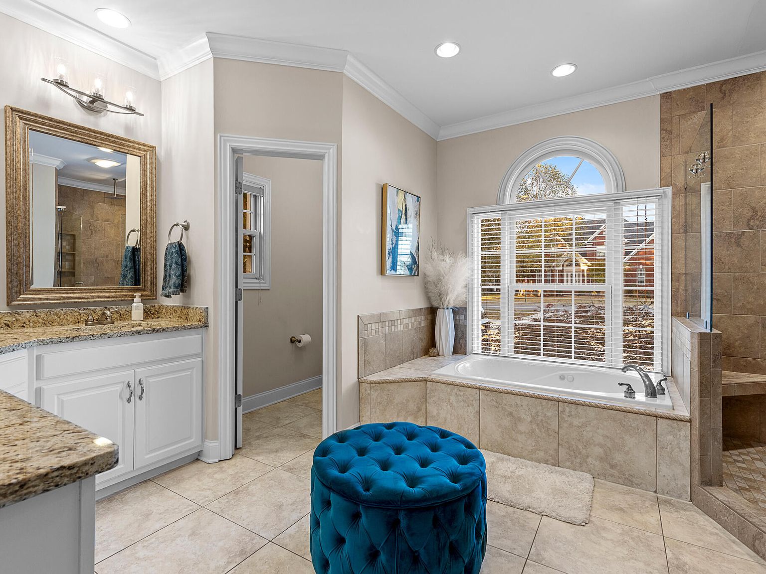 The main-level primary suite provides a private retreat with a jetted tub, tiled shower, and double vanities, while the upper level offers additional bedrooms, baths, and flexible living space for guests or recreation. Recent upgrades include a new tankless water heater, new upstairs HVAC, updated main-level lighting, and new quartz countertops.