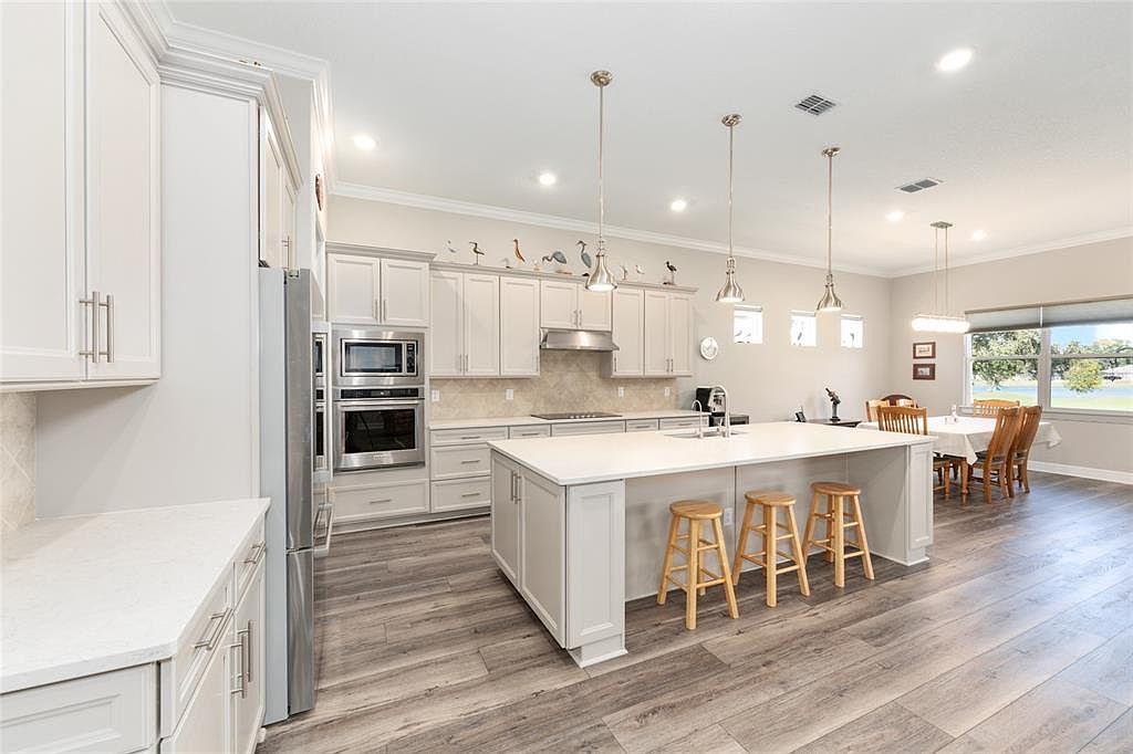 Live the Lifestyle You Deserve in this home with priceless golf course views and coveted water vistas in the gated 55-plus Stone Creek golf community with world-class amenities. This nearly new three-bedroom, three-bath Stellar model home includes a versatile flex room and elegant designer finishes throughout. Positioned on a premium lot overlooking the 14th green, this thoughtfully crafted residence offers comfort, beauty, and a lifestyle designed for relaxation and connection. From the moment you arrive, you’ll notice the lush landscaping, stacked stone curbing, paver-lined driveway, and charming Craftsman details. A sense of spaciousness greets you in the open-concept design, where lofty ceilings and soft natural light create an atmosphere of refined ease. Luxury vinyl plank flooring flows throughout, framing a versatile living space ideal for both quiet reflection and stylish entertaining while enjoying the scenic views. The gourmet kitchen features quartz countertops, soft-close cabinetry with pullouts, an upgraded stainless steel appliance package with a Bosch refrigerator, a sizeable walk-in pantry, and reverse osmosis water filtration. A large island flows into the spacious gathering room, where pocket glass sliders open to a screened lanai and paver patio perfect for enjoying Florida’s sunshine or hosting friends. The owner's suite is a true sanctuary, offering serene views, abundant natural light, a spacious walk-in closet, and a luxurious en suite bath. Pamper yourself in the spa-inspired bathroom, complete with a large, comfort-height double sink vanity and a tile-lined Roman-style walk-in shower with a transom window and seating ledge. Designed for versatility, the front guest bedroom with a bay window offers privacy with an en suite bath, while the second guest bedroom provides flexible space for a home office or hobby room. Additional comforts include a laundry room equipped with a laundry tub, cabinets for storage needs, and a folding area. A convenient catch-all mudroom leads to the three-car garage with epoxy-covered flooring, a dedicated EV charger, overhead storage, and ample space for a golf cart or workshop. This exceptional home is more than just a place to live; it’s a gateway to an active and engaging lifestyle featuring a 24/7 staffed gated entrance for security and peace of mind. Luxury-inspired amenities include heated pools, a state-of-the-art fitness center, a spa, and relaxing hot tubs and saunas. Stay active with pickleball, bocce, tennis, and a softball field, while a dedicated lifestyle staff curates entertainment, activities, and special events to foster connections. Just beyond the gates, enjoy a golf course, pro shop, and restaurant—perfect for socializing and unwinding. Whether you’re looking to relax, explore, or connect, this home is your gateway to it all.