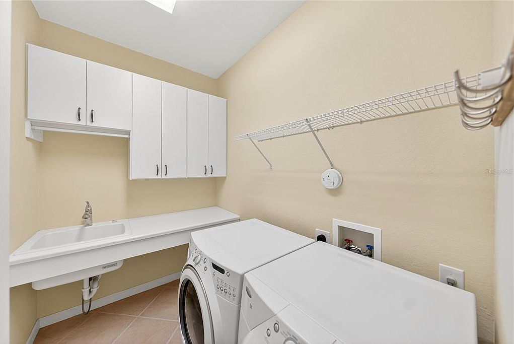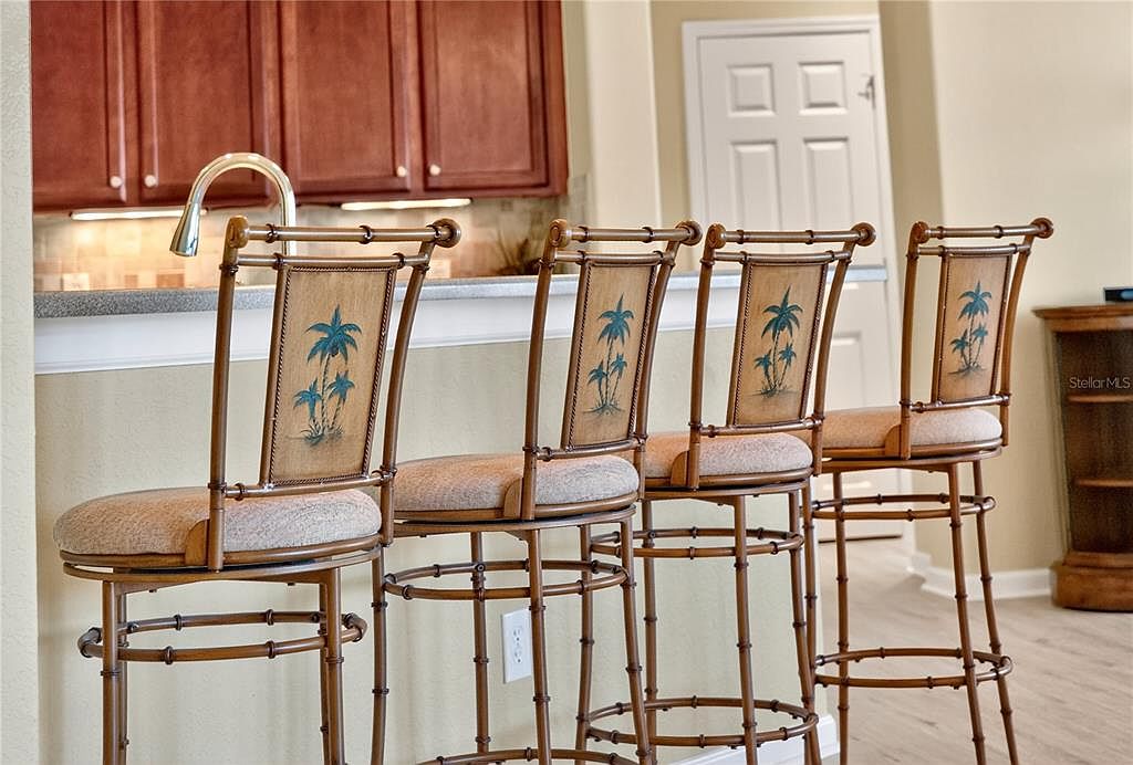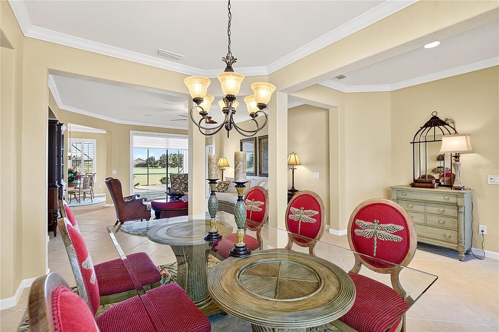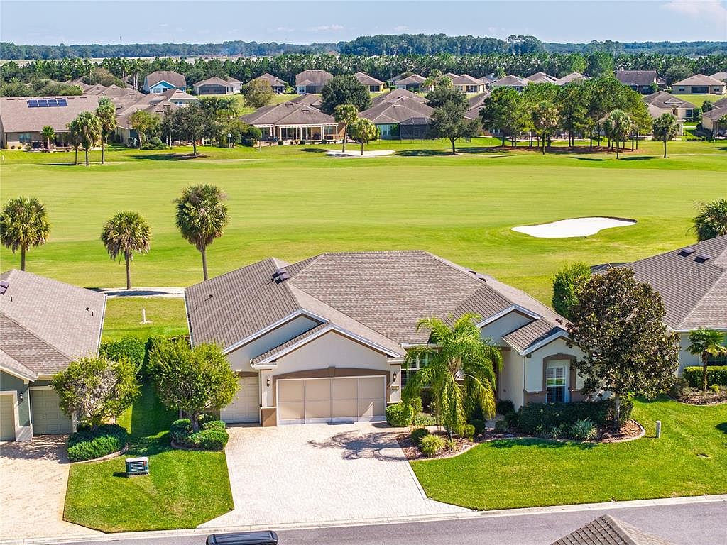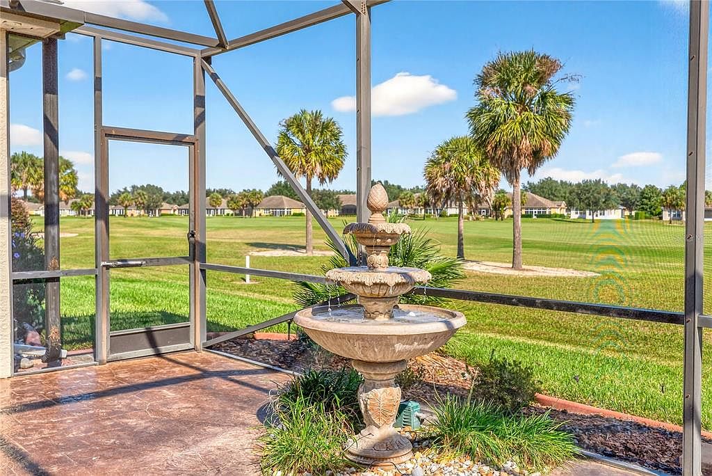 STUNNING GOLF COURSE VIEW! ONE OWNER! Experience the best 55 plus has to offer! This is a Del Webb Community! A lot of curb appeal with this home, pavers to the front door, mature landscaping and it wouldn't be Florida without a tall palm tree! This home is Priced UNDER the average cost, with over 2,400 Sq. Ft. 3 bedrooms, 2 bath situated on the premium panoramic golf view! Low HOA and lower taxes, ROOF 2022, HVAC 2018. Open floorplan with the great room bridged to the formal dining room and family room linked with the kitchen and cafe area. Kitchen is equipped with stainless steel appliances, stone counter tops, under cabinet lighting, pull out drawers and impressive backsplash blending it all together. There is also eating space for 4 at the kitchen bar. This home is great for entertaining and when you have family and friends come to visit. Paddle fans and plantation shutters throughout. Split floorplan provides privacy for all, larger guest rooms with mirrored closet doors. Primary suite has sliders for exclusive access to the extended lanai with birdcage style screening with pretty turtle shell concrete flooring. The master bath has custom walk-in closet and newly designed walk in shower, so much room! Enjoy year round sunrises with coffee in hand on the lanai and listening to the water fountain and evening lighting savoring that view! There are paddle fans through out, a 3 space garage, plenty of room for cars, golf cart and storage. The best thing about this home, is there is a view of the golf course from almost every room! Stone Creek community boast an 18-hole champion golf course, on property restaurant, indoor and out heated pools, fitness center, pickleball, bocce ball, tennis, basketball, softball field, horseshoes, indoor and outdoor spa with services, shuffleboard, state of the art billiards room, two clubhouses and numerous lakes and ponds that you can fish from. Many activities and groups and clubs to participate in. Not only is this a golf cart community, you can also golf cart to three different area plazas for grocery shopping, more restaurants, go to the doctor, dentist, get your nails done, a barber shop and much more all on a golf cart path provided. Shalom park is right down the road, enjoy over 40 acres of botanical beauty and the town square is right around the corner for weekend entertainment. Why wait to build when this home is move in ready! Make sure you catch the video tour! Schedule your visit today and experience the most affordable luxury community in the area.