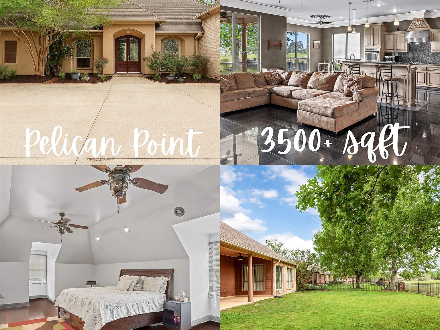 Welcome to your dream home nestled along the picturesque Pelican Point golf course. Step inside this stunning 5 bed, 3 bath, 3,503 living sq ft home and be greeted by soaring 10-ft ceilings adorned with triple crown molding. The gas fireplace offers a warm, elegant focal point for relaxing evenings. Open floor plan creates a perfect flow for both everyday living & entertaining, while large windows across the back of the home flood the space with natural light & showcase breathtaking golf course views. The gourmet kitchen is a chef's delight with elegant marble countertops, stainless-steel appliances, double ovens, & a gas stove. A spacious pantry provides abundant storage. Enjoy morning coffee in the breakfast area overlooking the greens. The primary bedroom offers a private office area, and a luxurious en-suite bath complete with granite counters, double vanity, separate granite shower, & a relaxing garden soaking tub. A spacious walk-in closet with custom built-ins completes this personal retreat. 4 additional bedrooms provide flexible space for family and guests. One guest bedroom features 2 closets, while two others share a convenient jack-and-jill bathroom with large walk-in closets of their own. Upstairs bedroom includes a large storage closet and could easily transform into a game room or home theater! Smart home technology allows convenient control of locks, lighting & air. Outside, entertain on the covered patio with tile flooring while enjoying the spacious fenced-in backyard. Spacious 3-car garage with dedicated bay for your boat or lawn gear—plus a utility sink for easy clean-ups. 3 HVAC units! Living in Pelican Point means access to a neighborhood pool, splash pad, playground, baseball field, and a clubhouse with a restaurant, bar, and golf simulation. Enjoy easy golf cart access to a variety of nearby businesses & stores. No Flood Insurance Required! Call to schedule your private showing today!