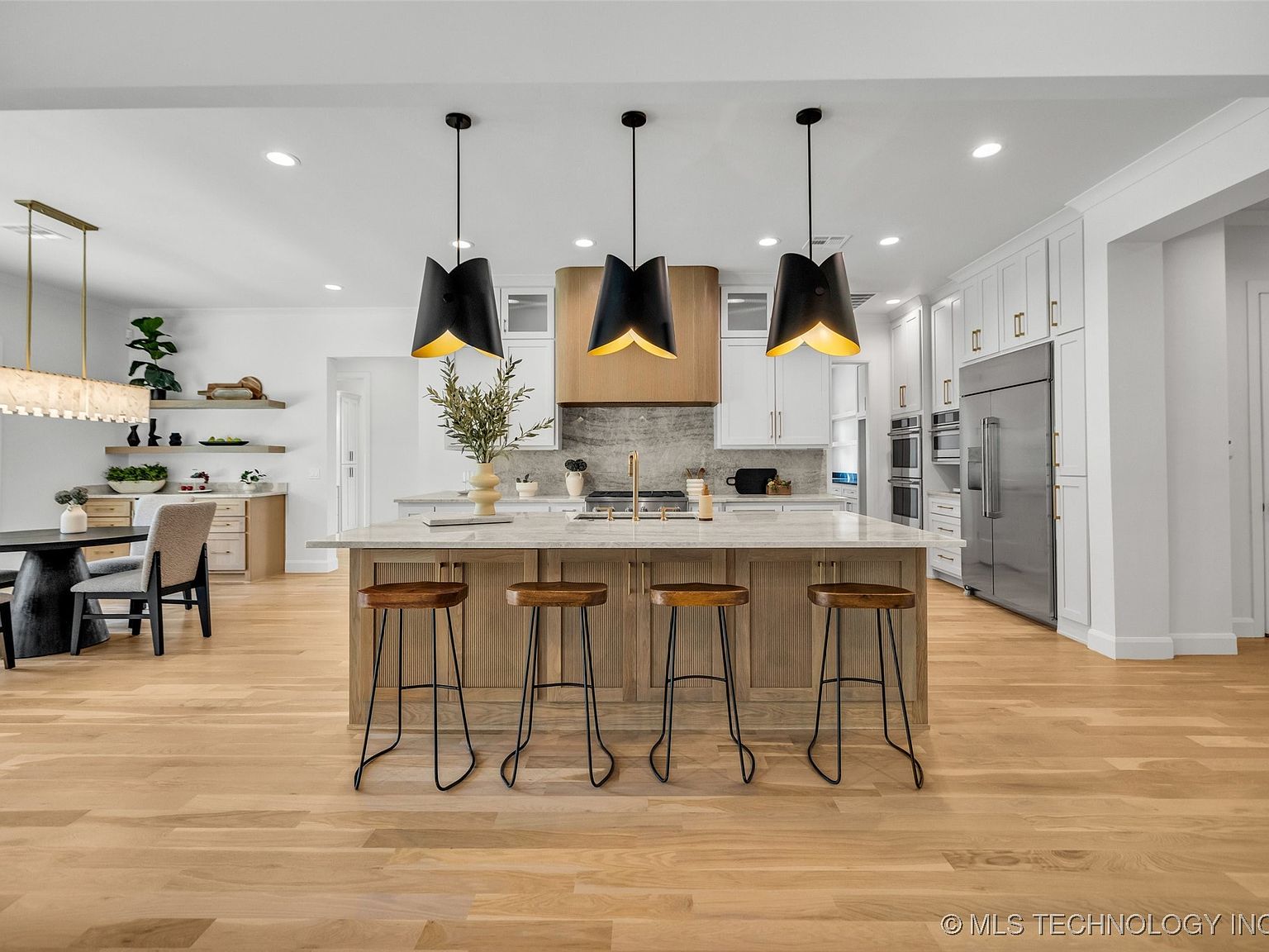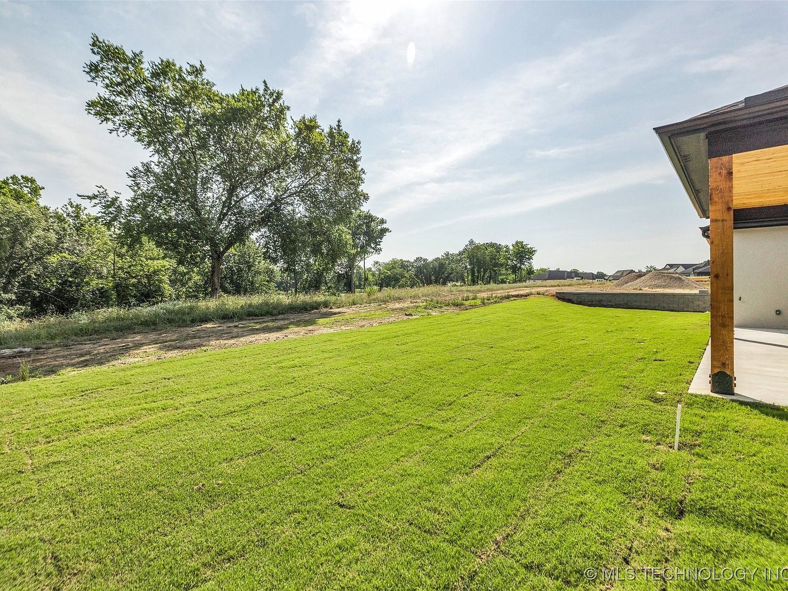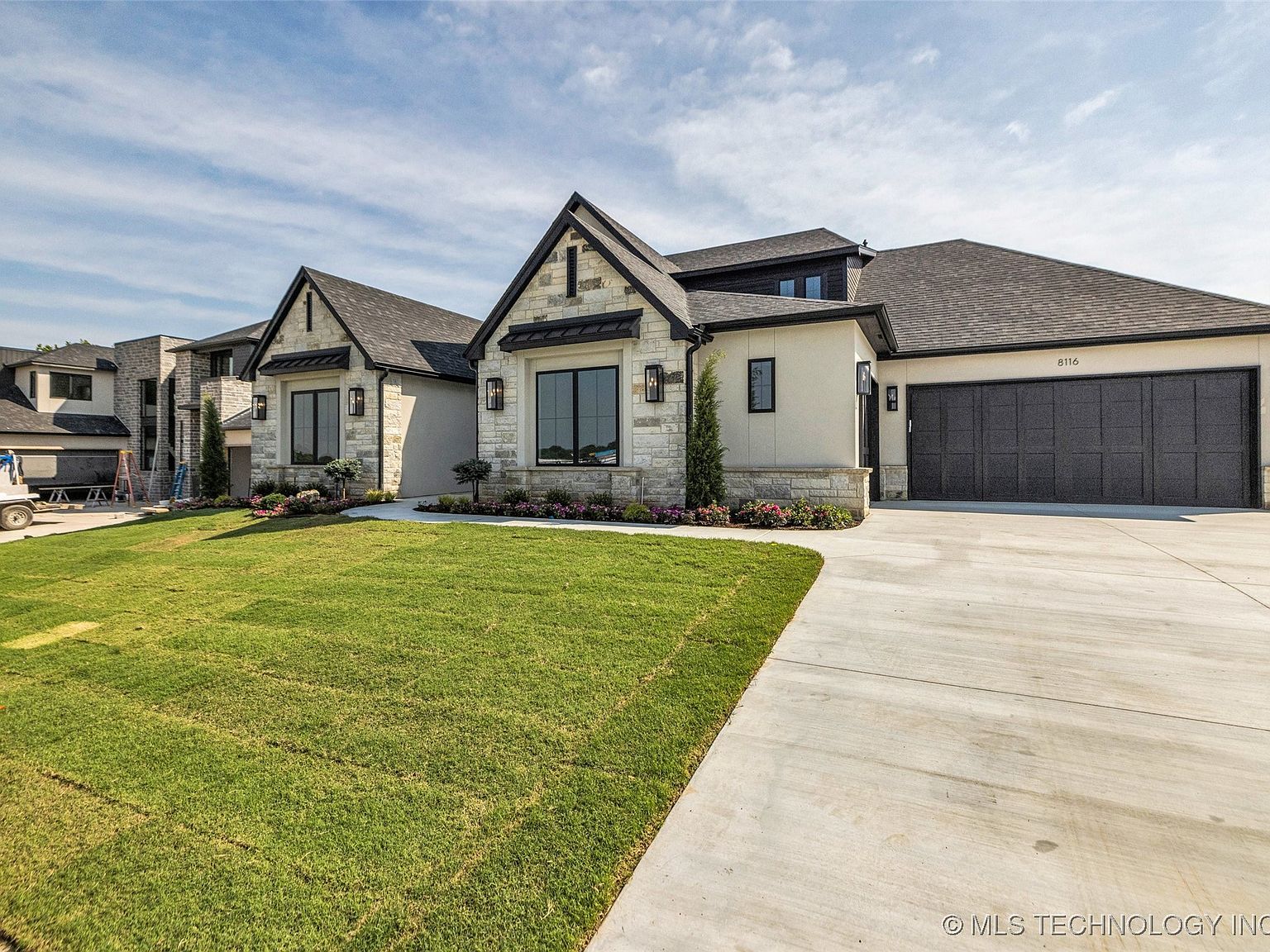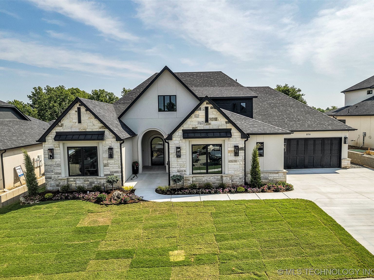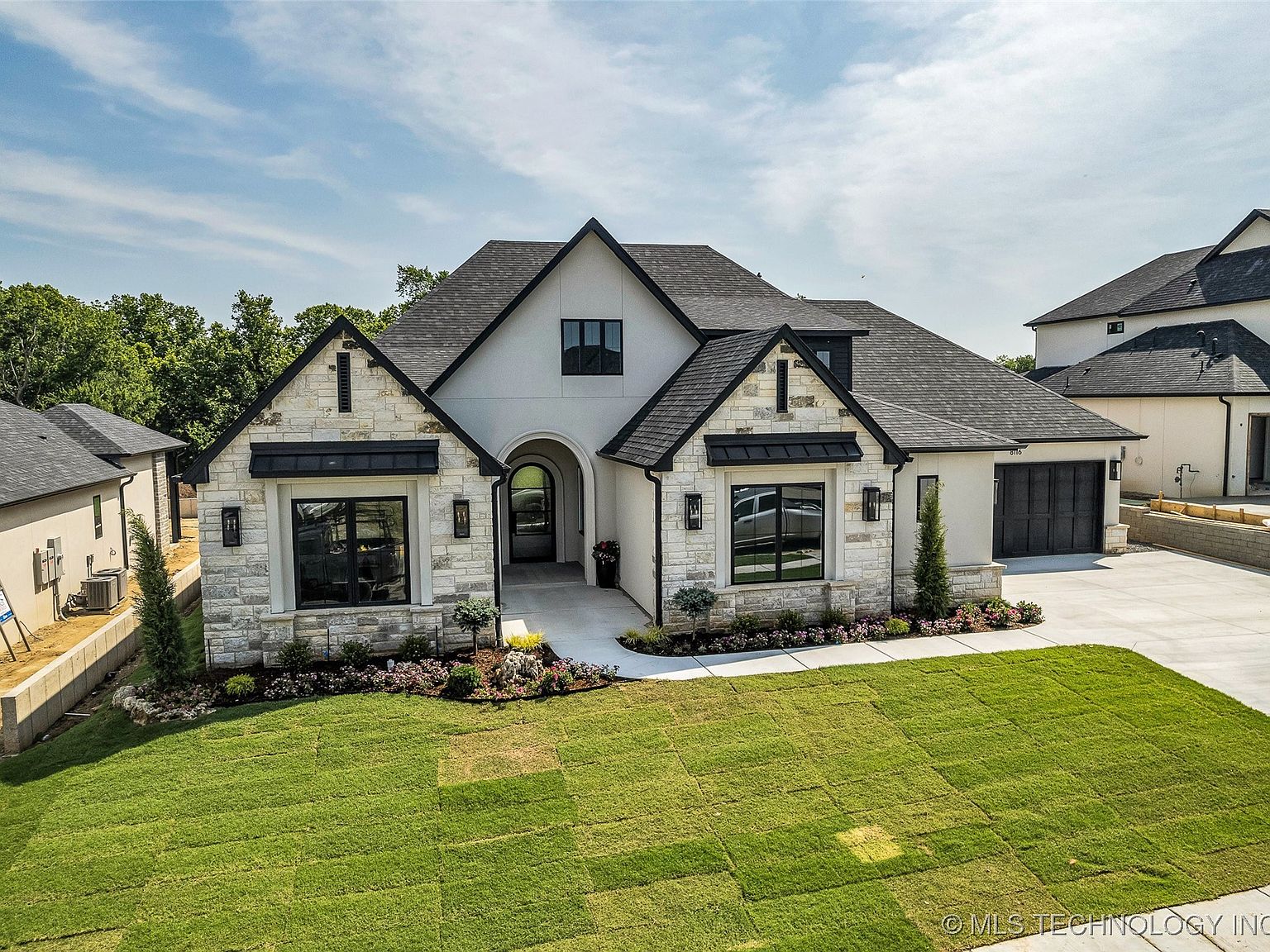 Brand-new golf-course living in Stone Bluff at Forest Ridge. On an 85’x135’ professionally landscaped lot backing the #8 tee box, this 3,779 SF home blends elevated finishes with everyday function: white-oak floors, custom white-oak cabinetry, designer accent walls with beam details, and professional lighting. The chef’s kitchen showcases GE Café appliances, an oversized island, and a true working pantry with sink and secondary refrigerator. Vaulted ceilings and expansive windows capture private course-side views. Flexible plan delivers 5 bedrooms / 4 baths plus spaces for office or media. Host year-round on the oversized covered patio with a second outdoor fireplace. Full spray-foam insulation and a large attic for storage. Minutes to the clubhouse, trails, and Broken Arrow conveniences. Curated for style, storage, and effortless entertaining. Seller is related to Realtor.
