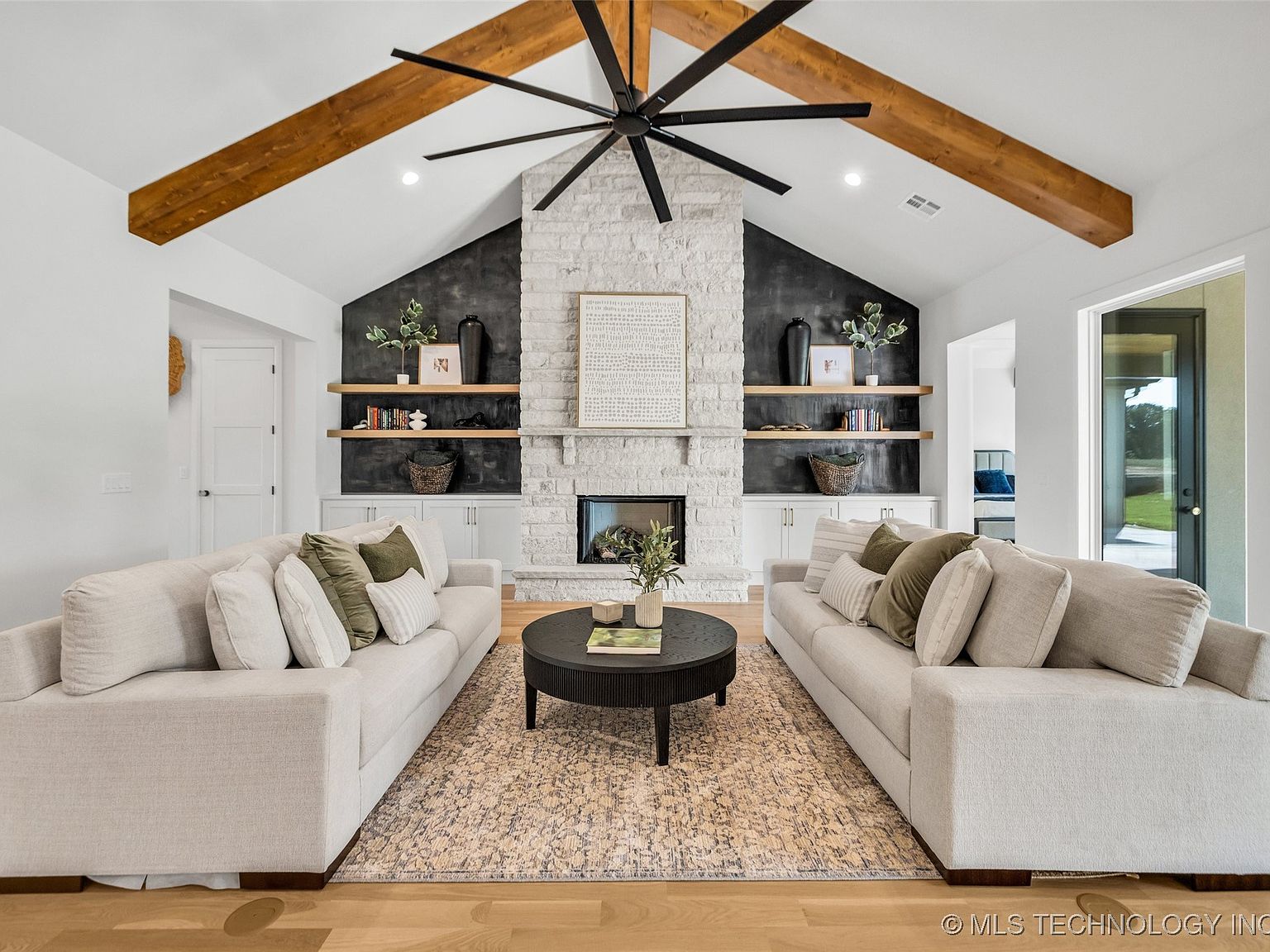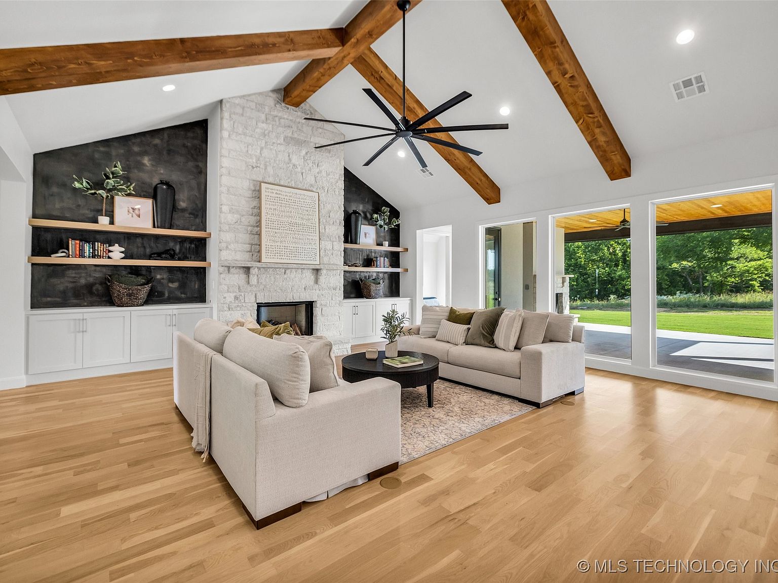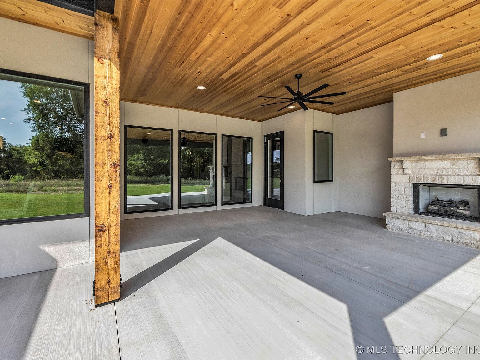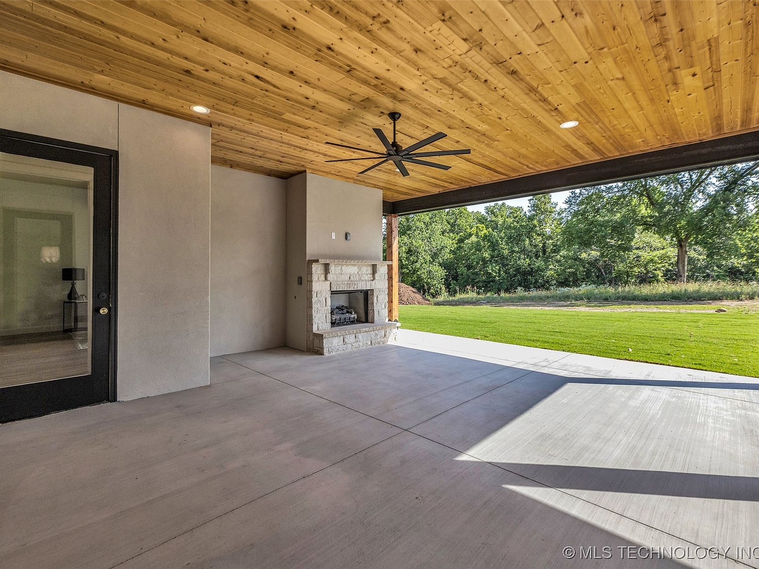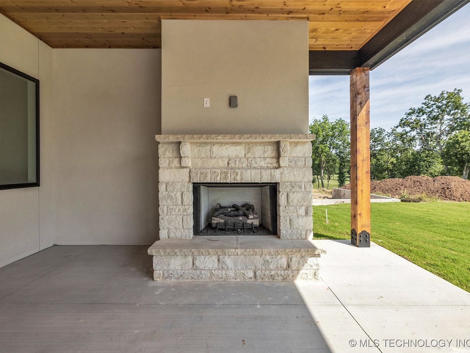 Brand-new golf-course living in Stone Bluff at Forest Ridge. On an 85’x135’ professionally landscaped lot backing the #8 tee box, this 3,779 SF home blends elevated finishes with everyday function: white-oak floors, custom white-oak cabinetry, designer accent walls with beam details, and professional lighting. The chef’s kitchen showcases GE Café appliances, an oversized island, and a true working pantry with sink and secondary refrigerator. Vaulted ceilings and expansive windows capture private course-side views. Flexible plan delivers 5 bedrooms / 4 baths plus spaces for office or media. Host year-round on the oversized covered patio with a second outdoor fireplace. Full spray-foam insulation and a large attic for storage. Minutes to the clubhouse, trails, and Broken Arrow conveniences. Curated for style, storage, and effortless entertaining. Seller is related to Realtor.