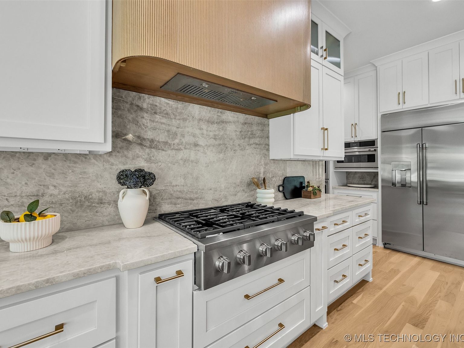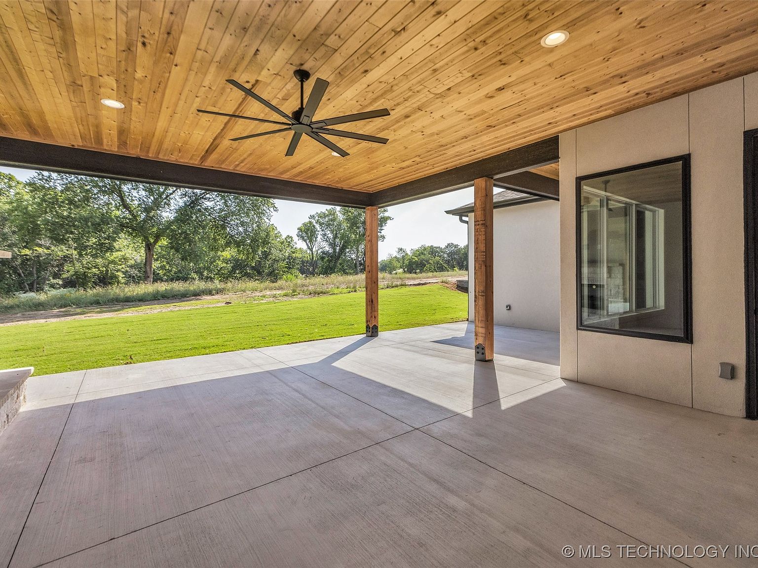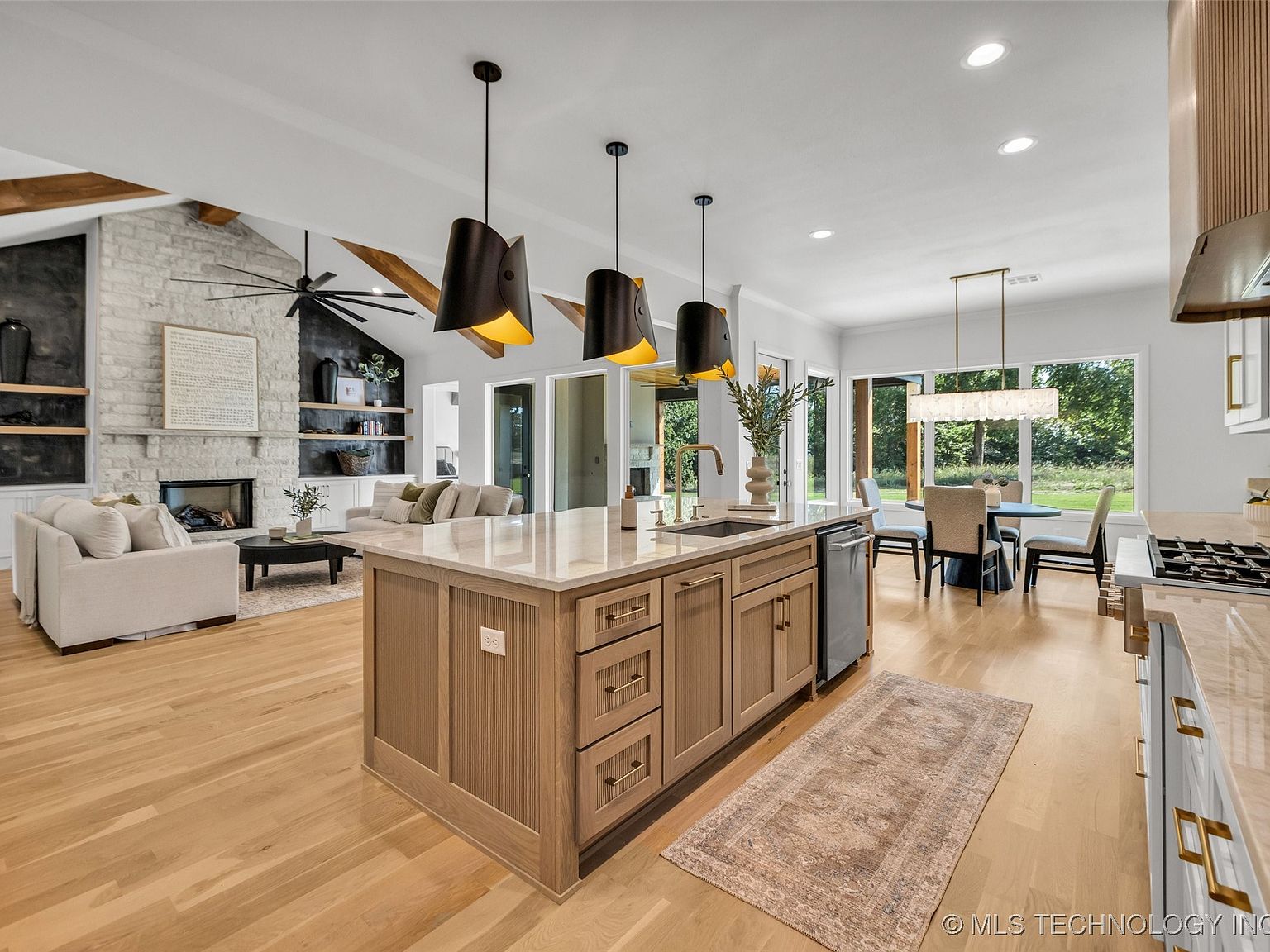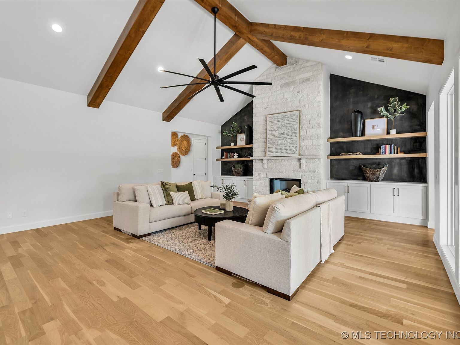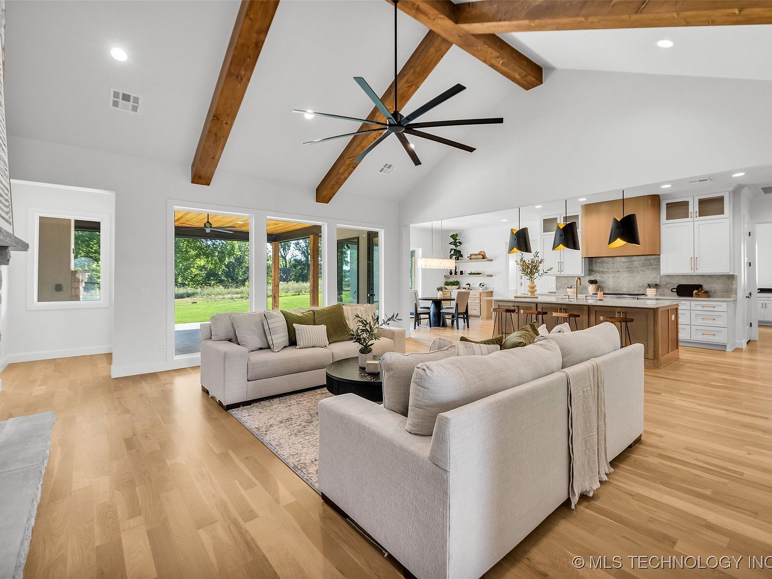 Brand-new golf-course living in Stone Bluff at Forest Ridge. On an 85’x135’ professionally landscaped lot backing the #8 tee box, this 3,779 SF home blends elevated finishes with everyday function: white-oak floors, custom white-oak cabinetry, designer accent walls with beam details, and professional lighting. The chef’s kitchen showcases GE Café appliances, an oversized island, and a true working pantry with sink and secondary refrigerator. Vaulted ceilings and expansive windows capture private course-side views. Flexible plan delivers 5 bedrooms / 4 baths plus spaces for office or media. Host year-round on the oversized covered patio with a second outdoor fireplace. Full spray-foam insulation and a large attic for storage. Minutes to the clubhouse, trails, and Broken Arrow conveniences. Curated for style, storage, and effortless entertaining. Seller is related to Realtor.